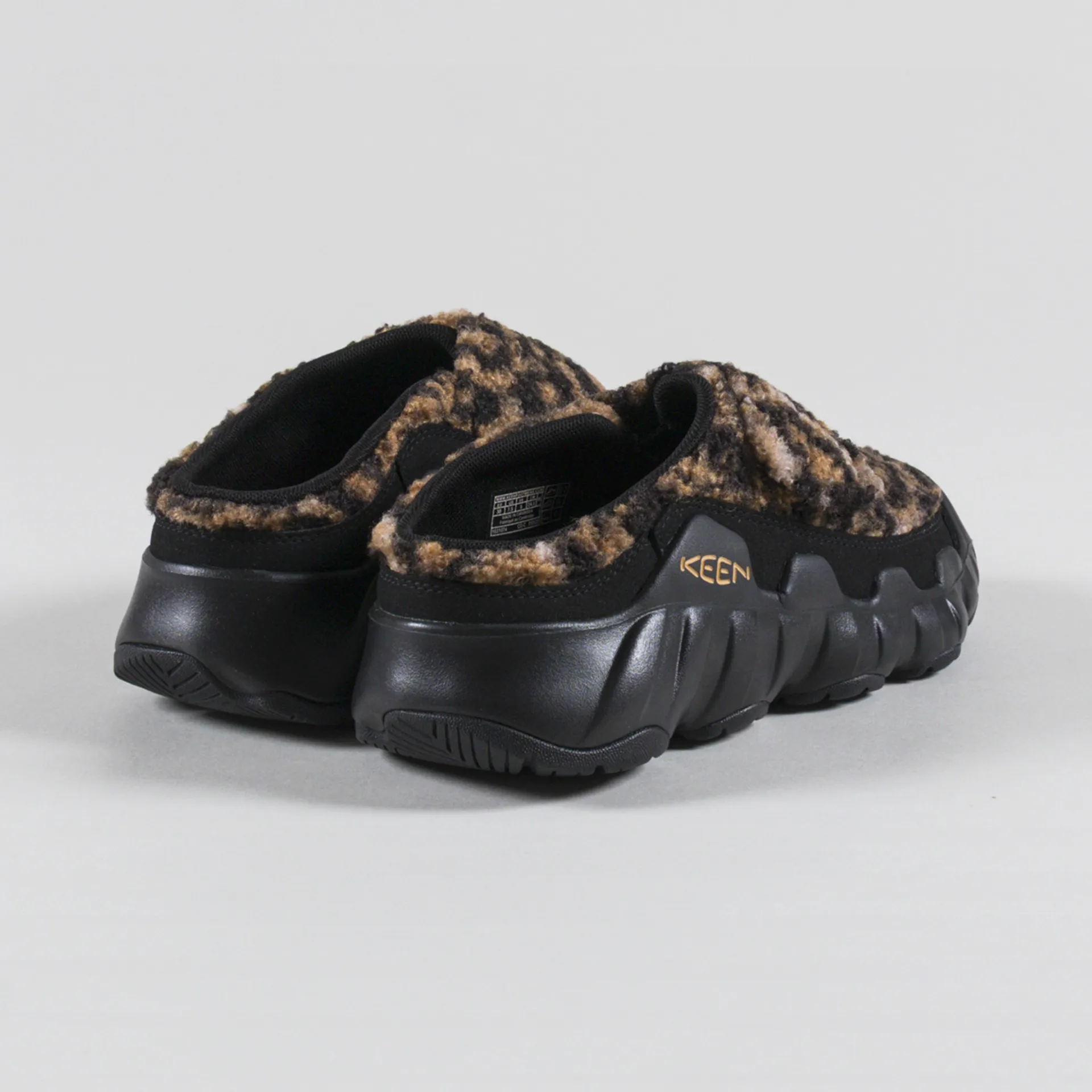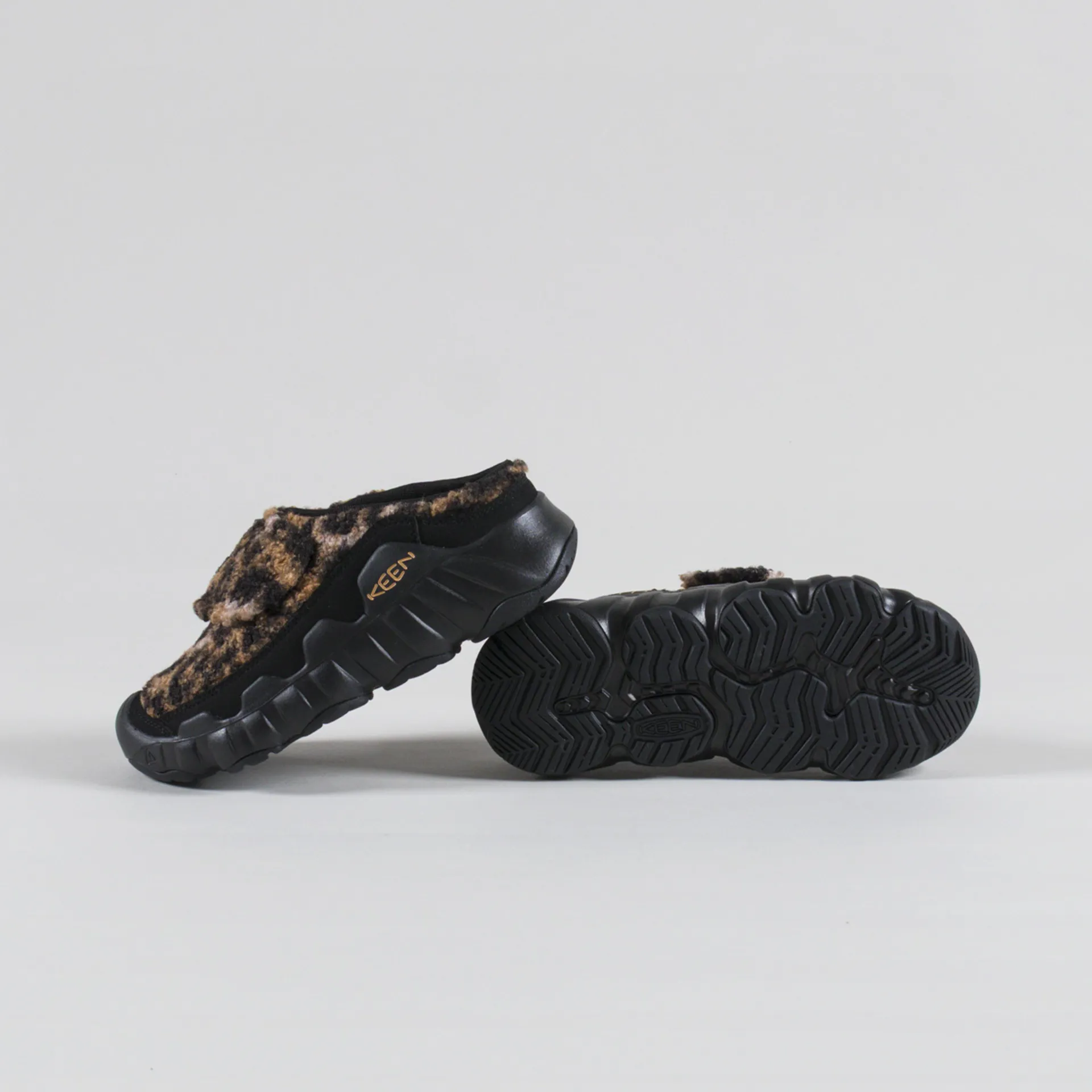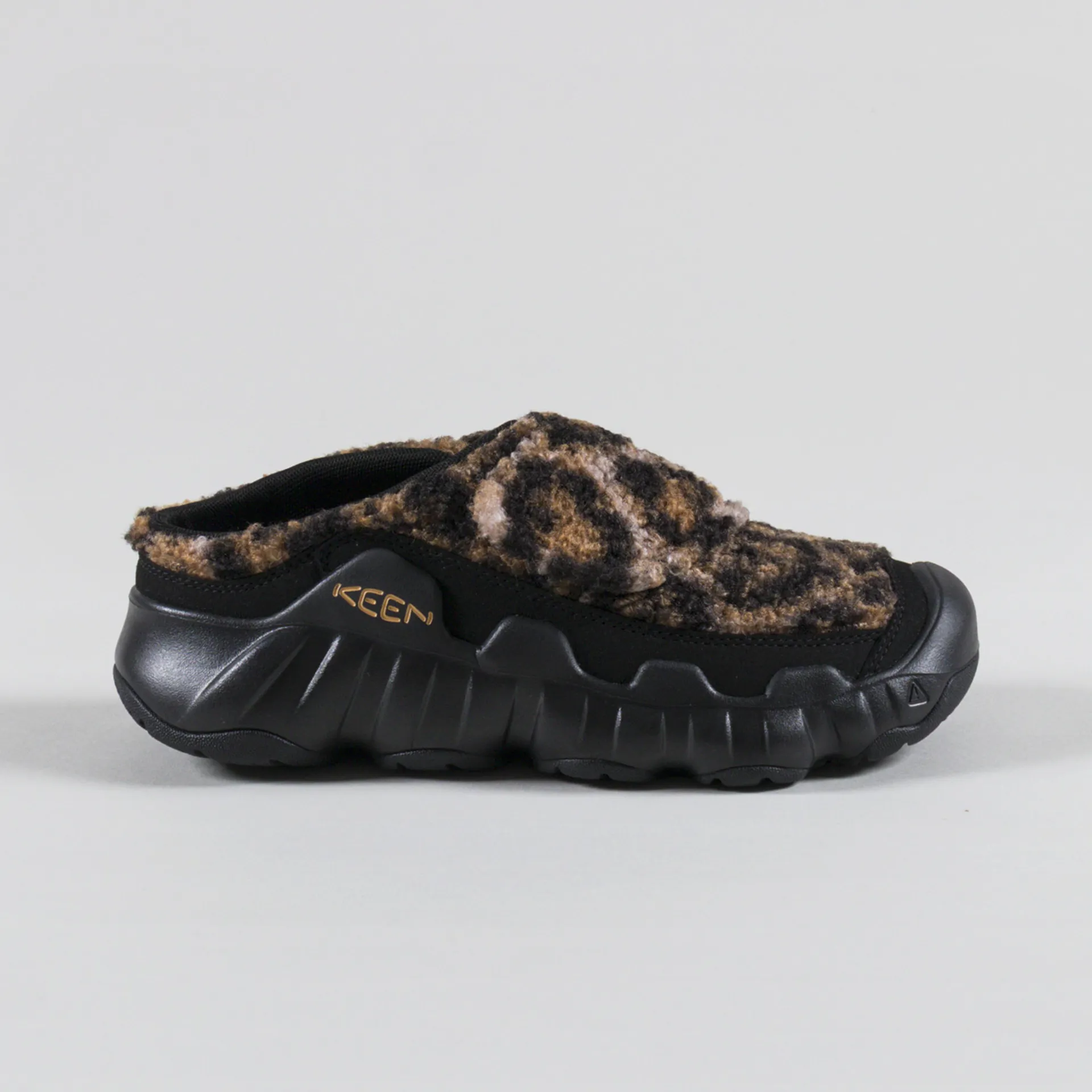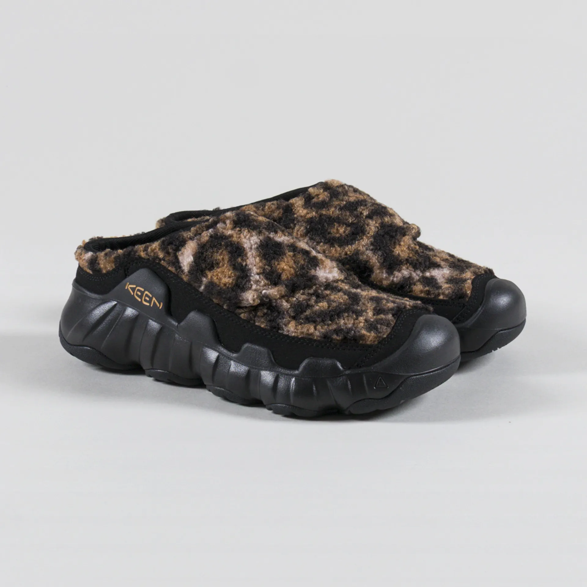 A pair of slip-on shoes from Keen, designed with maximum cushioning for a super comfortable wear. They feature Keens 'Original Fit' - boasting generous space across the forefoot for toes to splay. With leopard print fleece uppers, a single velcro strap for ease of use, a high traction rubber outsole and KEEN.PROTECT toe bumpers. They also have a removable, resilient foam insole, a breathable mesh lining and Eco Anti-Odor for natural, pesticide-free odour control. Finished off with a simple tonal logo to the midsole.