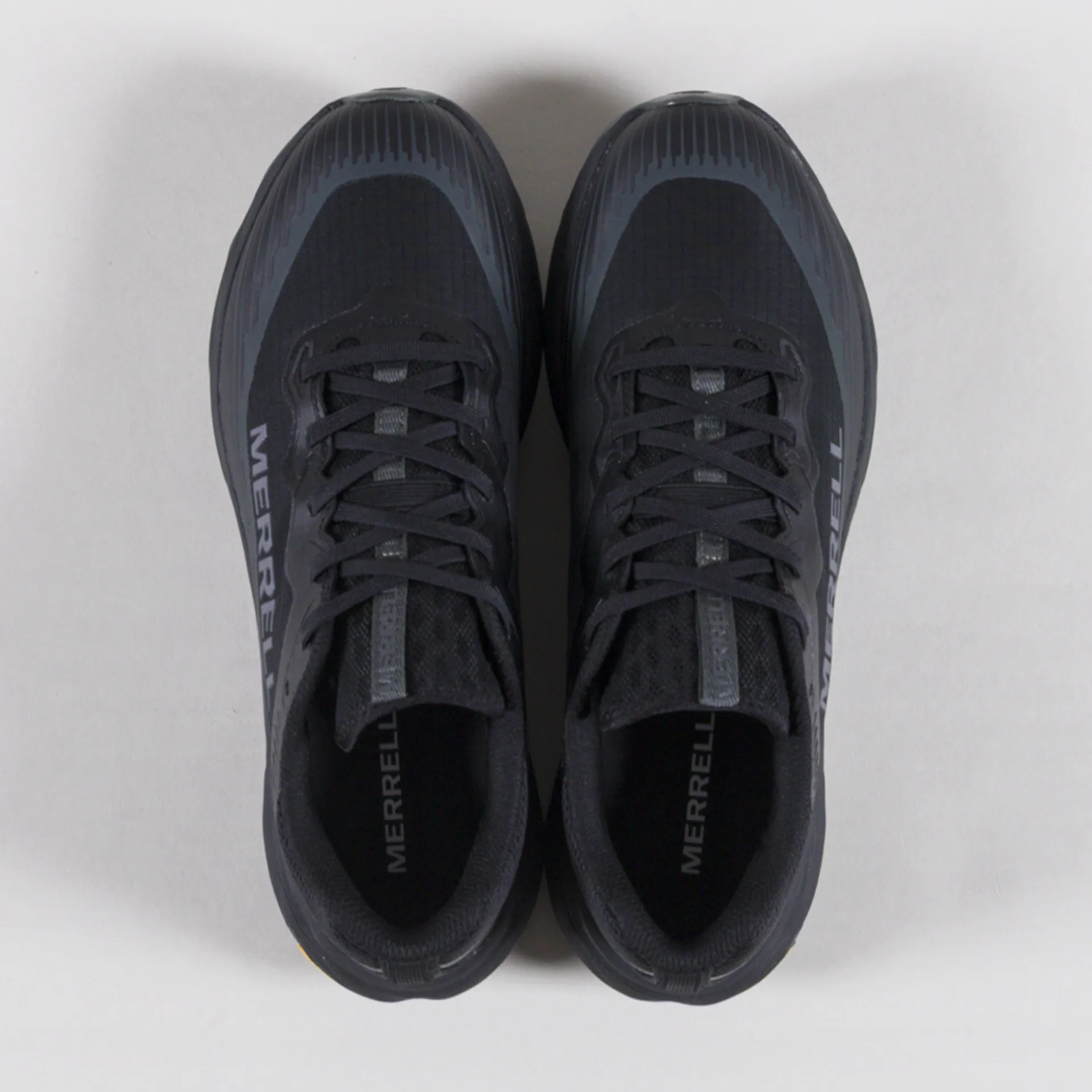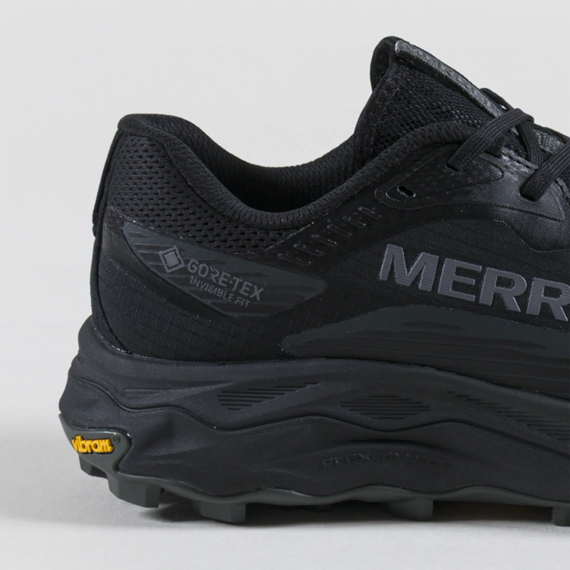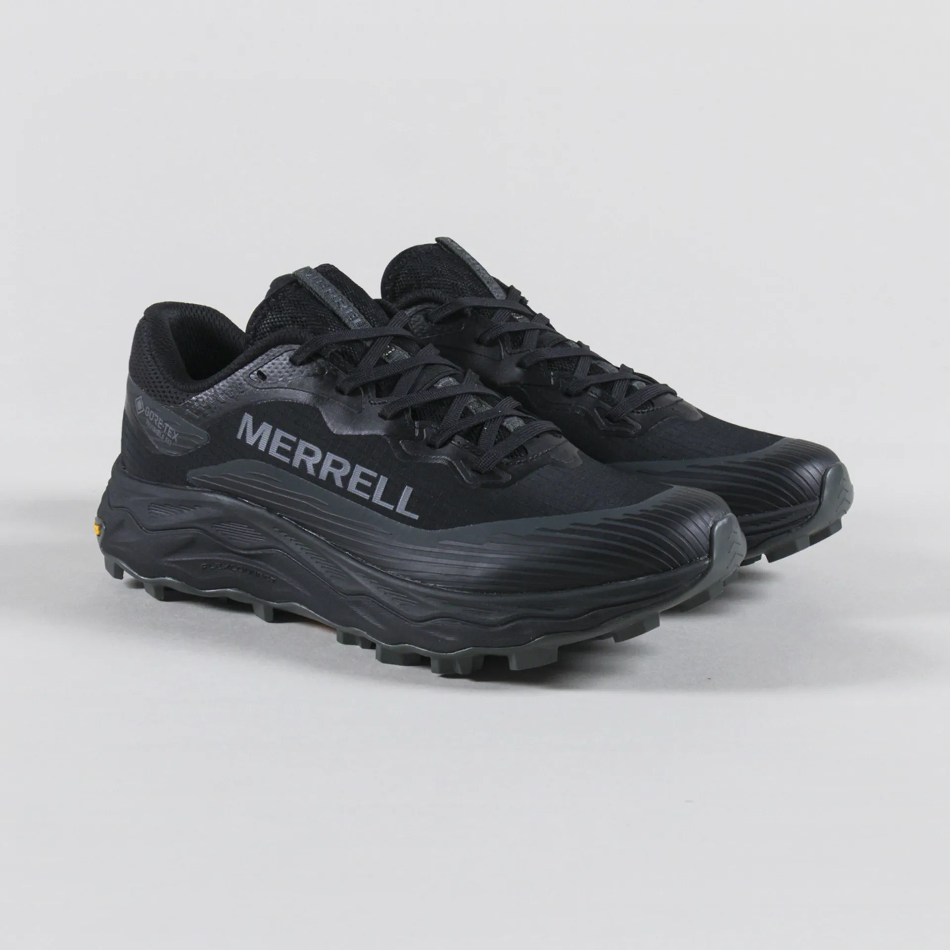 A pair of lightweight trail runners from Merrell, constructed with a GORE-TEX waterproof membrane with bonded Invisible Fit construction for breathable protection in wet conditions.