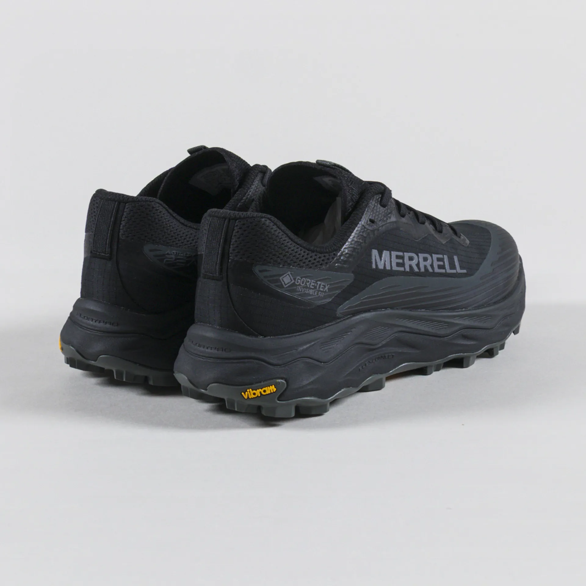 A pair of lightweight trail runners from Merrell, constructed with a GORE-TEX waterproof membrane with bonded Invisible Fit construction for breathable protection in wet conditions. They have a FloatPro foam midsole, delivering a good amount of energy return, with a Vibram Megagrip high-performance rubber outsole for reliable grip on wet or dry surfaces. The Vibram traction lugs are specifically designed to increase traction and shed debris, while the lightweight and impact-resistant underfoot rock plate shield delivers flexible defence against sharp, uneven terrain. With FLEXconnect dual-directional flex-groves in the midsole to enhance ground connection.