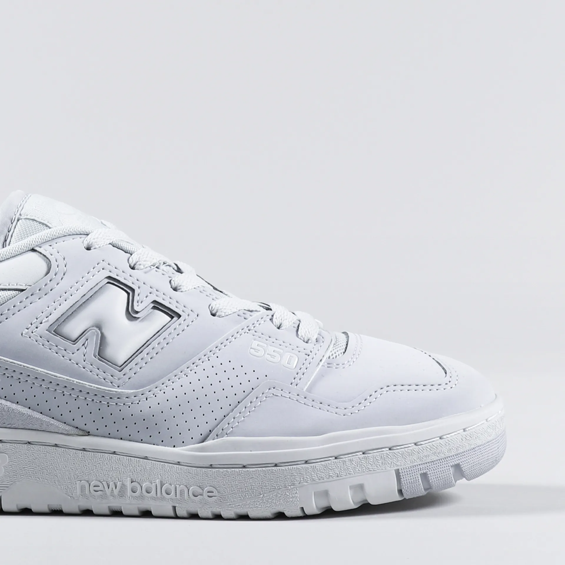 A pair of trainers from New Balance, made from a durable upper of full leather nubuck with a padded mesh collar, heel and lining, a large rubber outsole with a court-style tread, and N logos to the sides, along with a large tongue patch.
