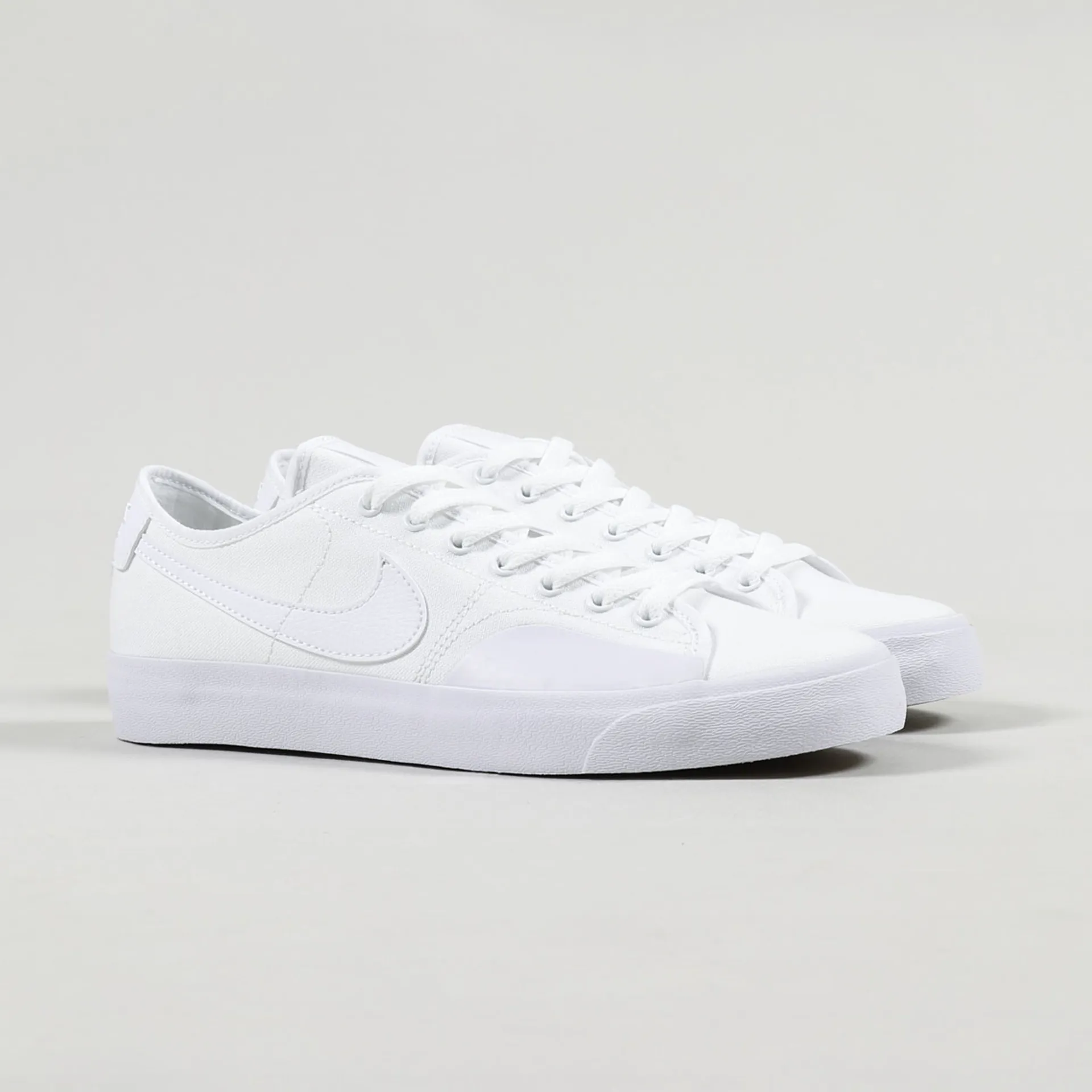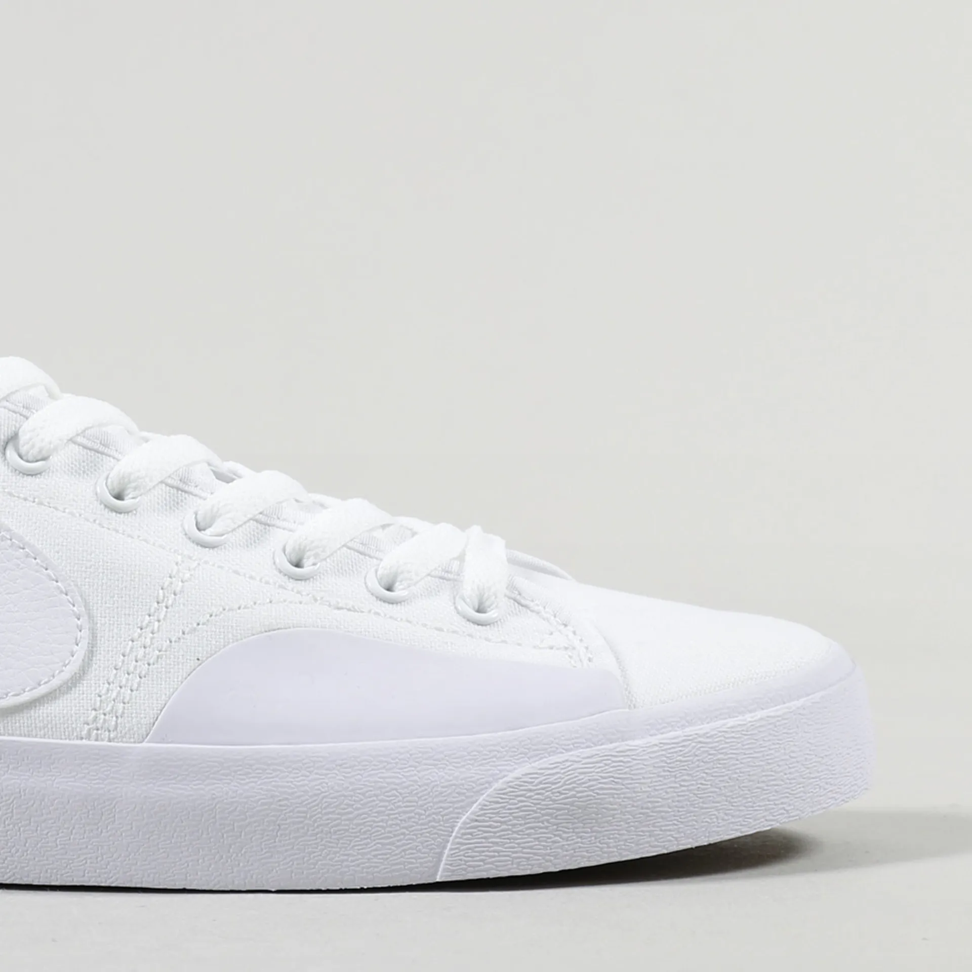 A pair of trainers from Nike SB made from an upper of canvas with a vulcanised rubber outsole featuring an overlay to the outer toe. The upper has ollie reinforcements in the toe and it has a grippy herringbone tread.