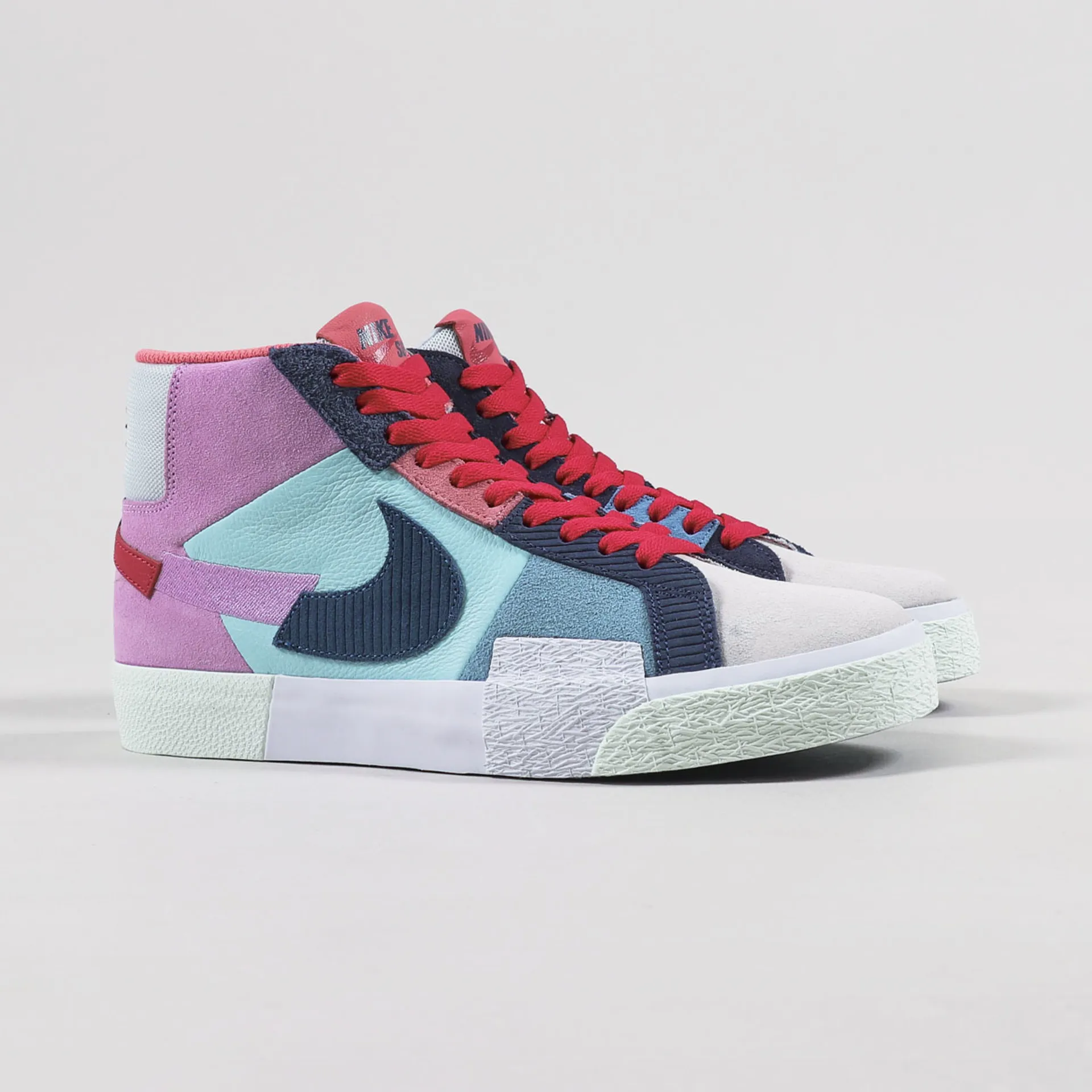 A pair of trainers from Nike SB, this version of the Blazer Mid is made from a patchwork upper of leather, suede, mesh and embroidery with a padded lining, Zoom Air sole unit and a vulcanised rubber outsole with a herringbone tread.