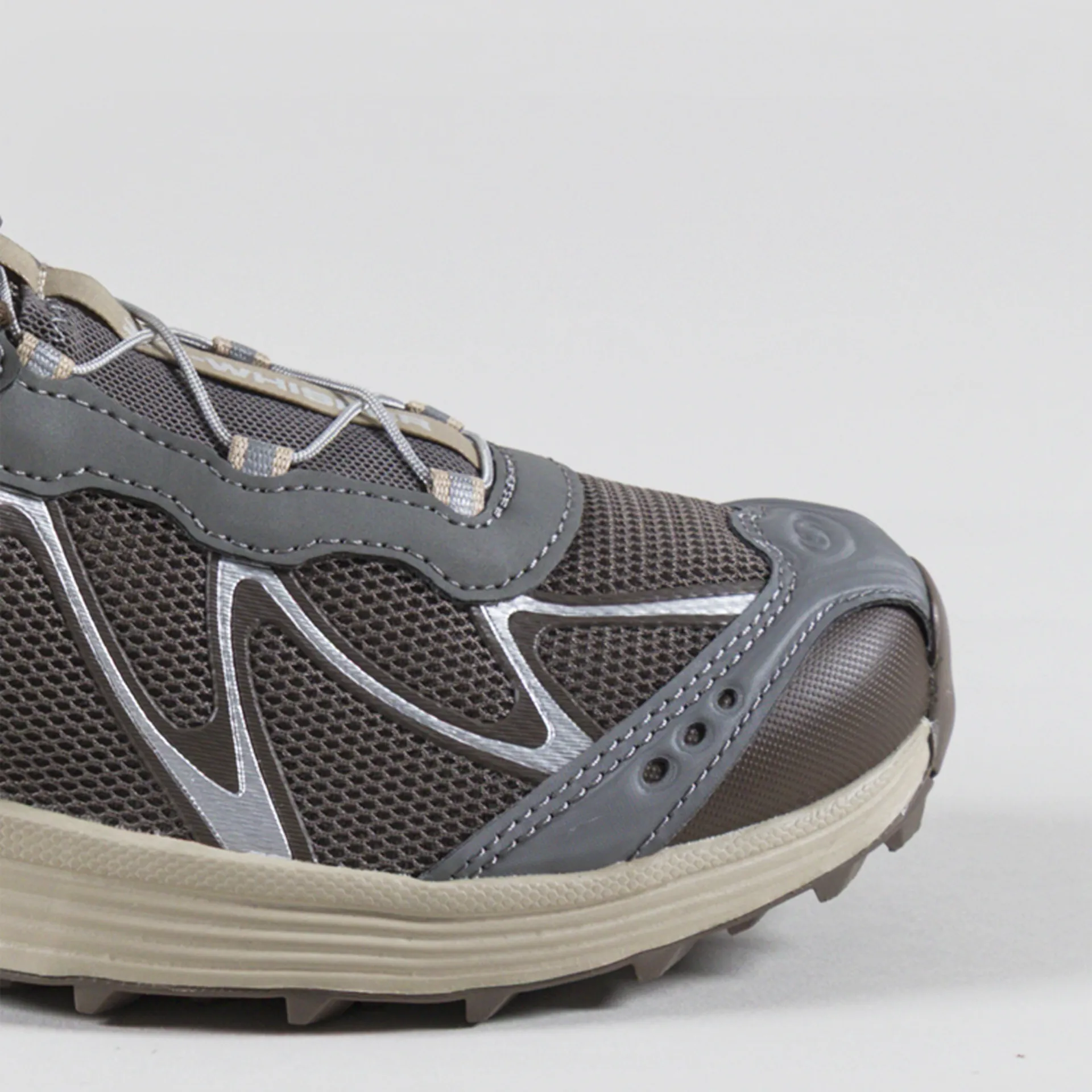 The XT-Whisper Shoe from Salomon, heir to an XT design lineage with a play on mat and shiny finishes, with visual contrasts, material depth and textured layers. Featuring a mix of 3D mesh, anti-debris mesh and synthetic uppers, a lace pocket to store the Quicklace system, with Sensifit that cradles the foot from the midsole to the lacing system - providing a secure, customized fit all around the foot. With an Agile Chassis System that provides stability and dampening.