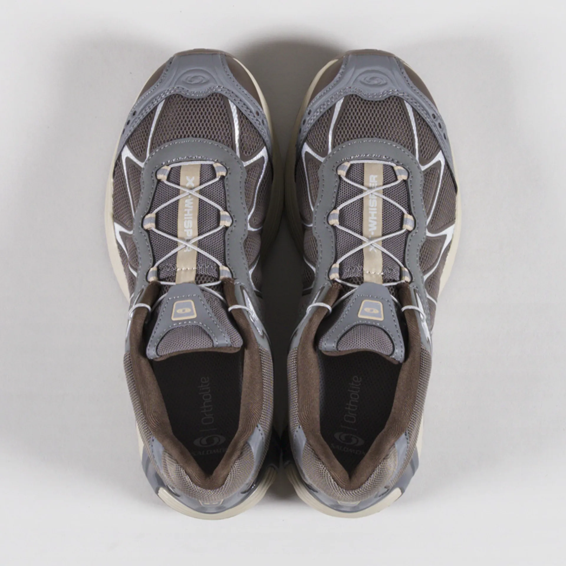 The XT-Whisper Shoe from Salomon, heir to an XT design lineage with a play on mat and shiny finishes, with visual contrasts, material depth and textured layers.
