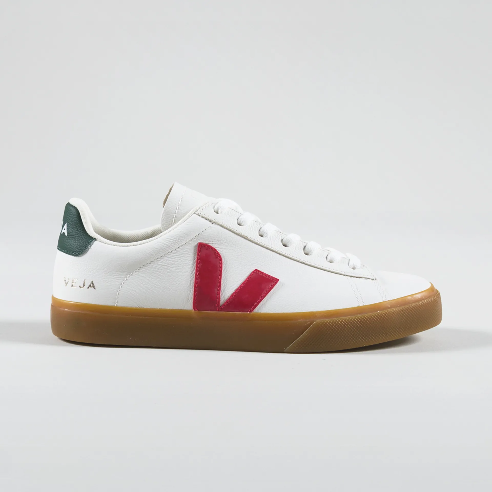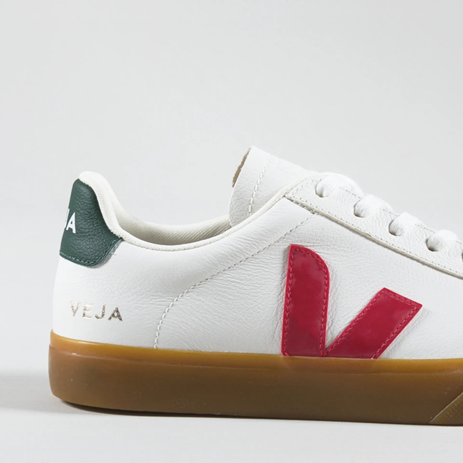 A pair of sneakers from Veja made from ChromeFree Leather with suede to the heel and sides. The Campo silhouette also has loads of printed branding.