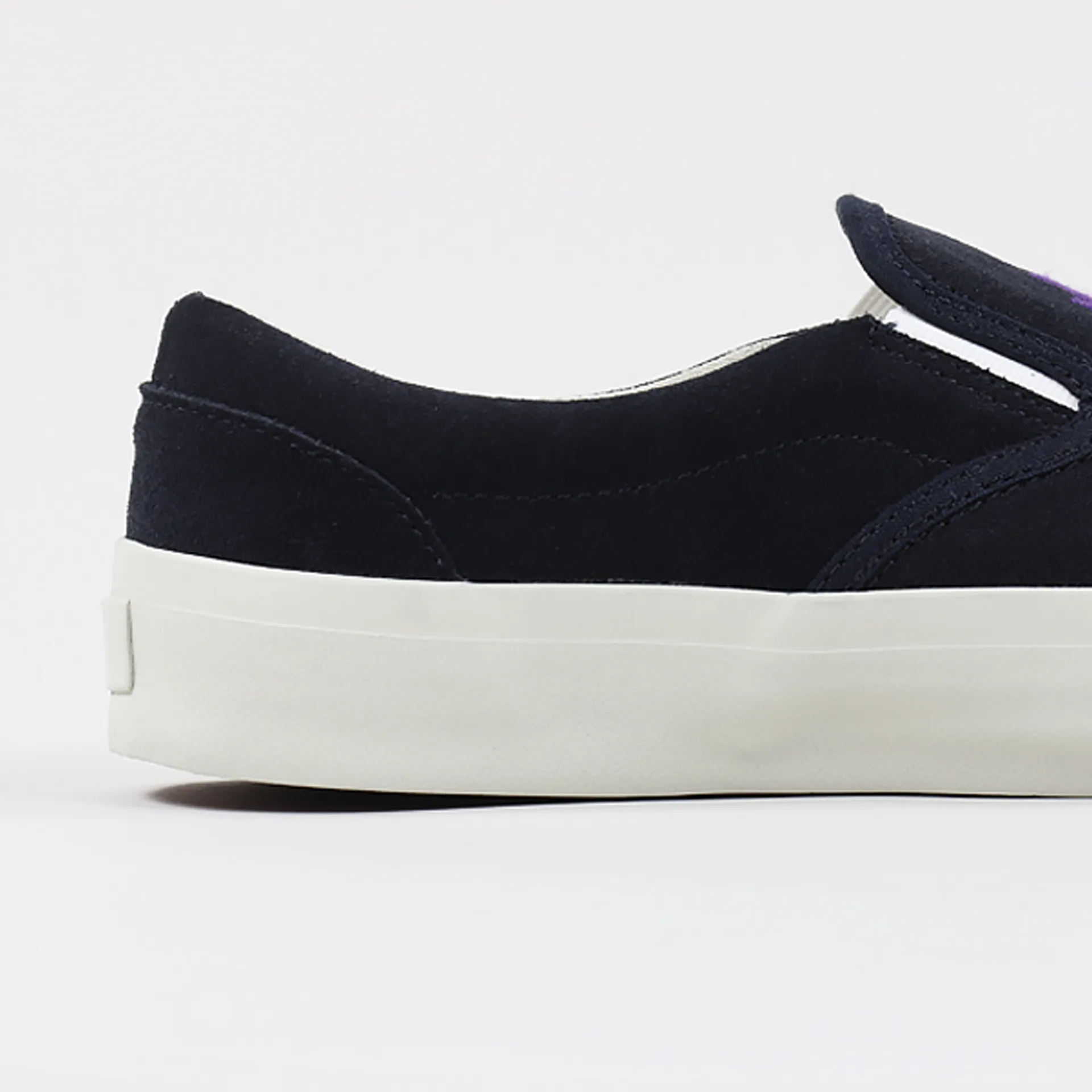A pair of trainers from YMC made from a tough suede, backed by a comfy canvas lining, sitting on a rubber outsole with a slip-on design and a woven Ikat design to the top.