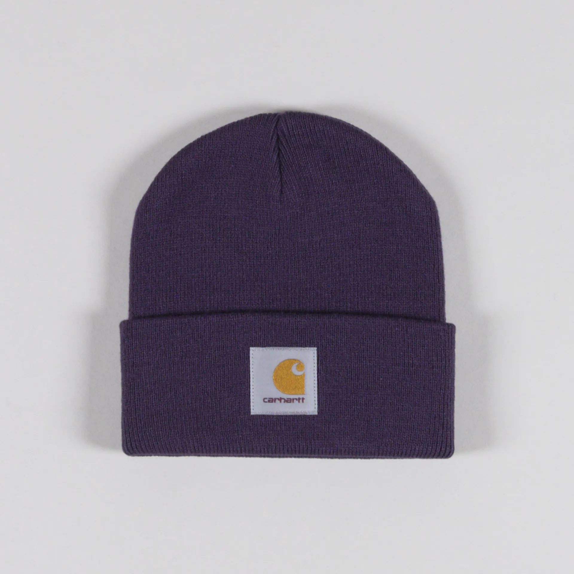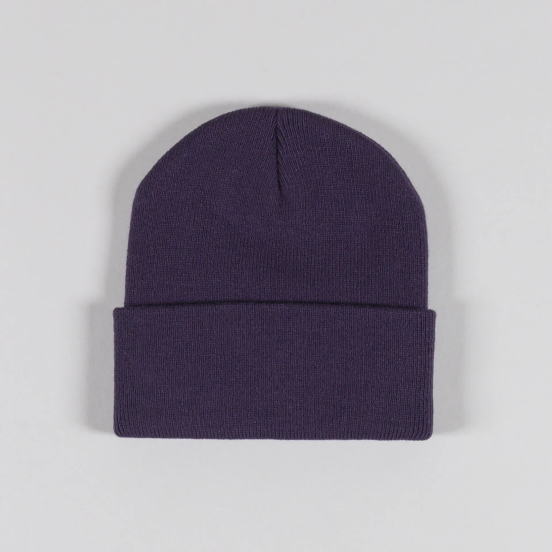 A beanie from Carhartt WIP made from a comfortable 100% acrylic ribbed knit with a turned cuff and a woven logo patch. This version is a little more low-profile.