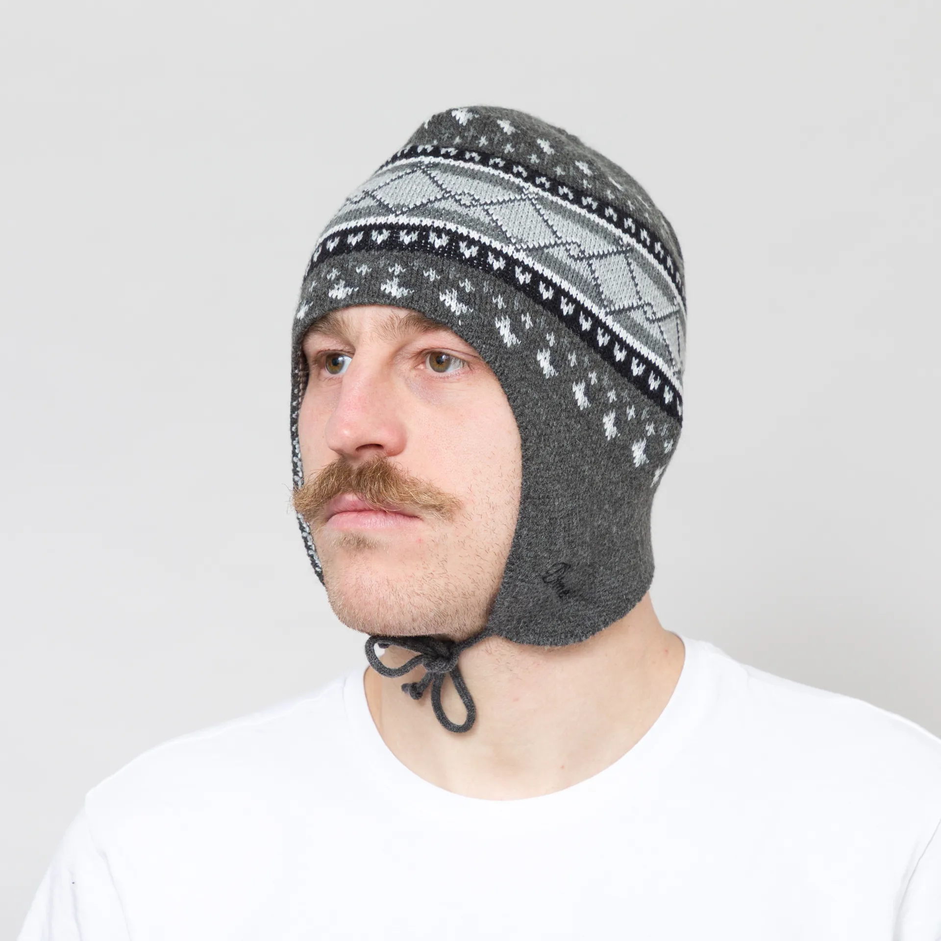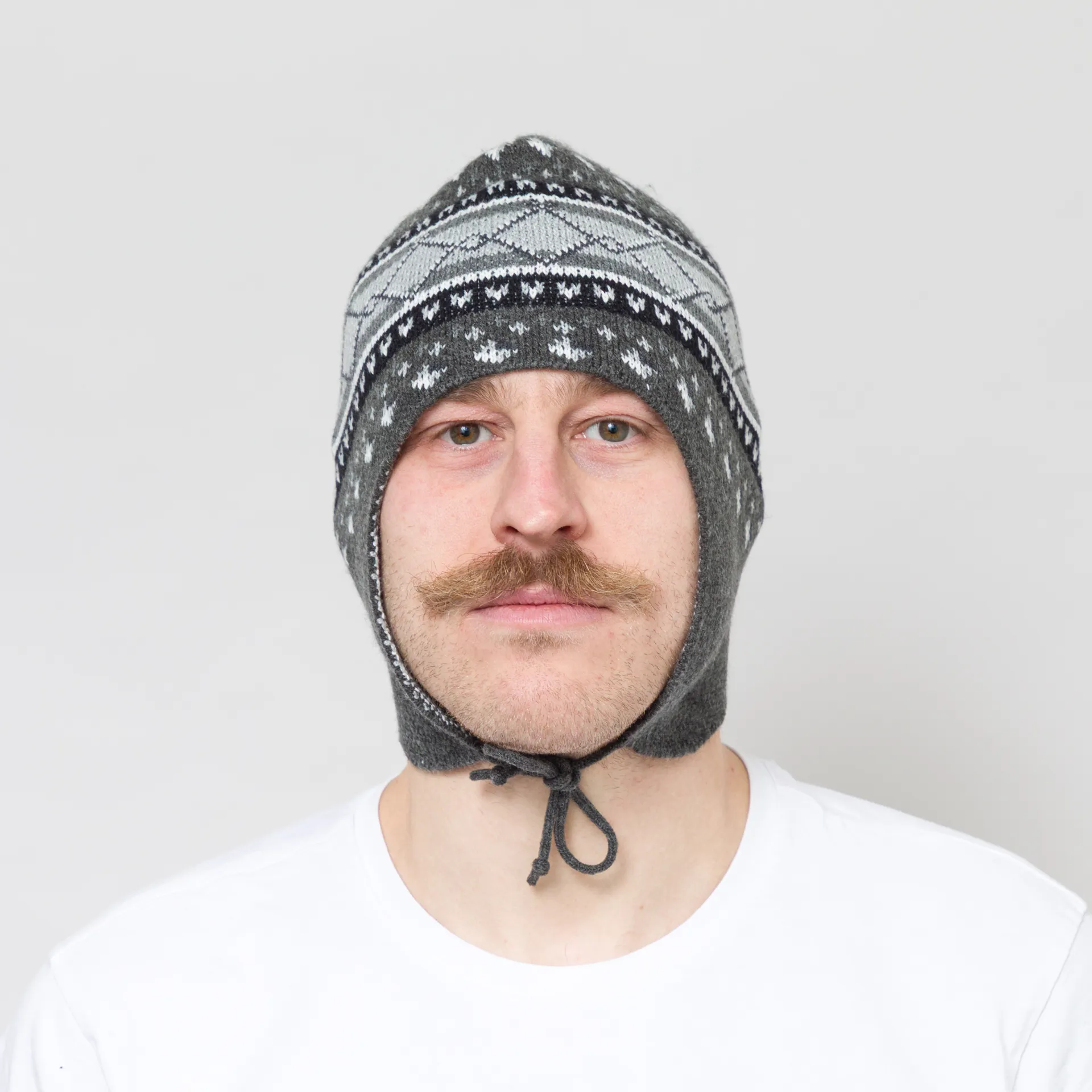 A knitted beanie from Dime, constructed from soft medium gauge knitted cotton. With a woven chain-link pattern, cords at the earflaps and a small embroidered Dime logo.