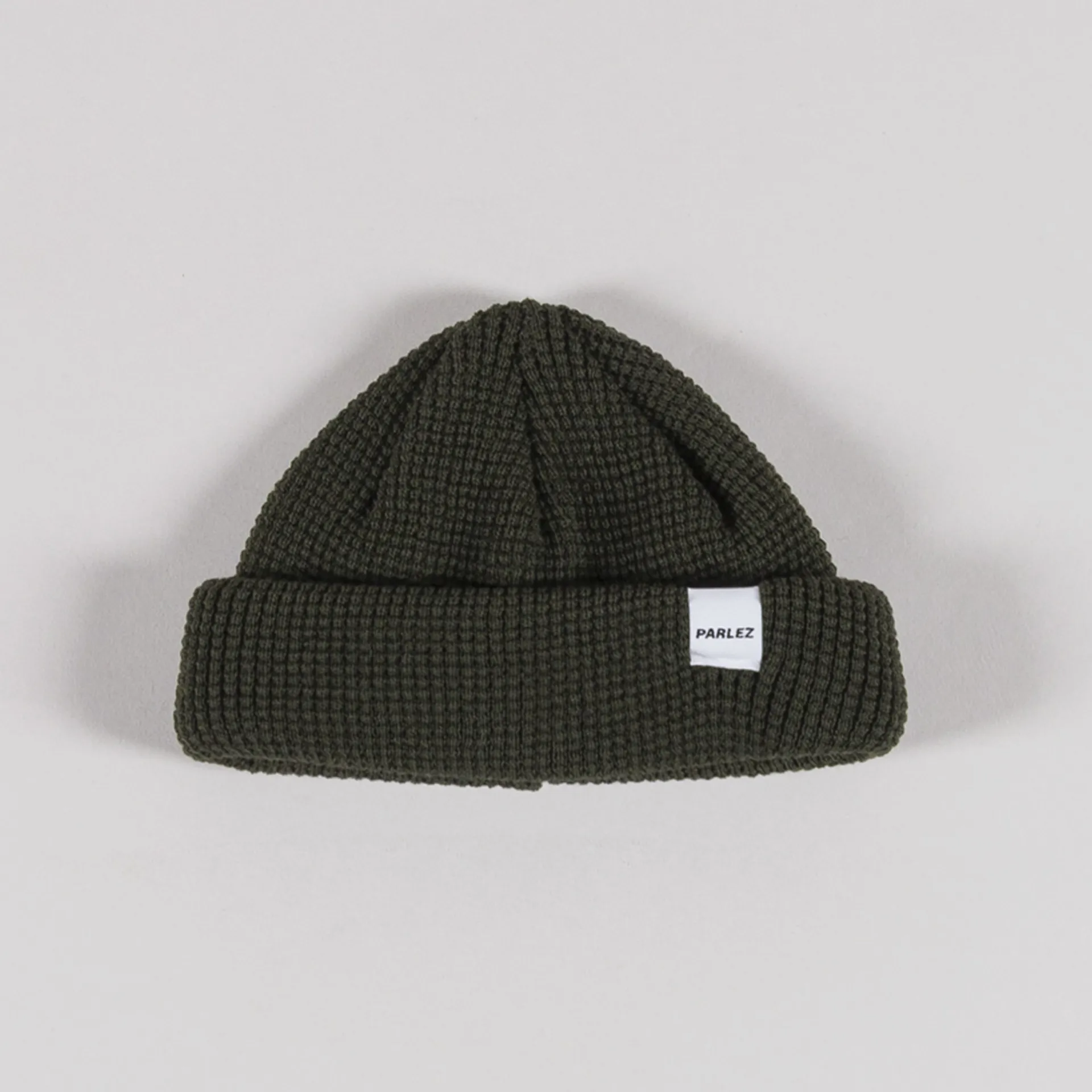 A short beanie from Parlez, constructed from soft merino wool in a waffle knit design. With a turned-up cuff and woven logo.