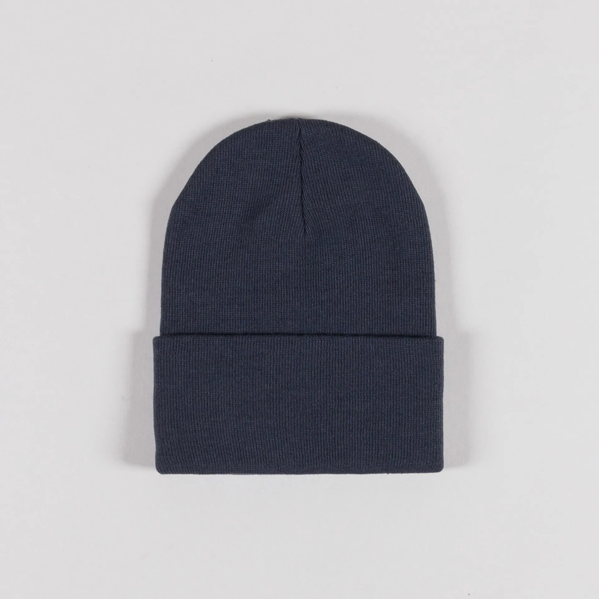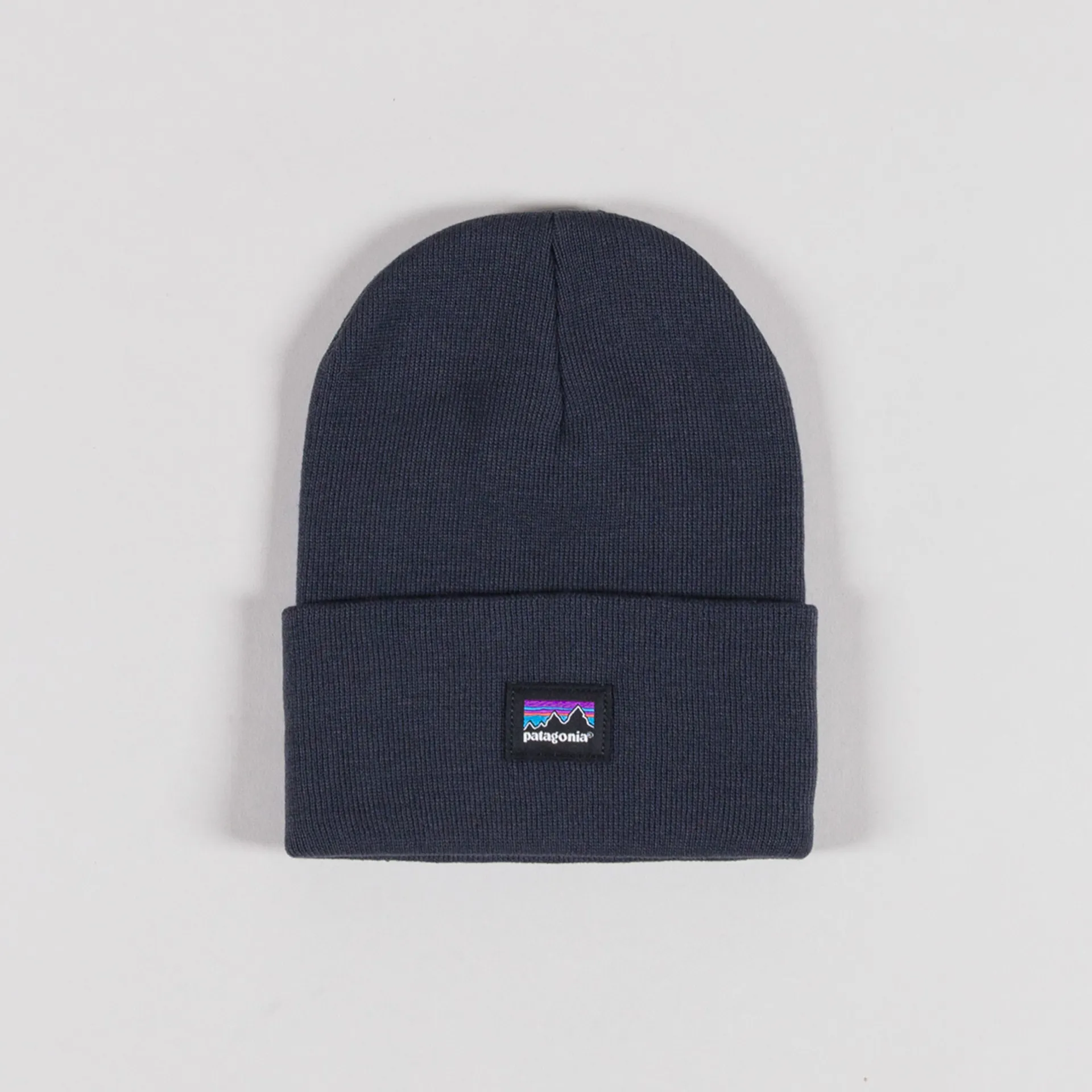 A knitted beanie from Patagonia, constructed from 100% recycled polyester with a turned up cuff and woven logo patch.