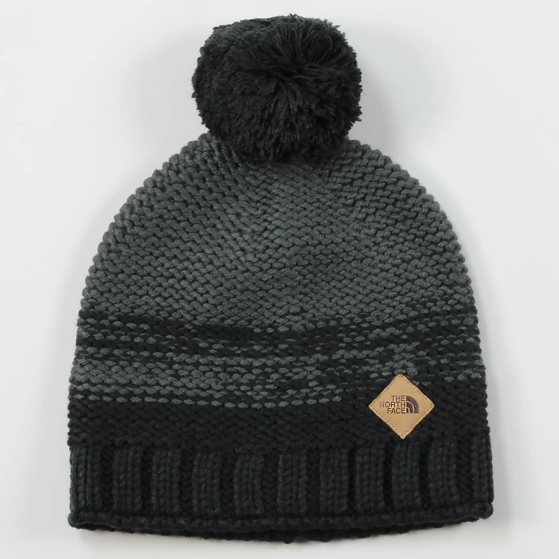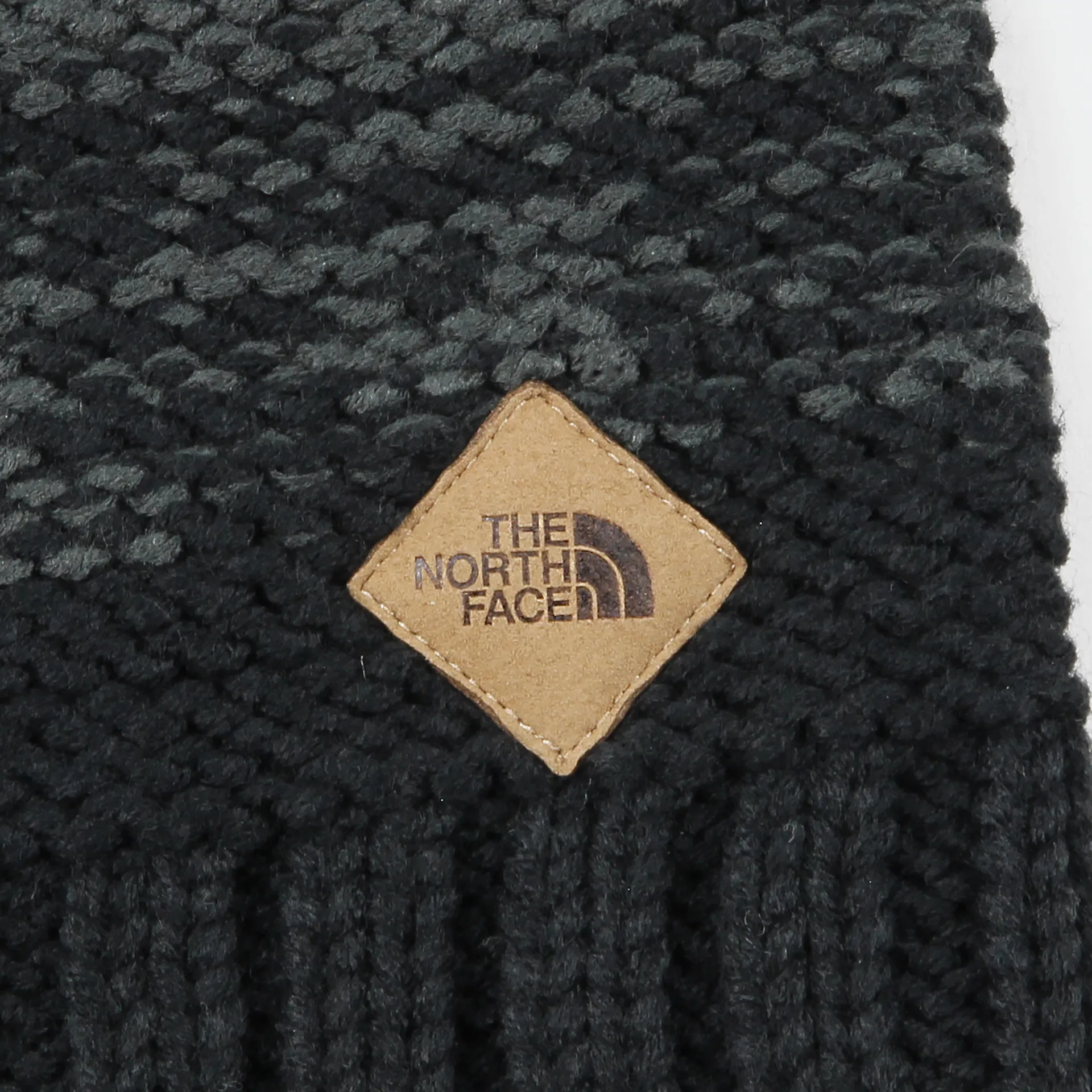 The hat has a yarn pom atop of it, a fleecy headband for extra insulation and a smart TNF leather logo tab.