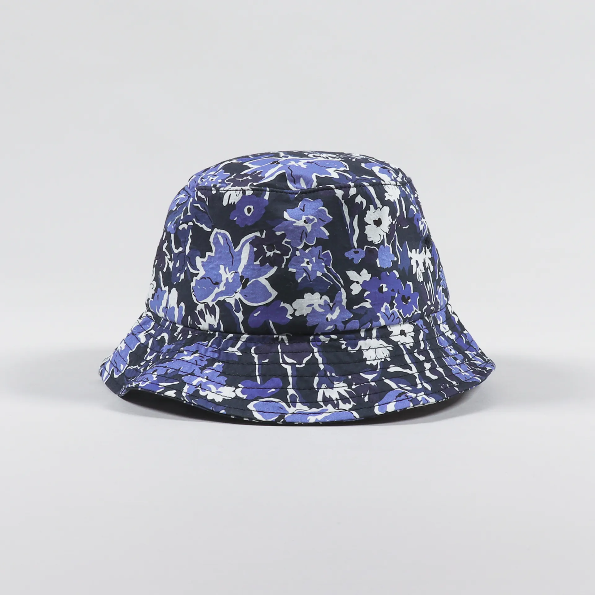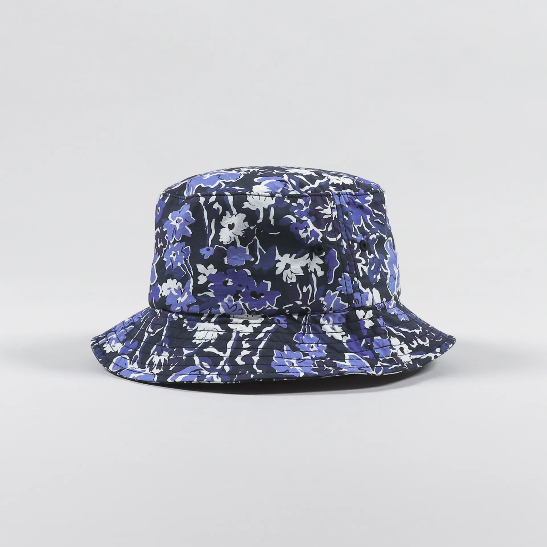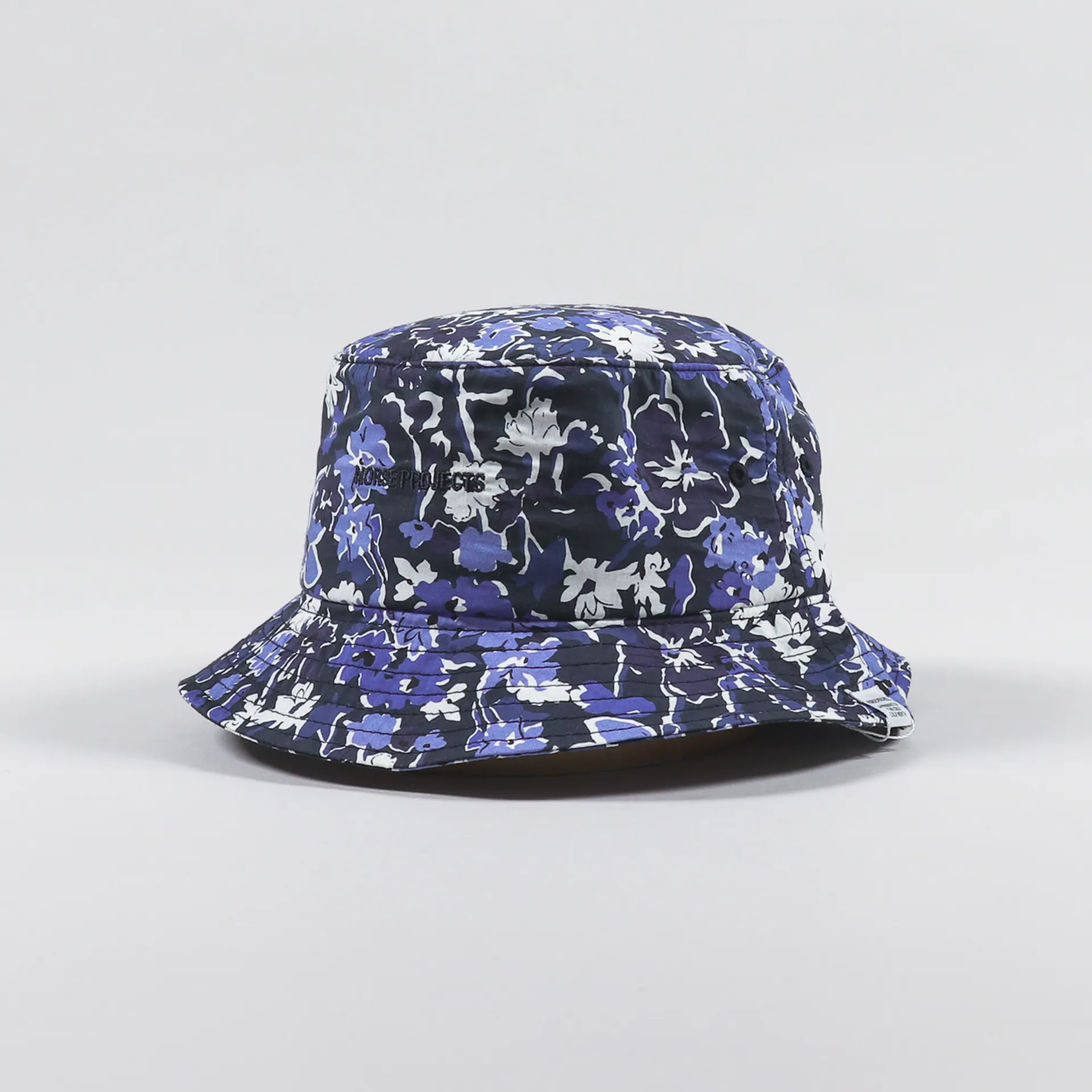 A bucket hat from Norse Projects made from cotton plain weave with a nylon tricot backer, featuring a Liberty floral design, embroidered logo across the front and a woven logo tag to the brim.