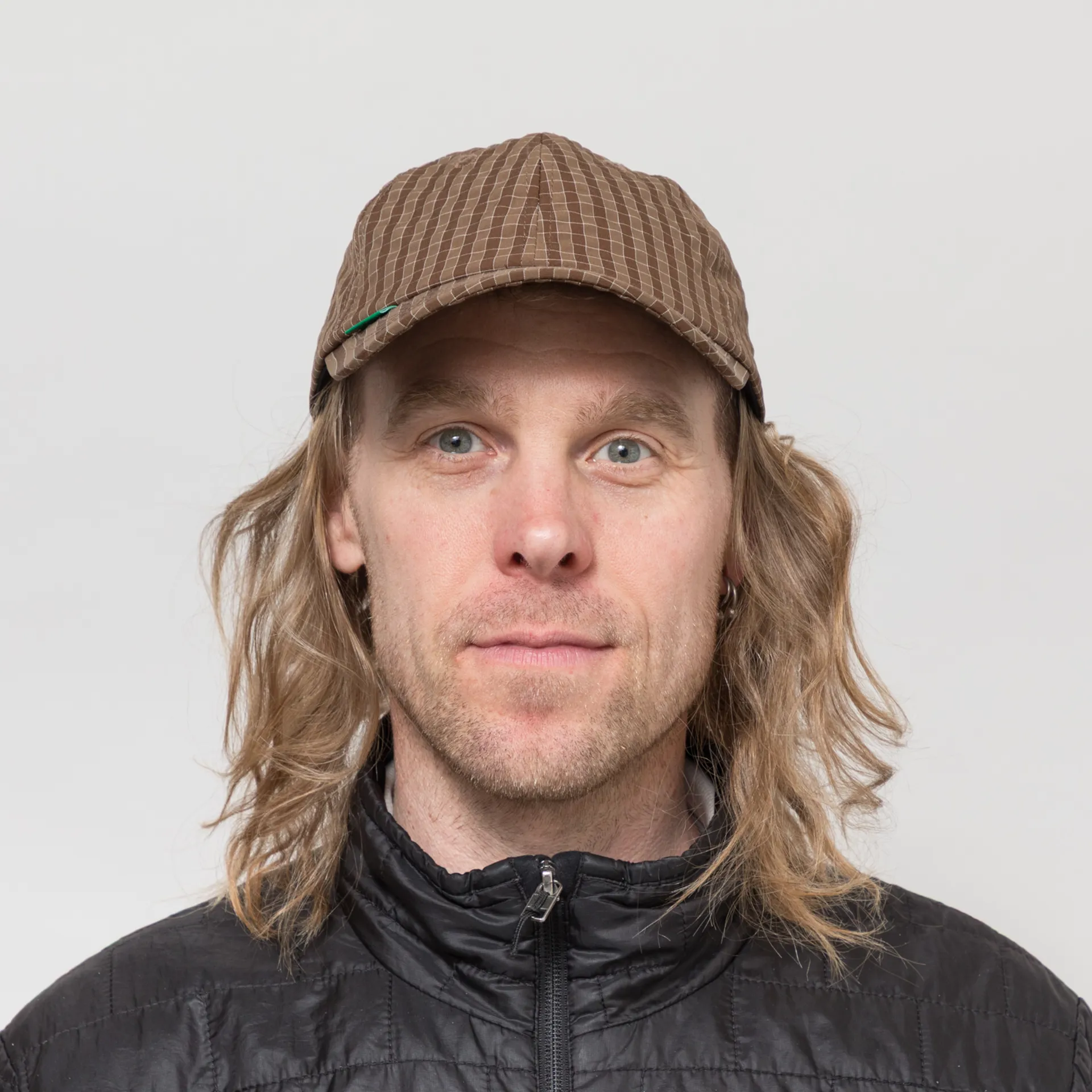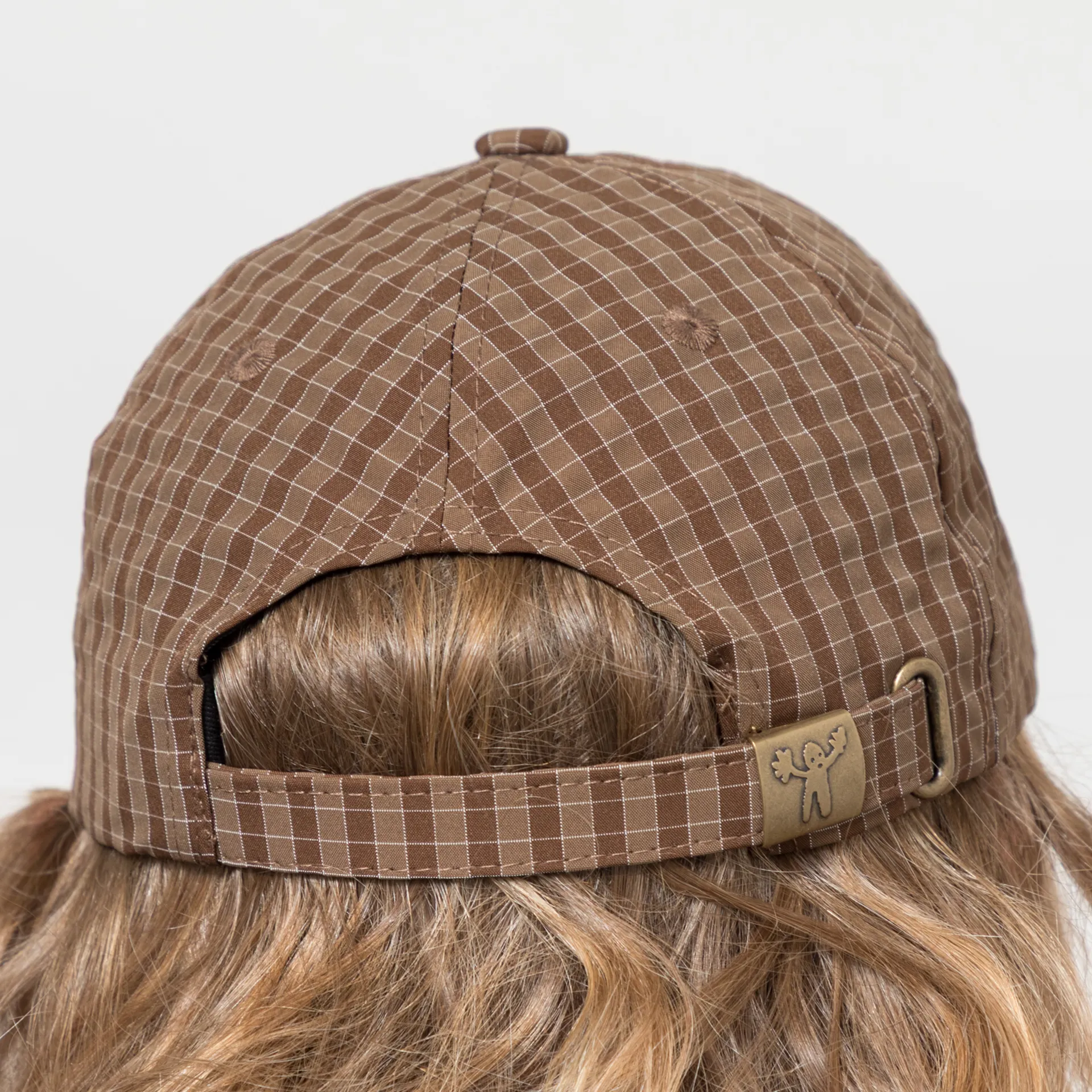 A plaid six-panel from CANDICE, constructed from a durable blend of polyester and rayon fabrics. It has a curved peak, embroidered eyelets, an adjustable strap and a woven flag label.