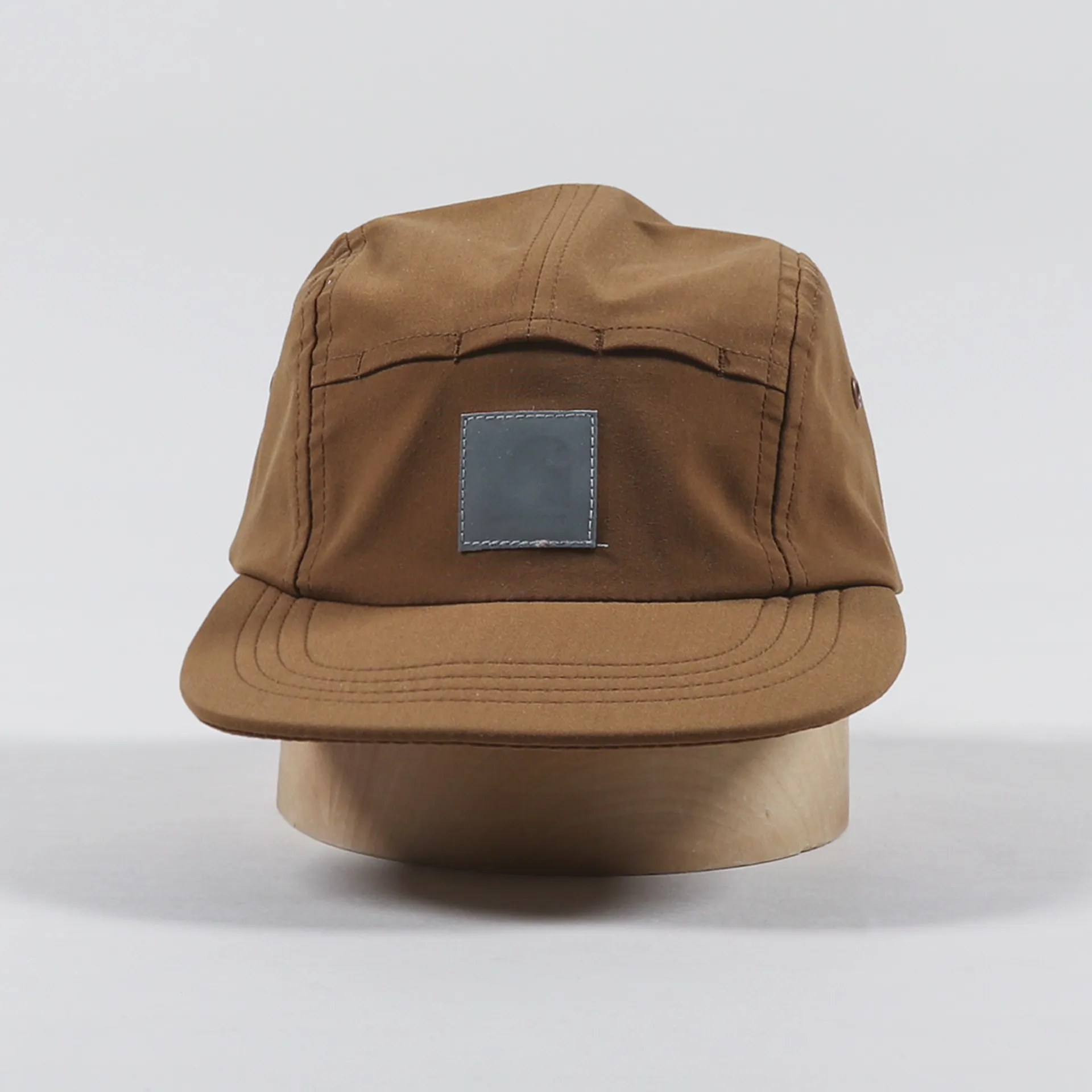 A five panel cap from Carhartt WIP made from a polyester poplin with a reflective logo patch to the front and a drawcord around the head.