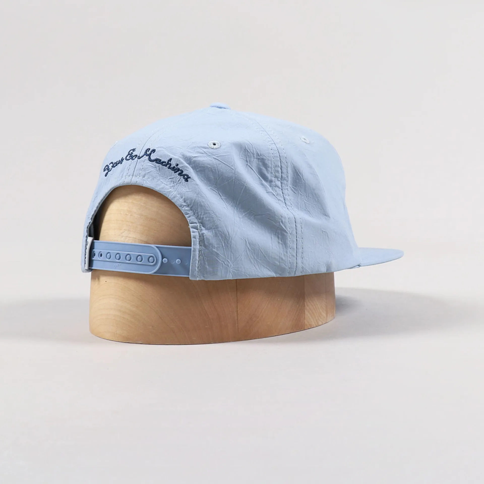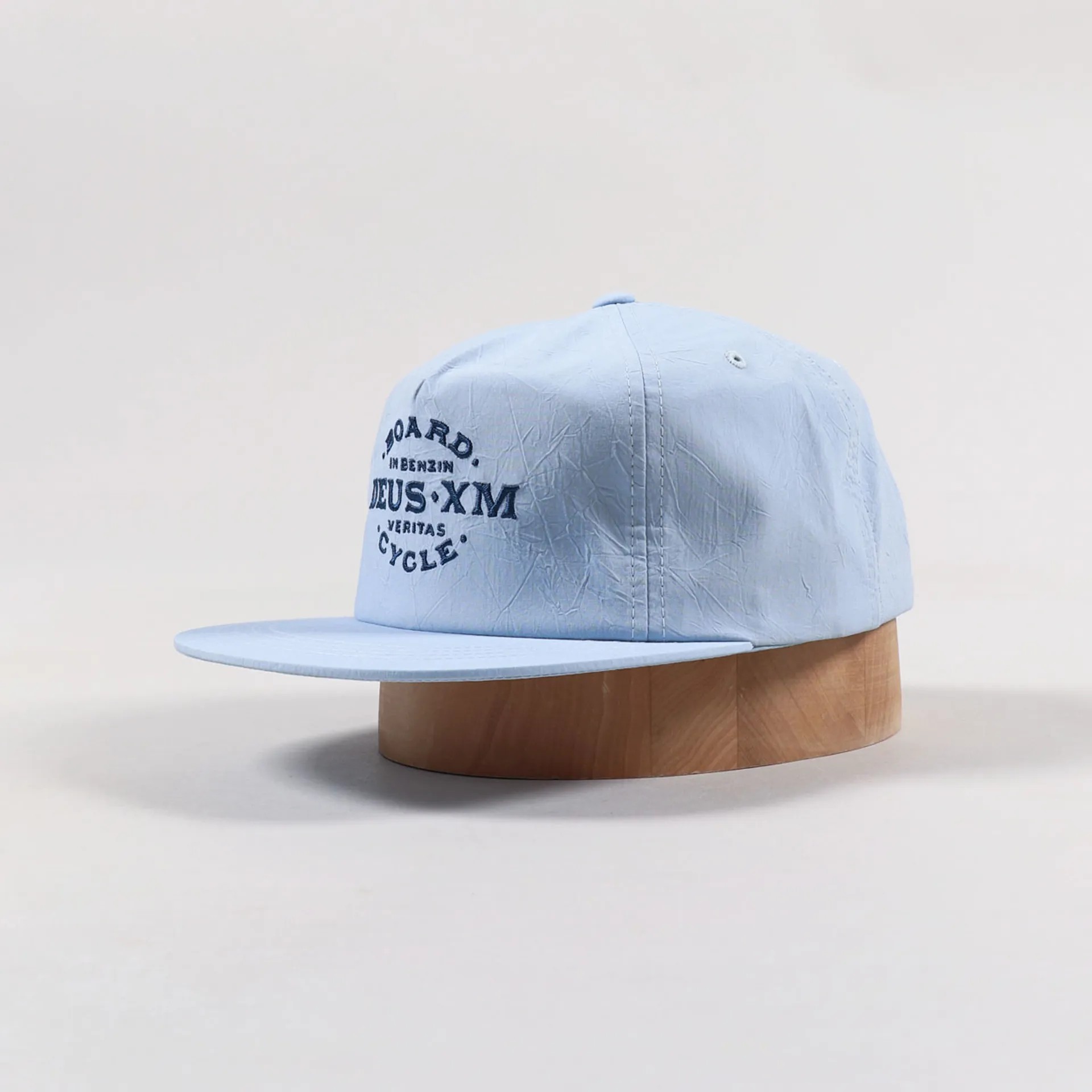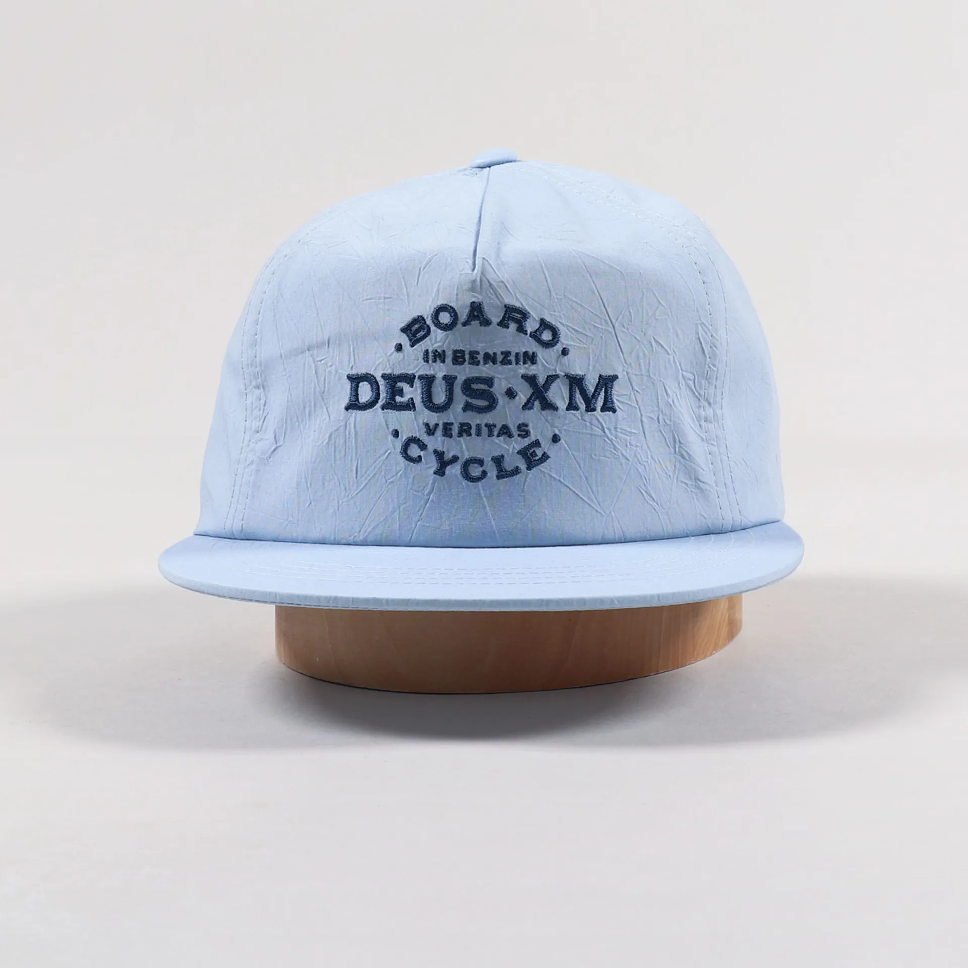 A cap from Deus Ex Machina made from a crinkled nylon plain weave with a flat peak, snapback side adjuster and embroidered script to the rear, and an embroidered logo to the front.