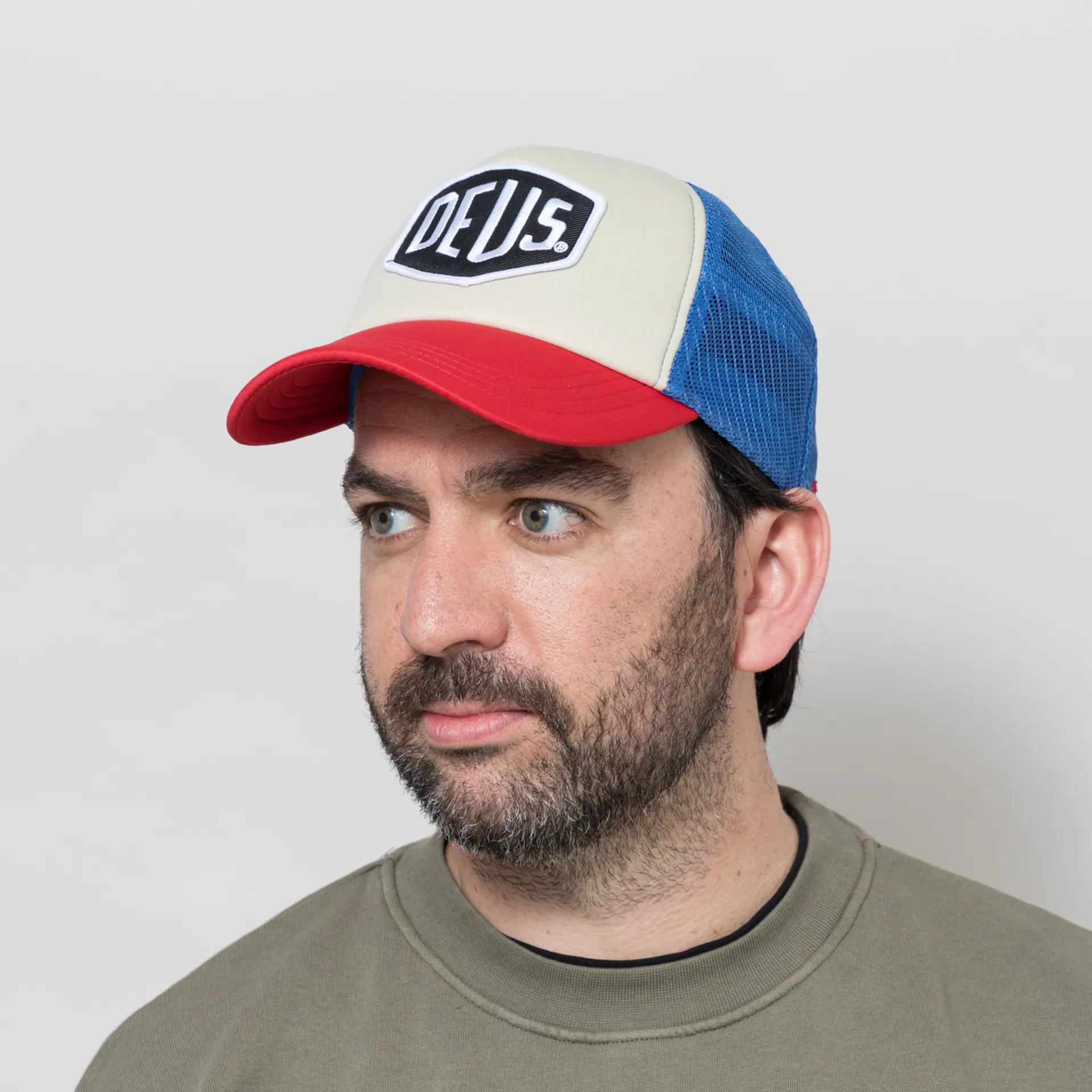 A trucker from Deus, constructed with polyester mesh panelling, a polyester foam front panel and a cotton lining.