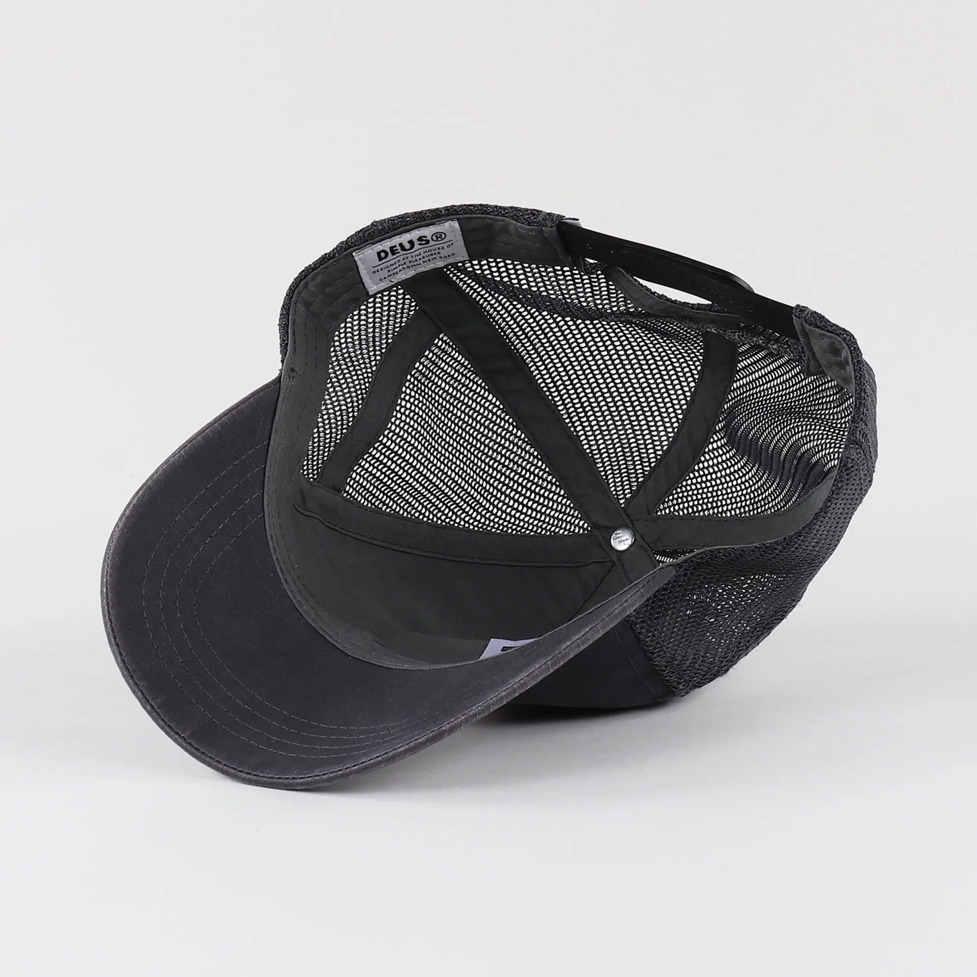 A trucker cap from Deus Ex Machina with a cotton ripstop front panel and a nylon mesh rear, with an embroidered logo to the front and detailing to the back.