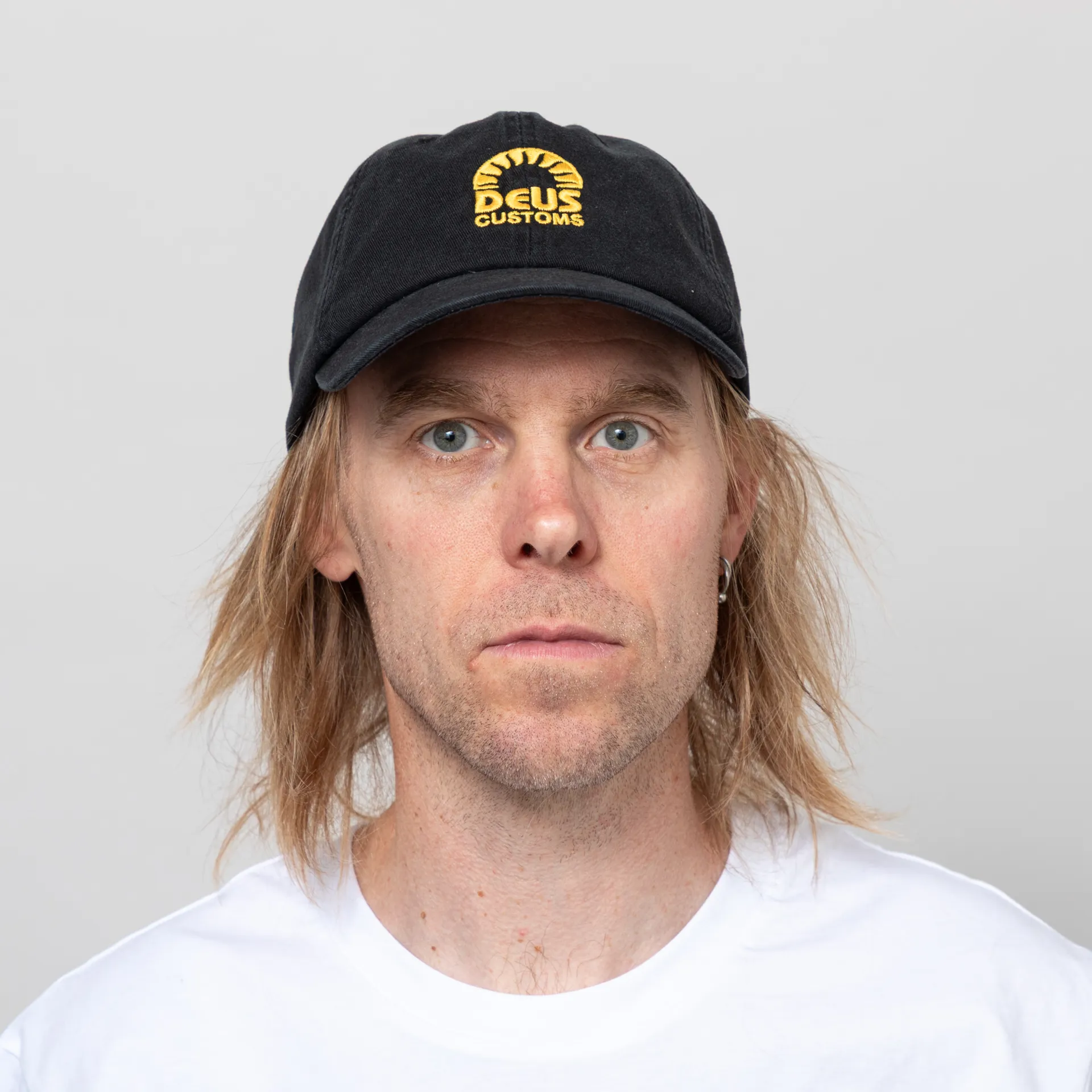 The Melodies Dad Cap from Deus Ex Machina is constructed in a six-panel design from 100% cotton twill. It features a firm, curved brim, embroidered eyelets, a metal buckle adjuster, embroidered lettering to the rear and a cool embroidered Deus Customs logo to the front.