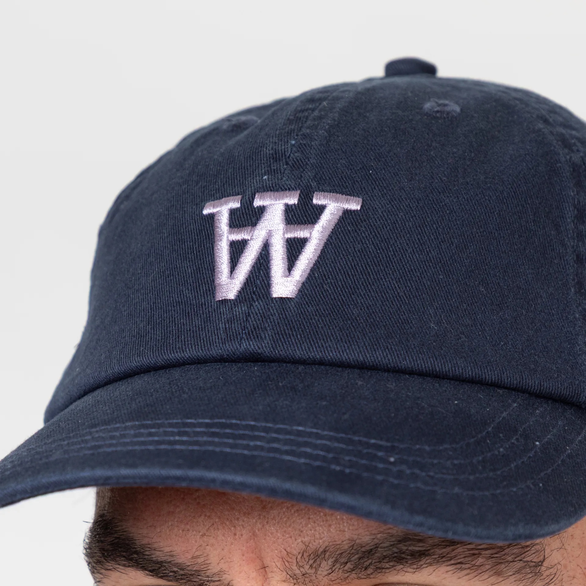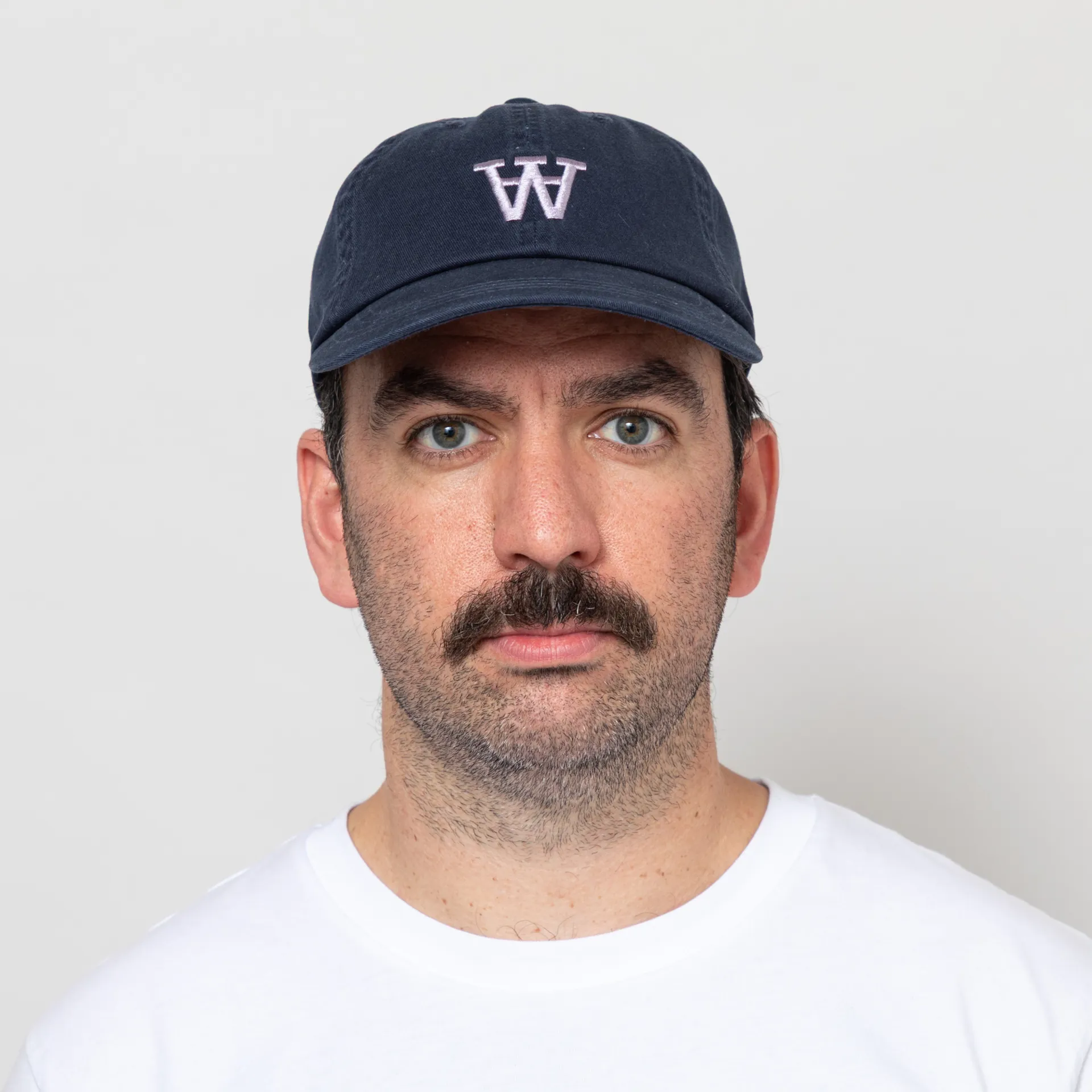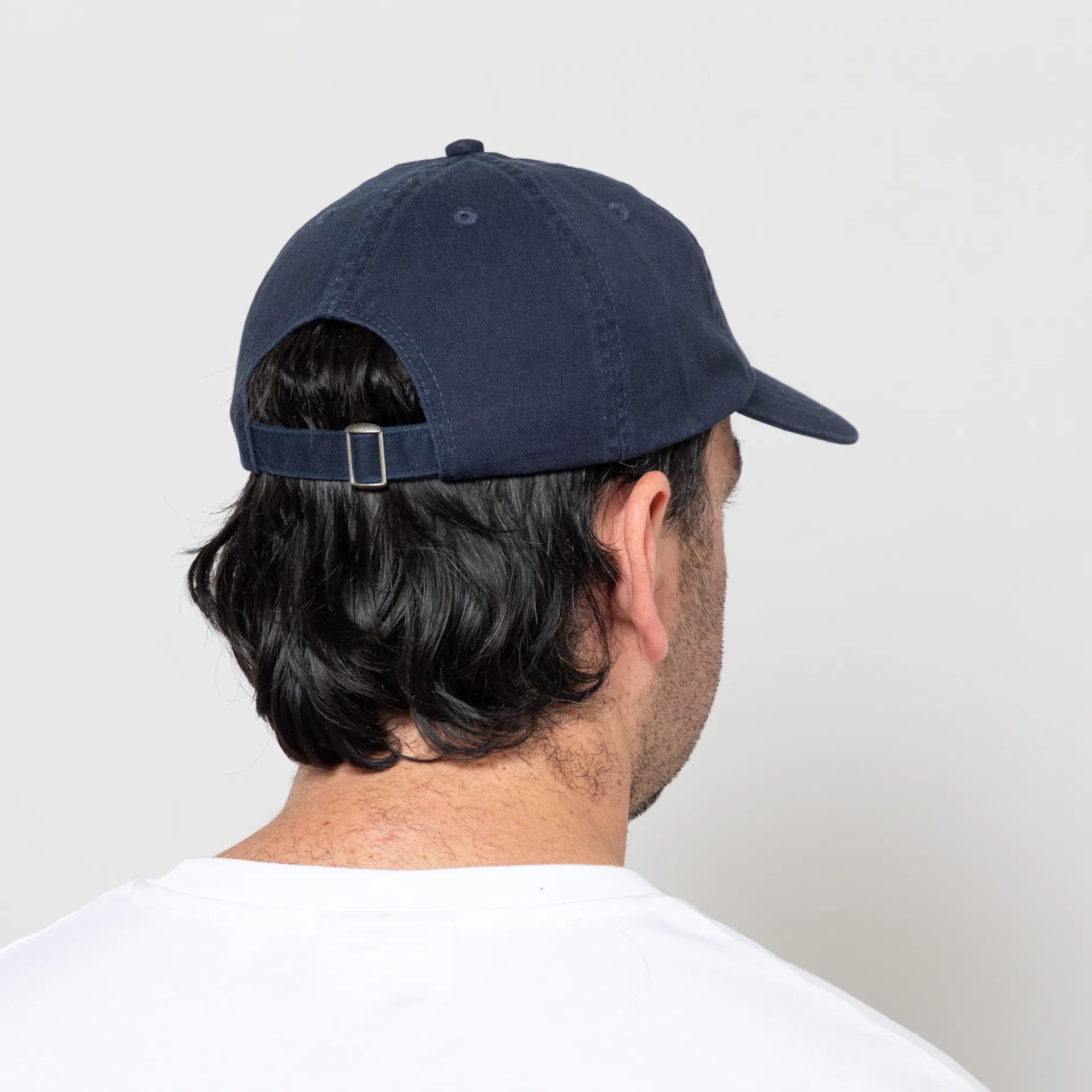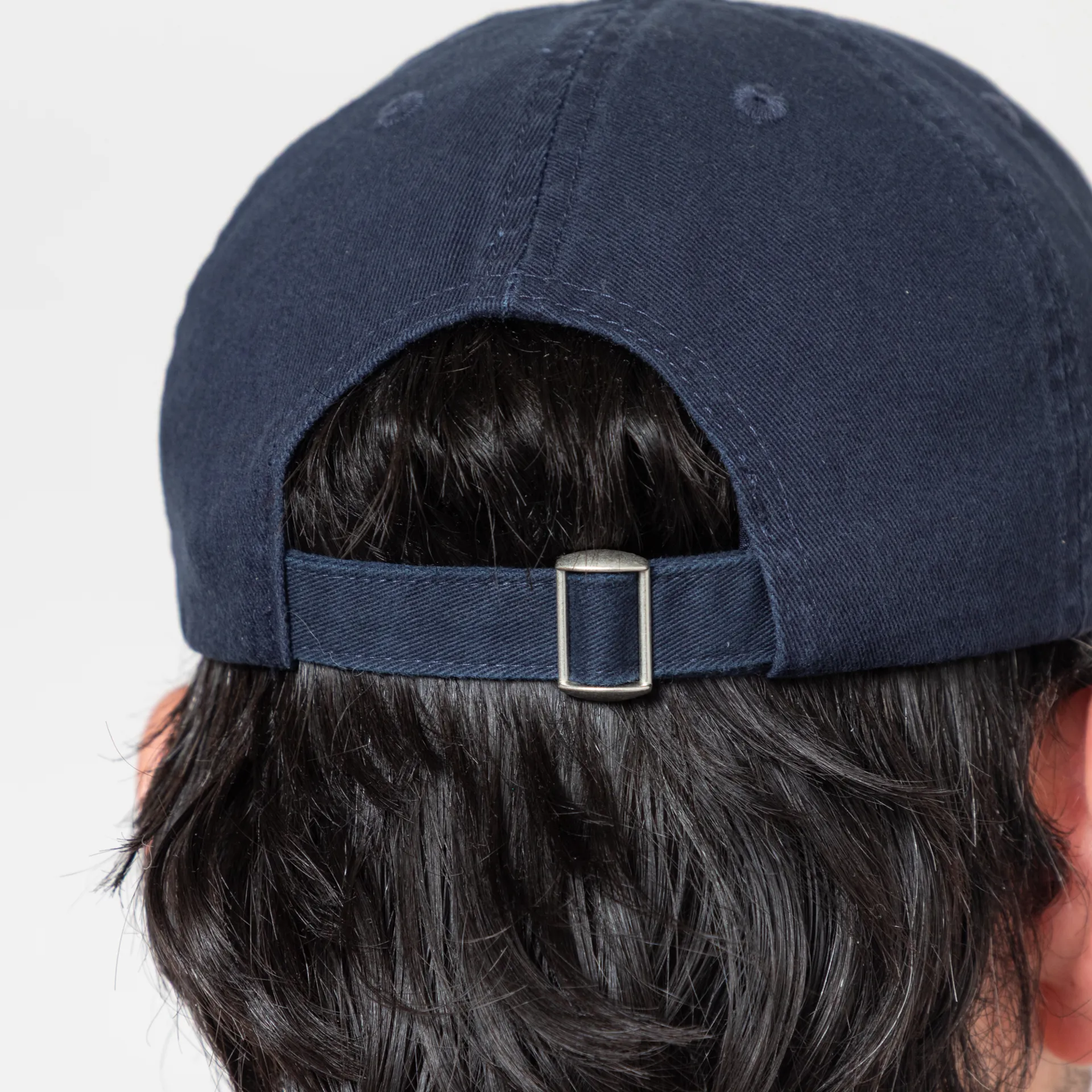 A six-panel from Double A, constructed from durable organic cotton, with embroidered eyelets, a curved brim and buckle adjuster to the back. Finished with an embroidered Double A logo to the front.