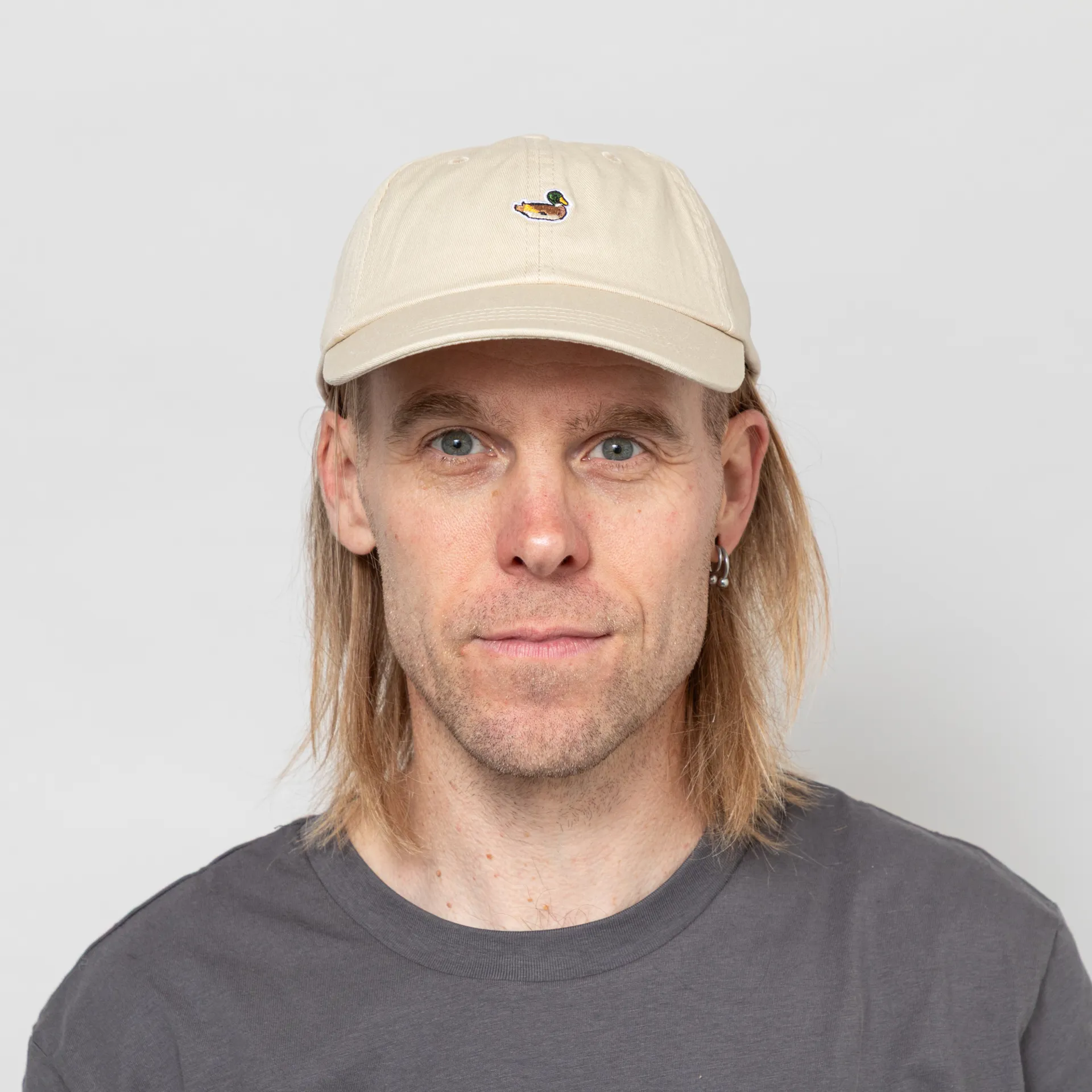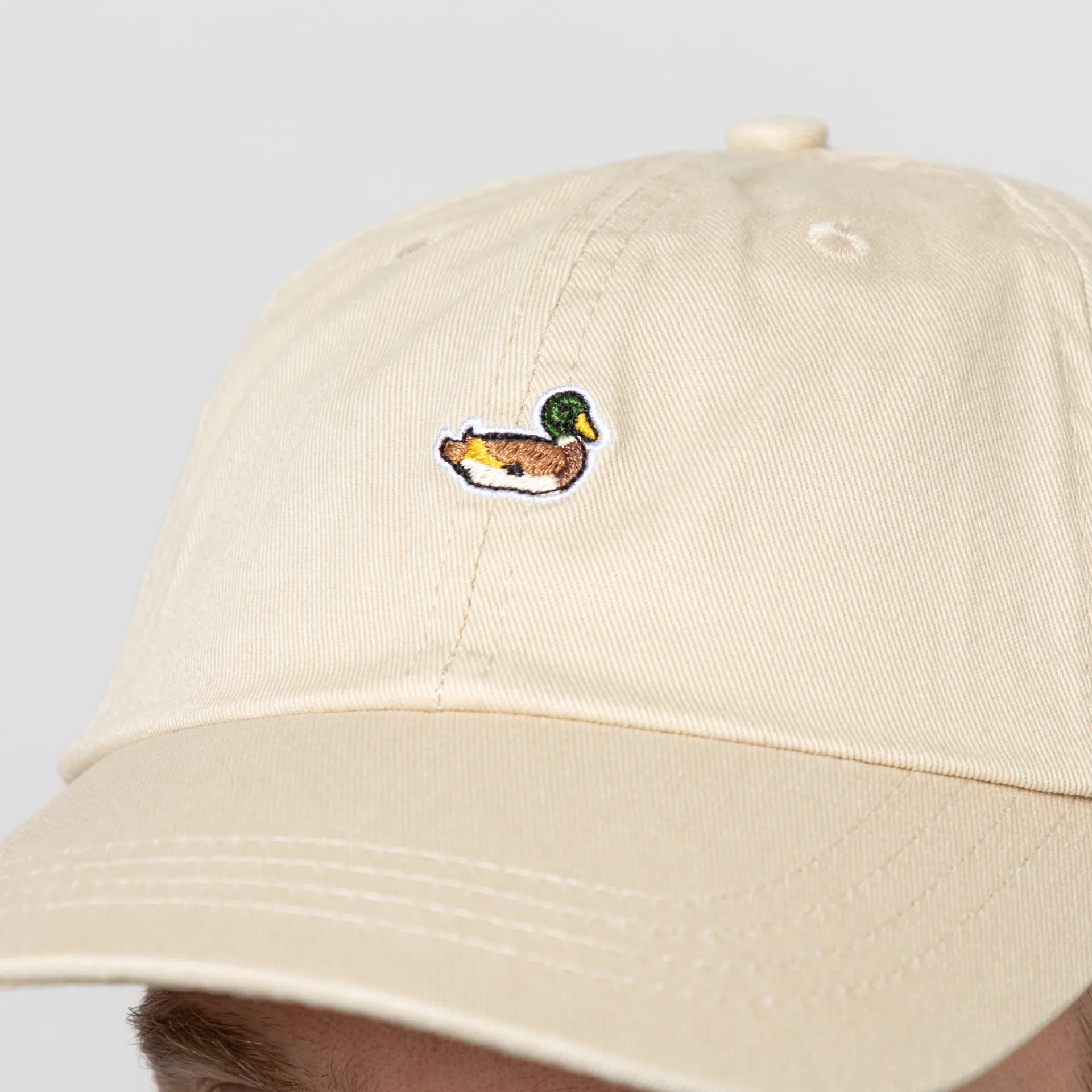 A six-panel from Edmmond Studios, constructed from 100% cotton with a curved brim and embroidered eyelets. Finished with a metal buckle adjuster to the back and an embroidered duck patch to the front.