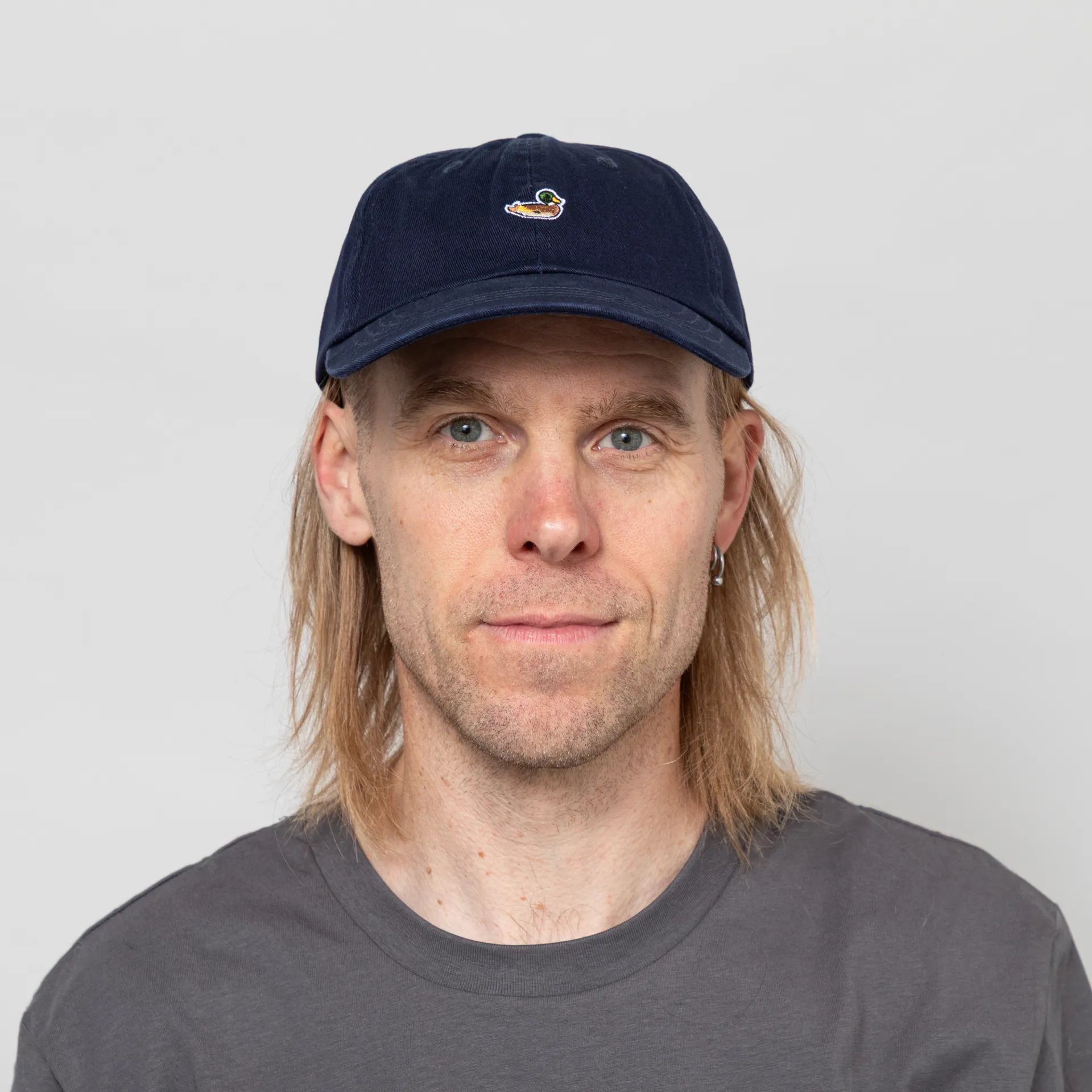 A six-panel from Edmmond Studios, constructed from 100% cotton with a curved brim and embroidered eyelets. Finished with a metal buckle adjuster to the back and an embroidered duck patch to the front.