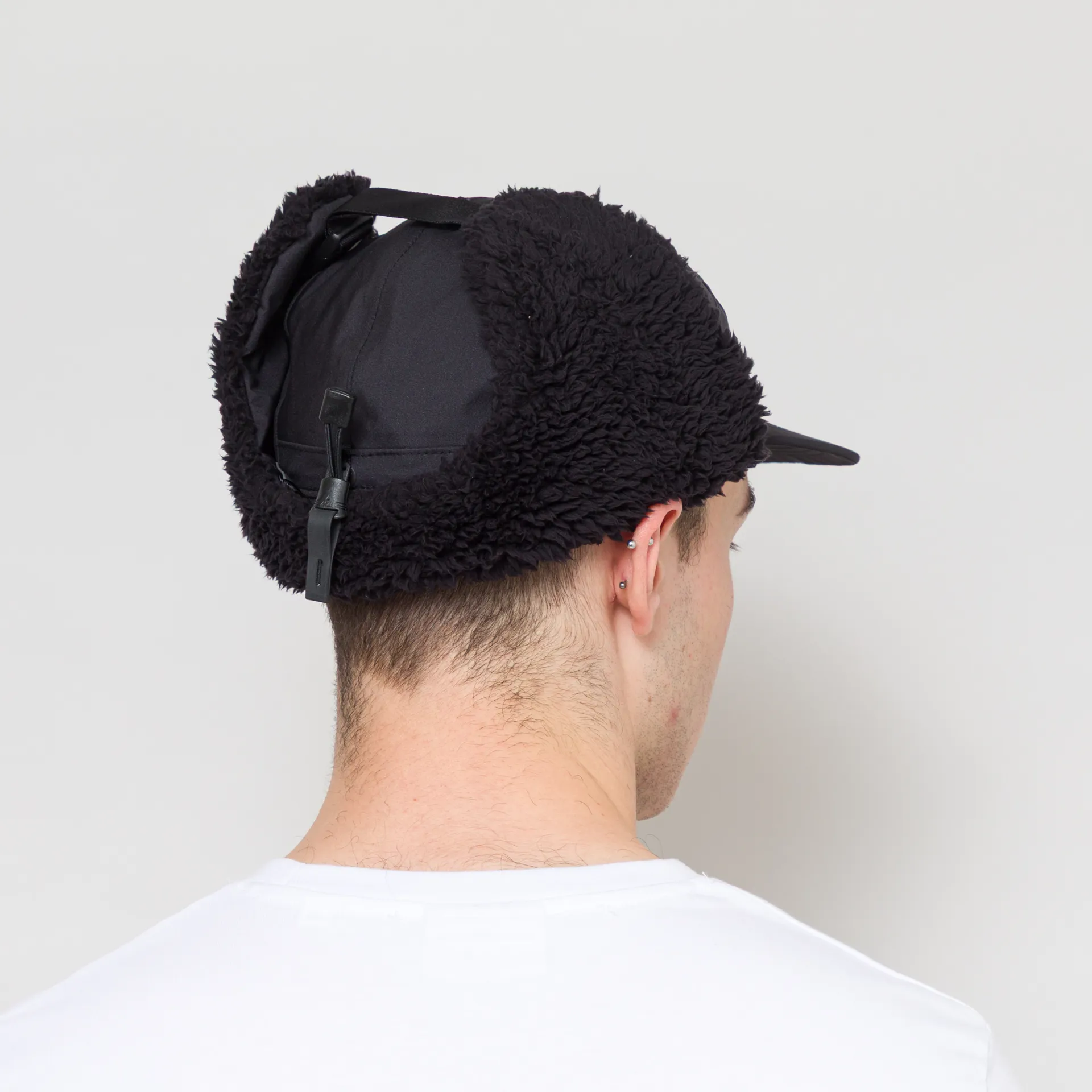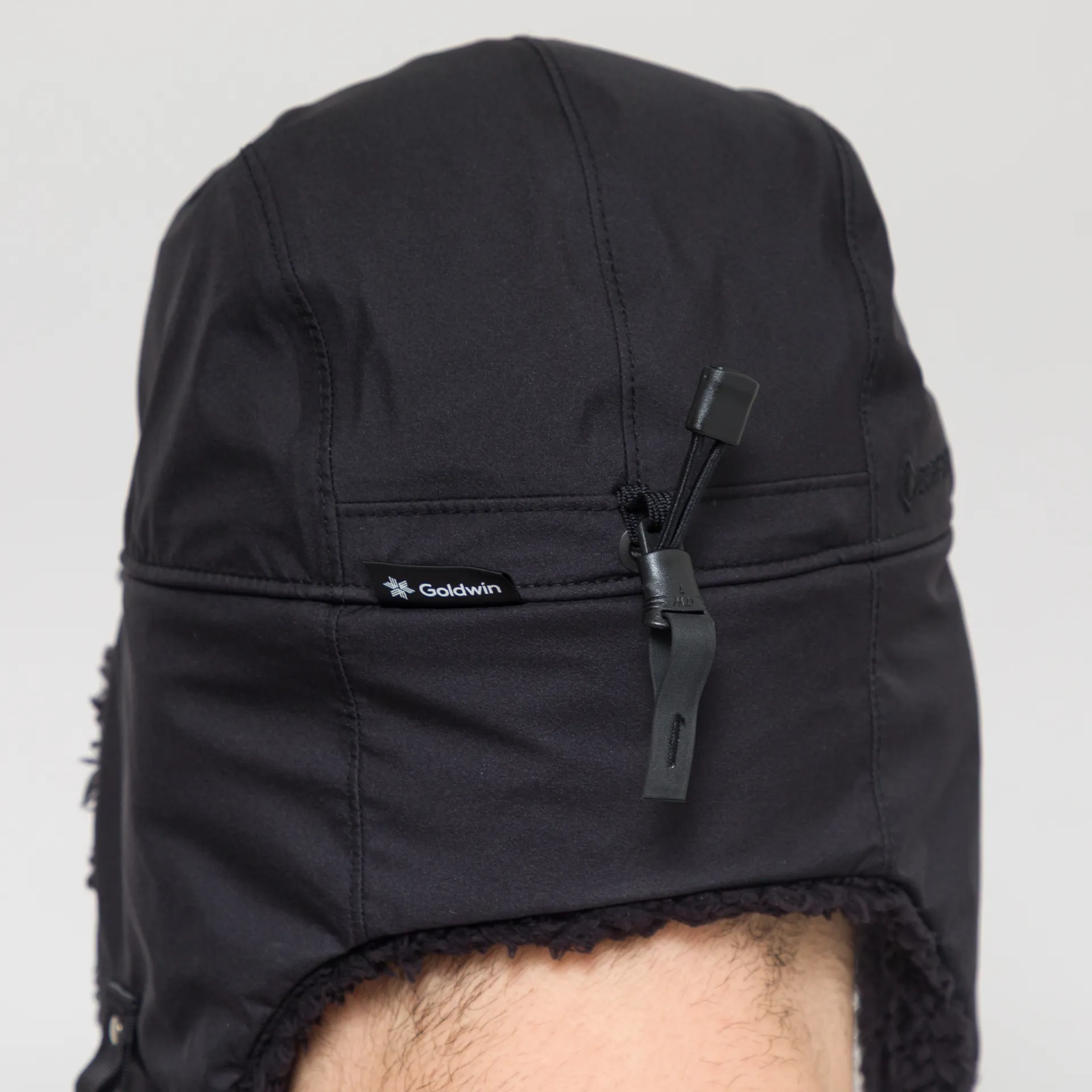 An insulated, waterproof cap from Goldwin, constructed with three-layer GORE-TEX fabric and a polyester boa fleece lining. Featuring a floppy, flat brim, ear flaps that can be worn up or down, a magnet fastening chin-strap and an adjustable drawcord to the back. Finished with a flag label and tonal embroidered logo.