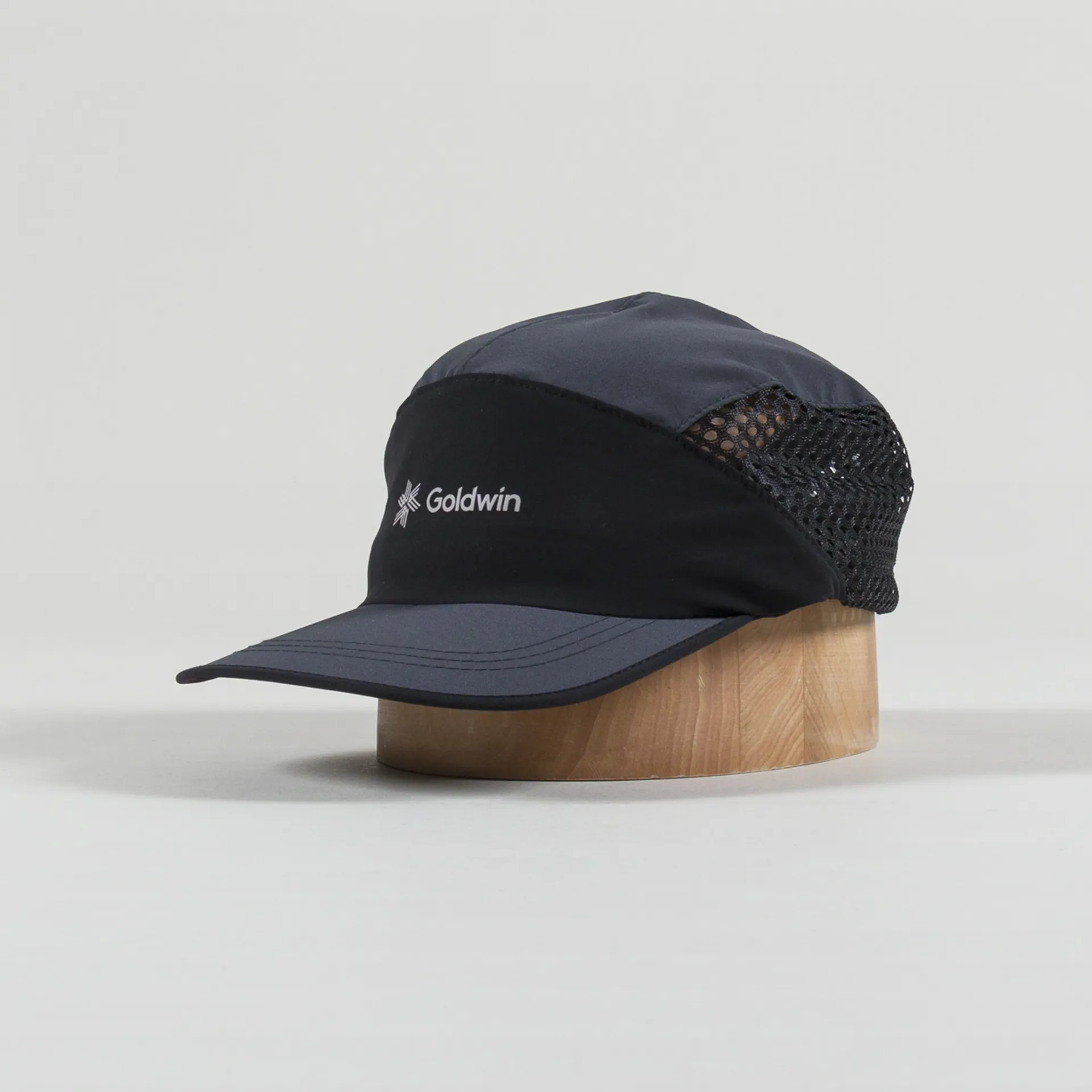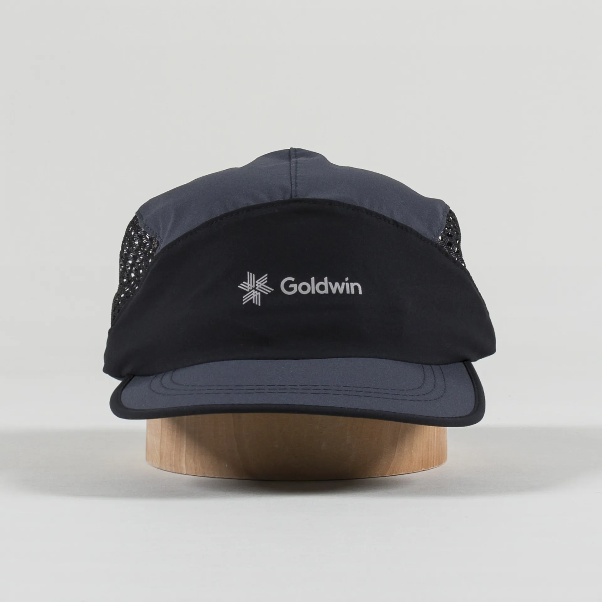 A sports hat from Japanese outerwear label Goldwin, made from a lightweight, durable polyester taffeta and mesh, with a five panel design, an elasticated/adjustable strap to the rear and a reflective logo to the front.