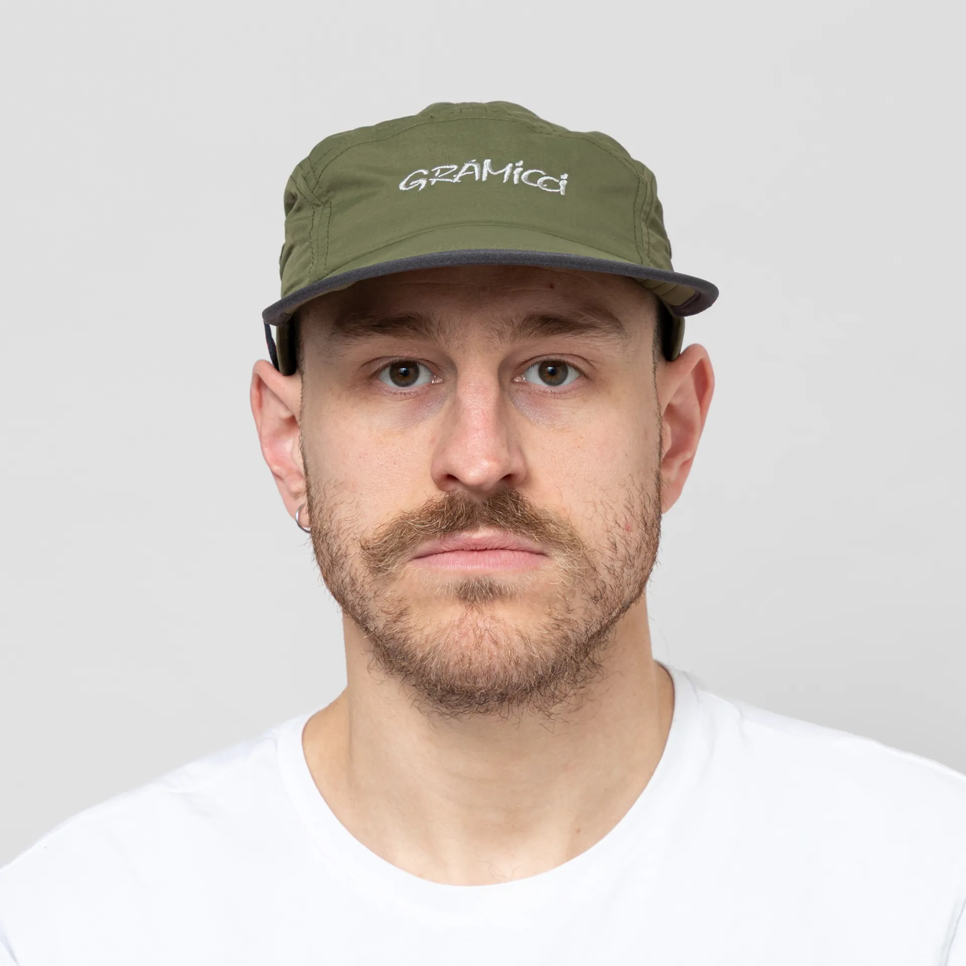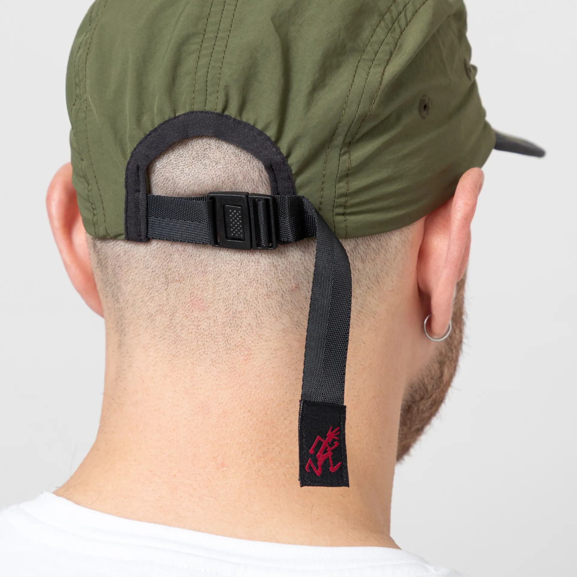 A five panel from Gramicci, constructed from quick drying recycled nylon, featuring a flat, floppy brim and a webbing strap adjuster. Finished off with contrast binding throughout and an embroidered Gramicci logo to the front.