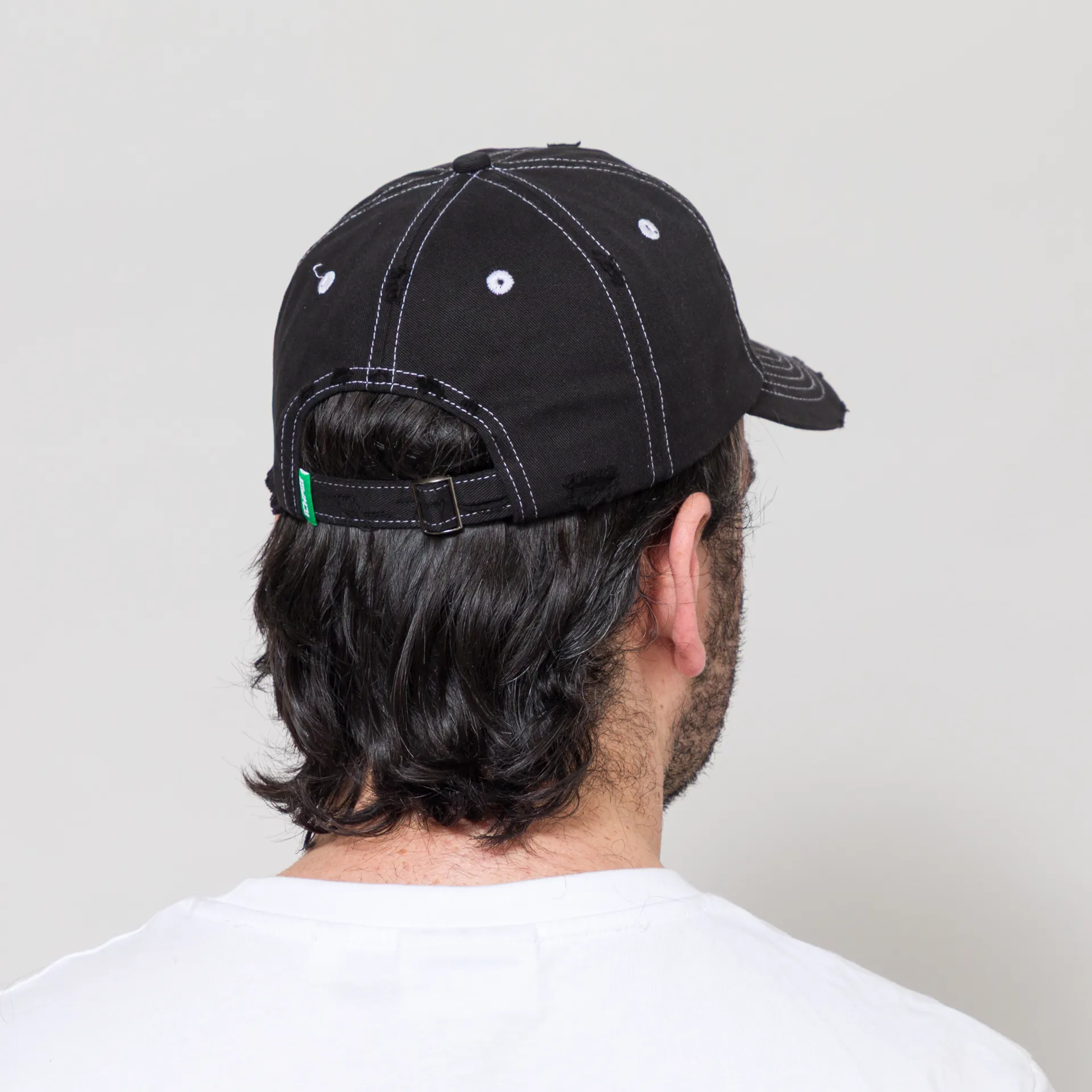 A six-panel from ICHPIG, constructed from enzyme-washed cotton with contrast stitching throughout. It features a curved peak, embroidered eyelets, an adjustable back strap, and an embroidered logo to the centre front.