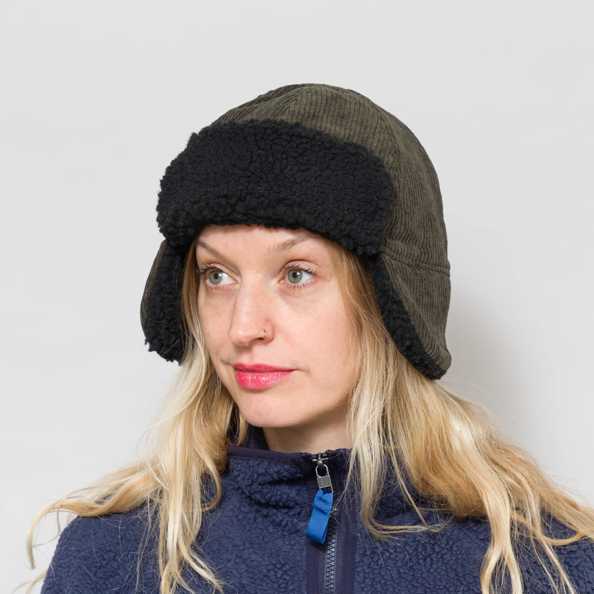 A 6-panel trapper cap from Kavu made from an outer of cotton corduroy and an inner of warm polyester high pile sherpa fleece.