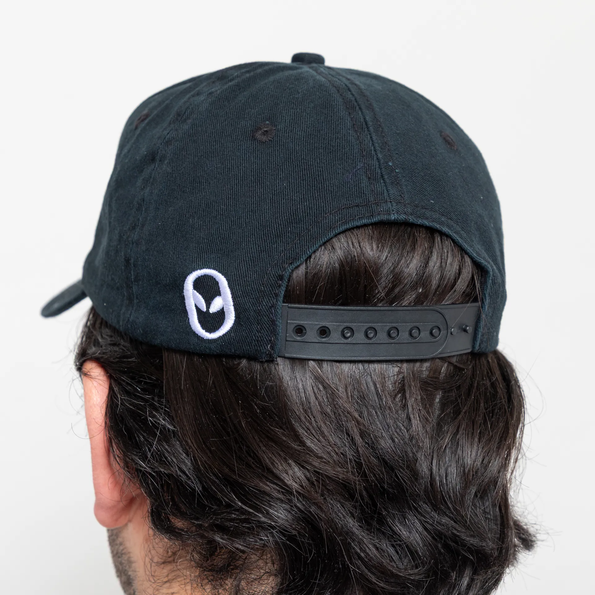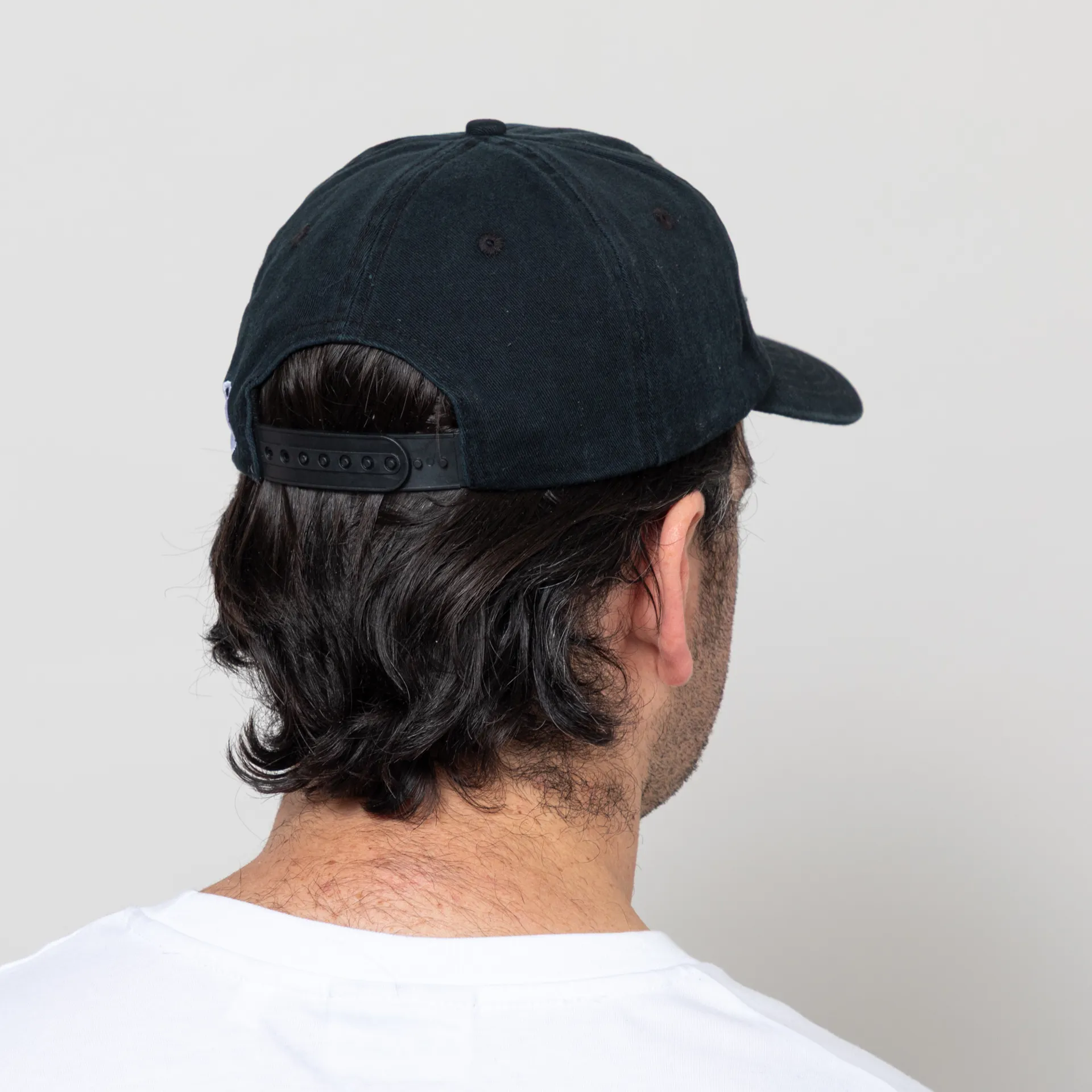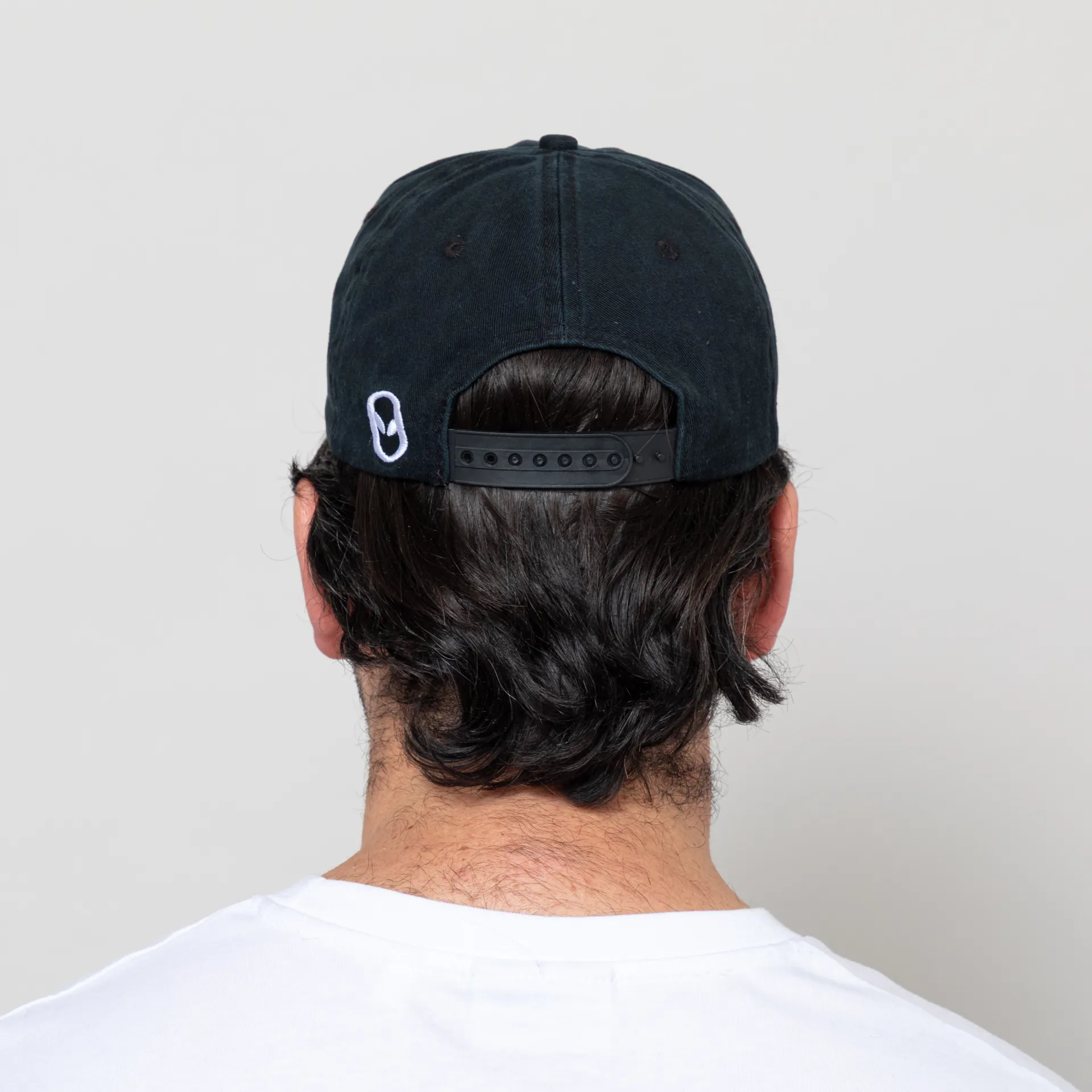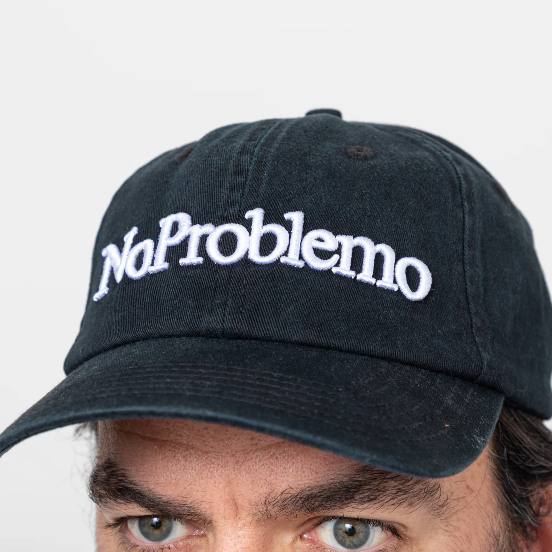 This six-panel cap from No Problemo has been constructed from soft 100% cotton drill, with a plastic snap adjuster to the back, embroidered eyelets, Gothic Alieno embroidery to the back and is finished with a No Problemo 3D embroidered logo across the front.