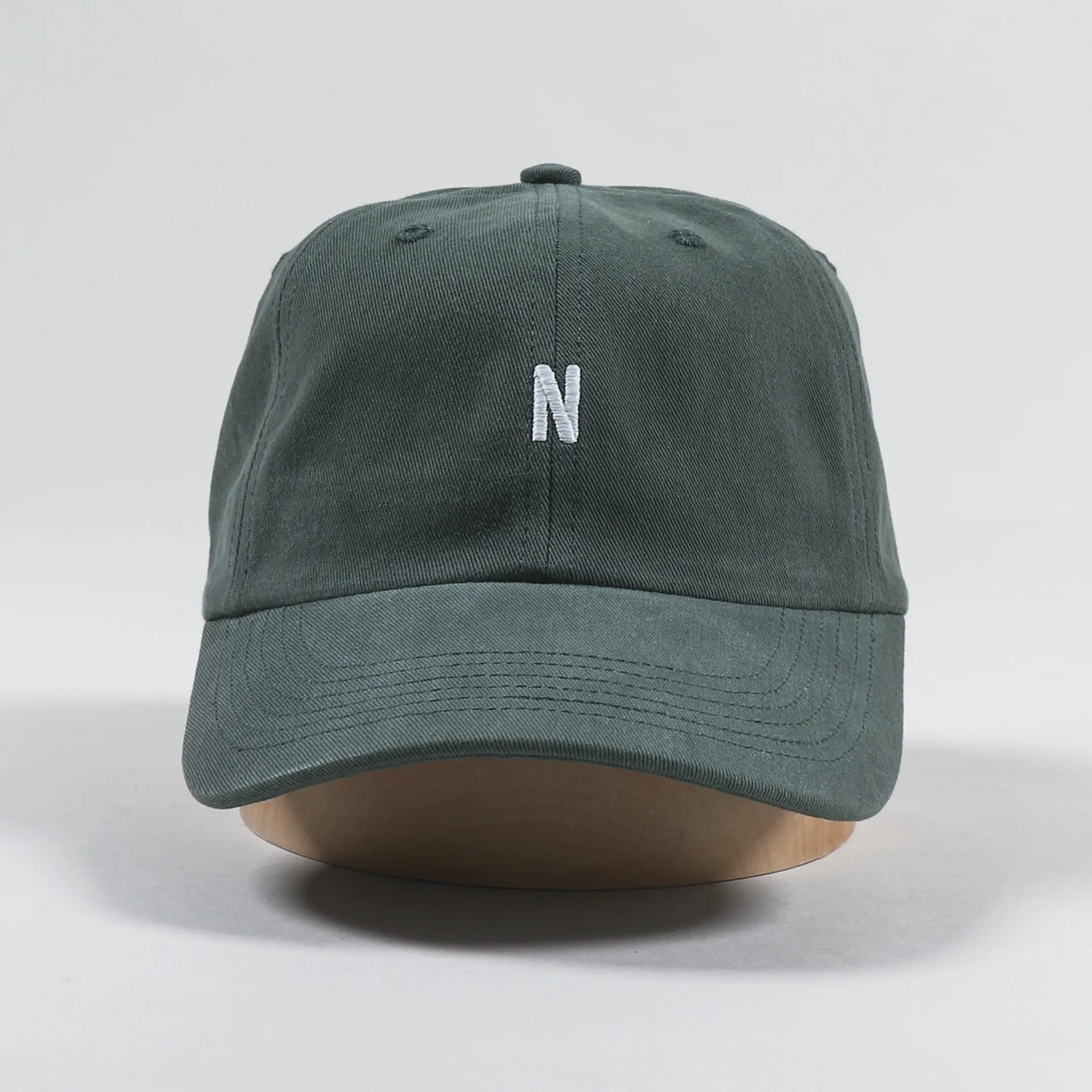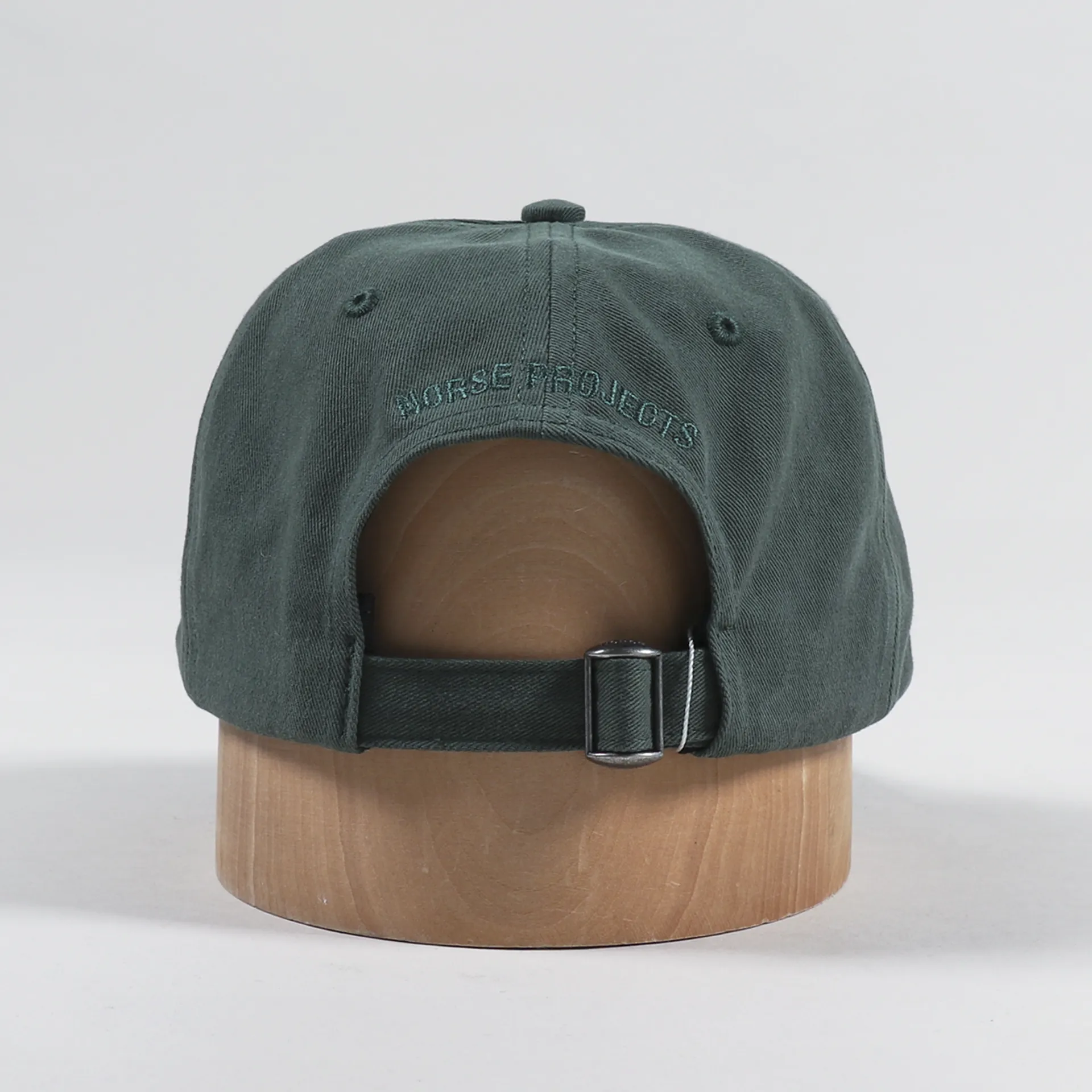 A cap from Norse Projects made in the USA from 100% cotton twill with an embroidered logo to the front and script to the back, above an adjustable strap.