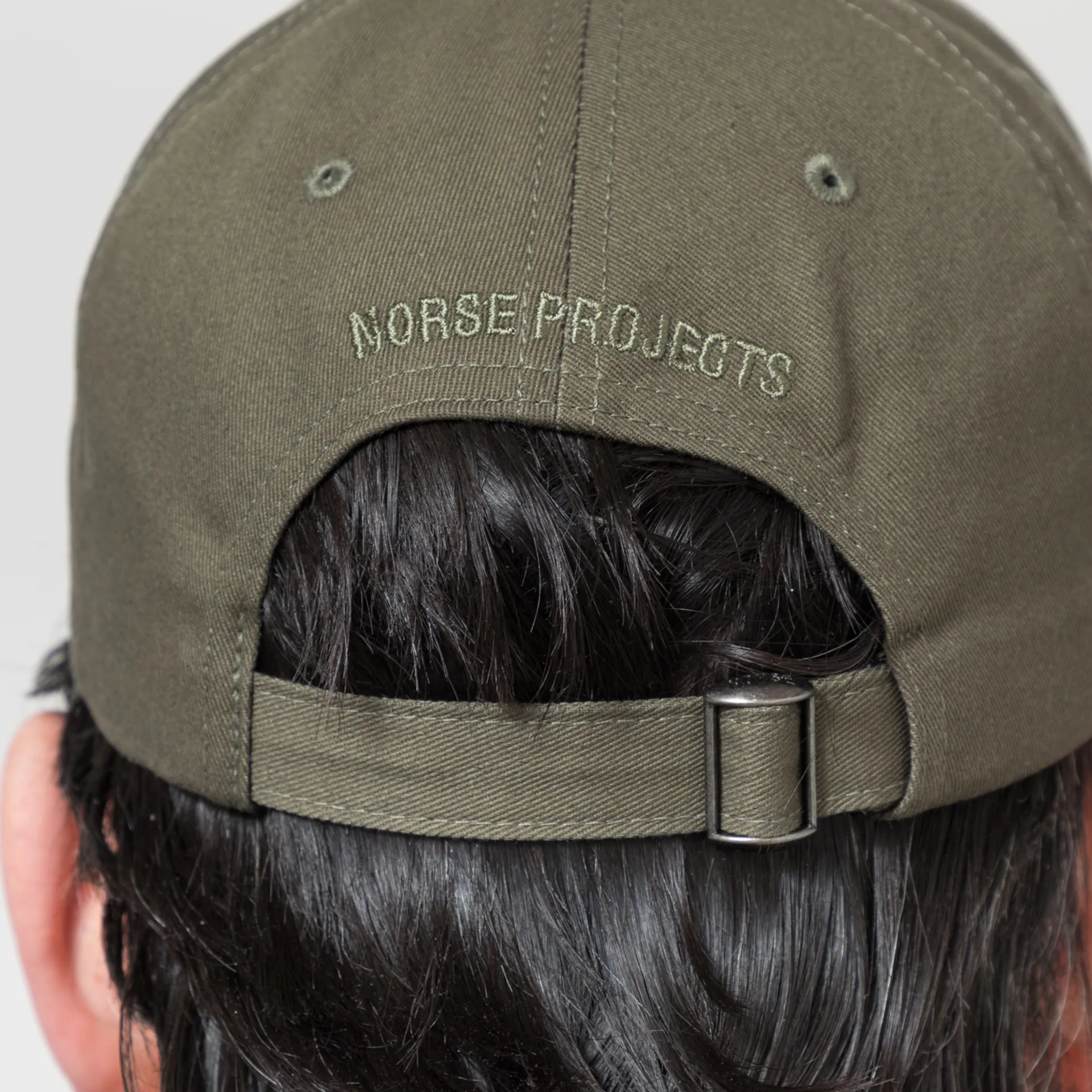 A cap from Norse Projects made in the USA from 100% cotton twill with an embroidered logo to the front and script to the back, above an adjustable strap.