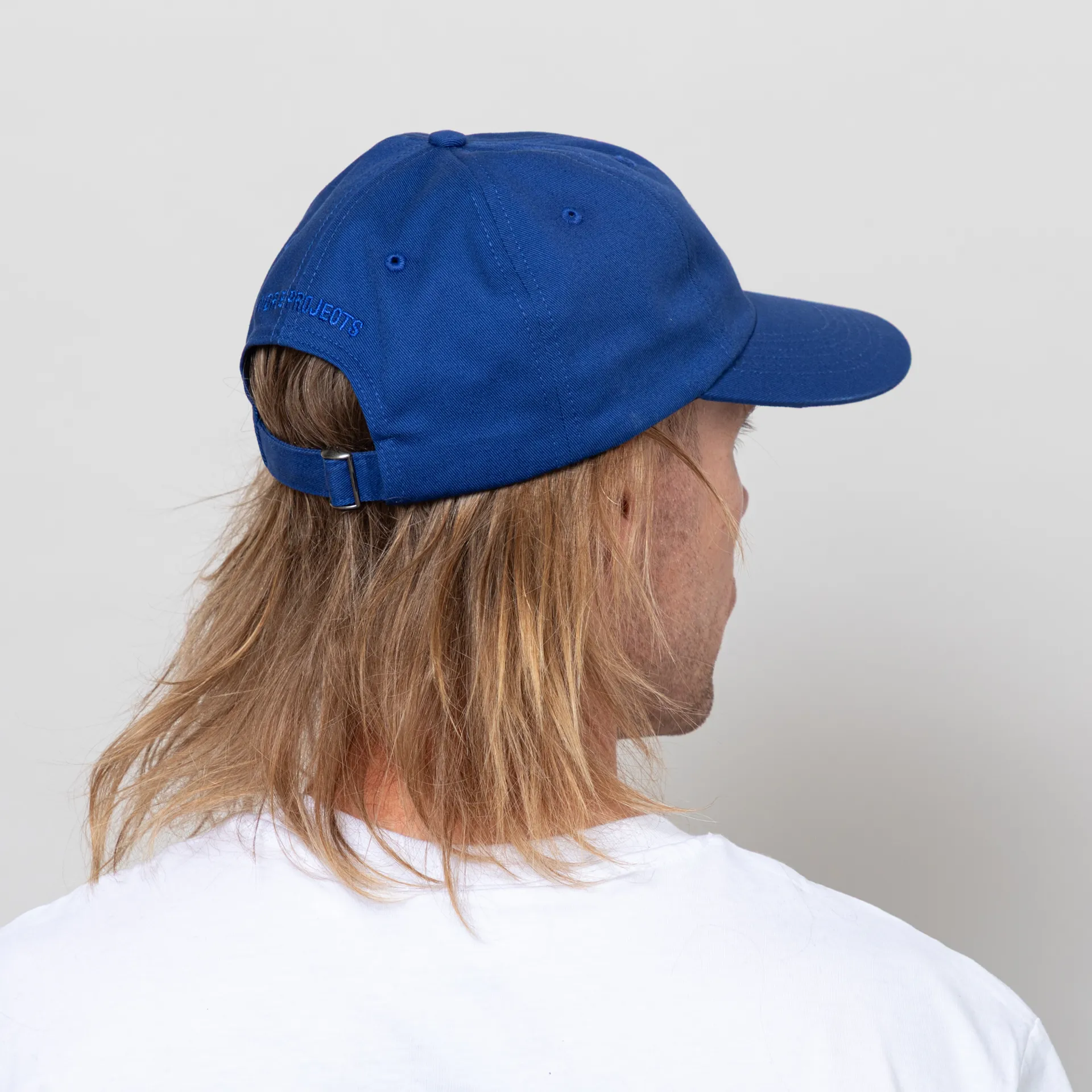 A cap from Norse Projects made in the USA from 100% cotton twill with an embroidered logo to the front and script to the back, above an adjustable strap.