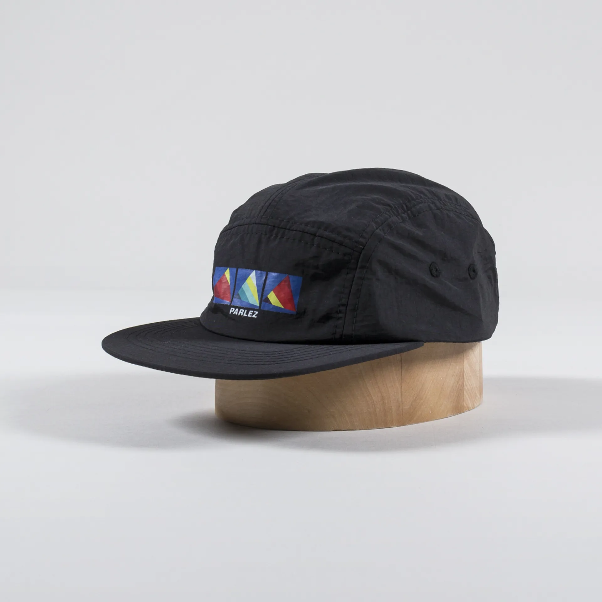 A five panel cap from Parlez made from a nylon taffeta with an adjustable strap and a graphic logo print.