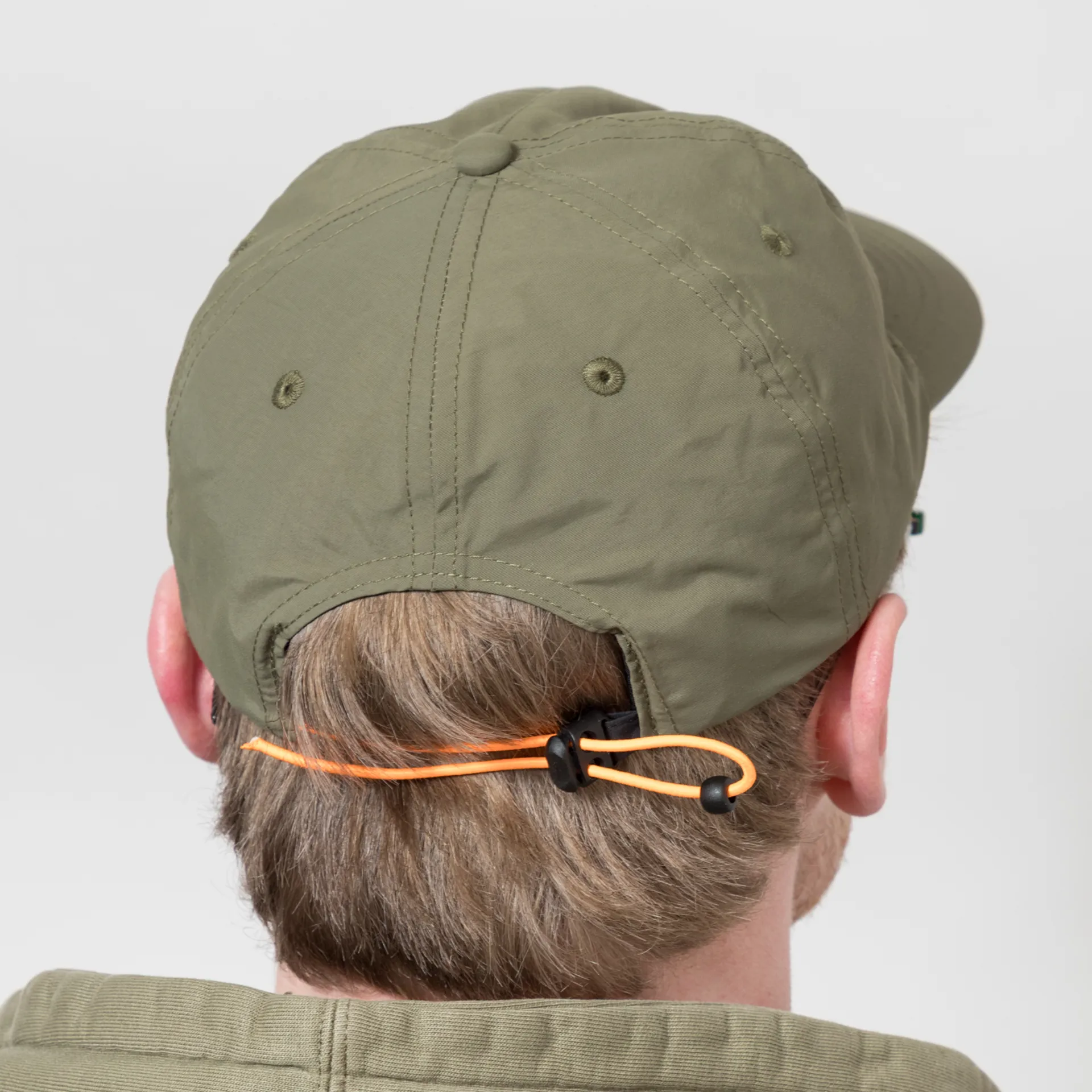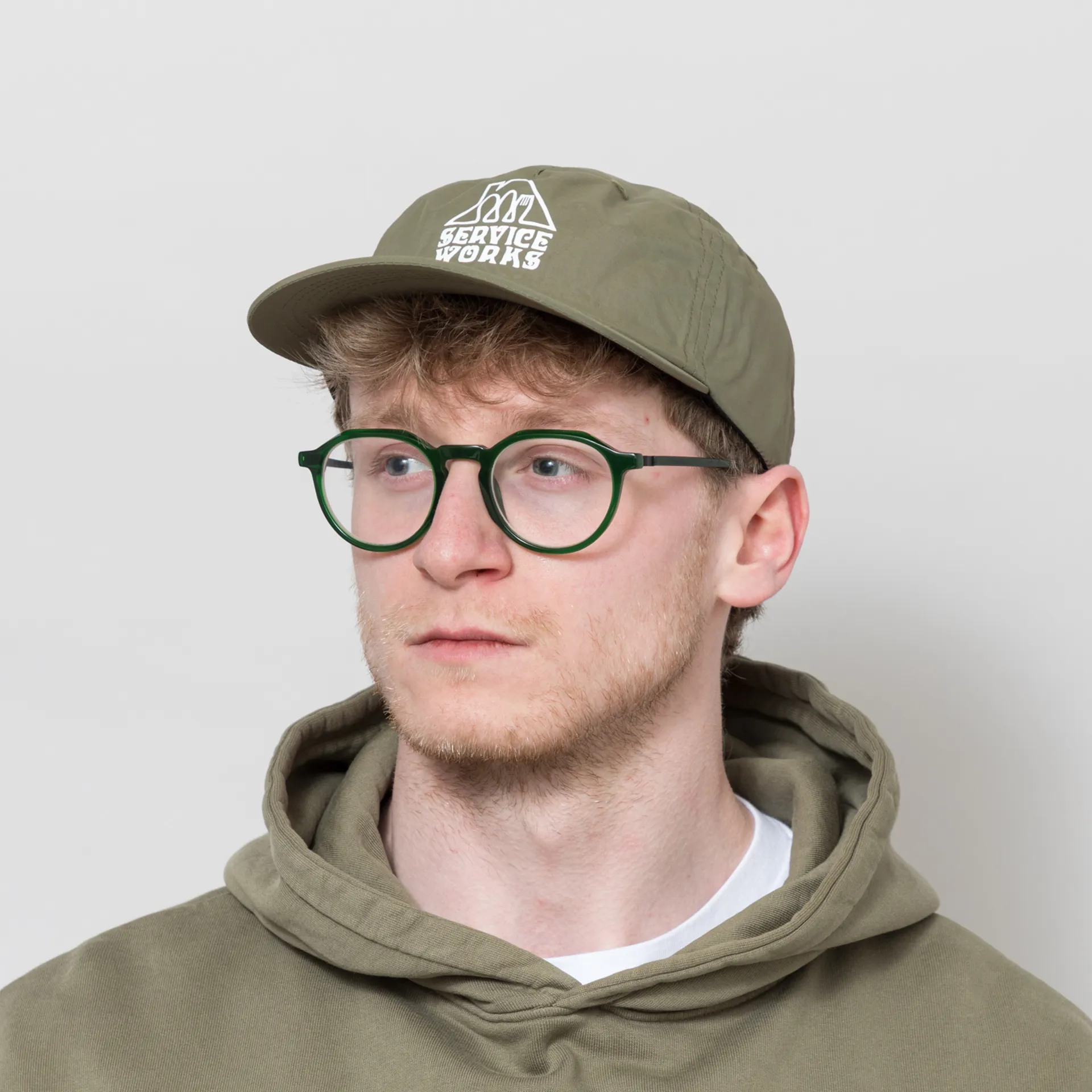 A six-panel from Service Works, constructed from durable nylon with embroidered eyelets throughout. It features a firm, slightly curved brim, an adjustable cord at the back and a printed logo to the front.