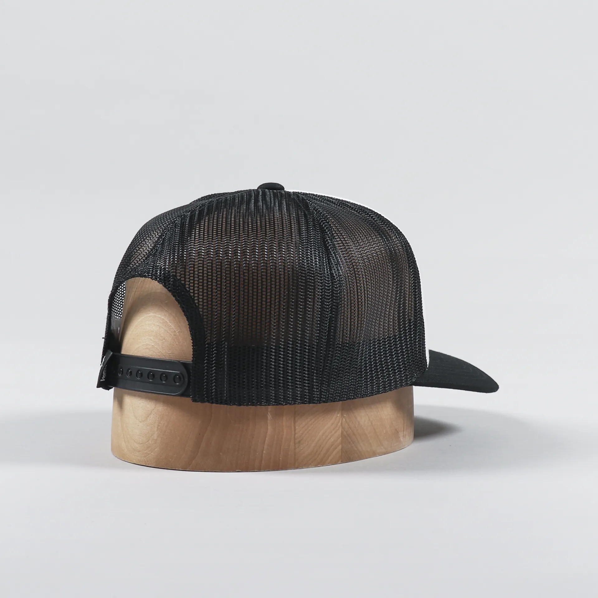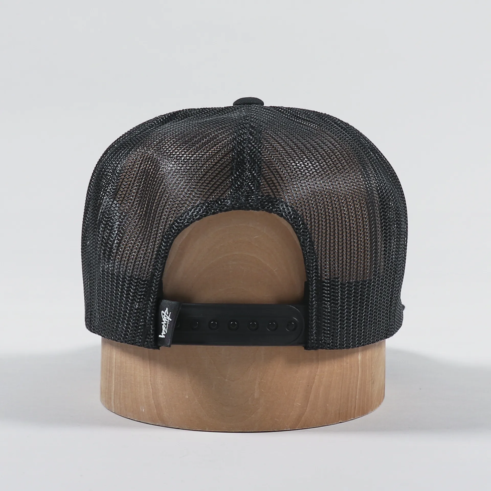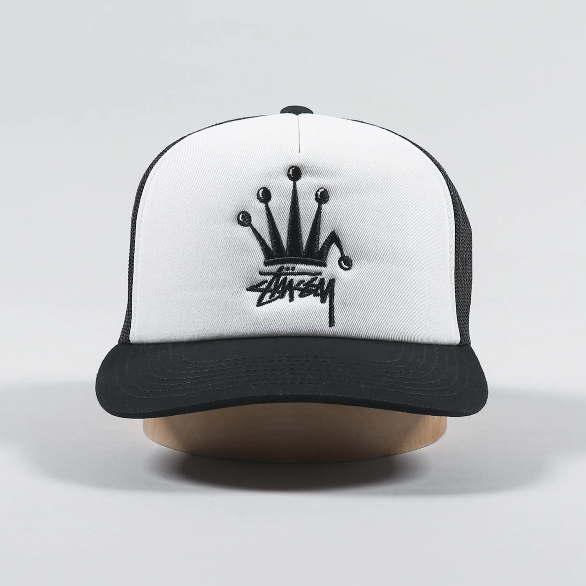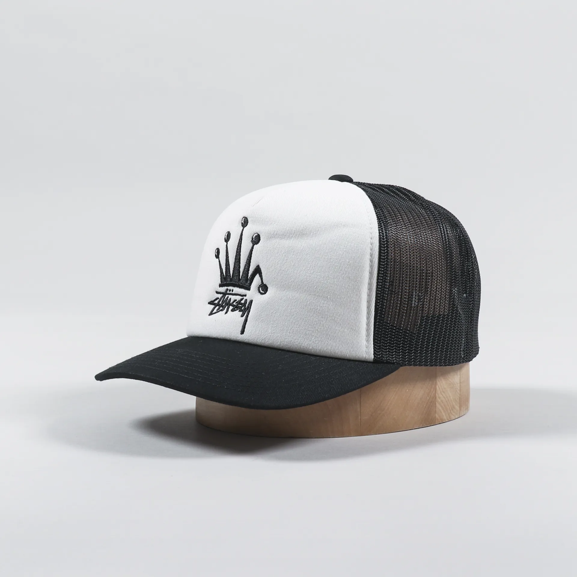 A trucker hat from Stussy made from a padded twill front and nylon mesh back, with a size adjuster and embroidered branding to the front.
