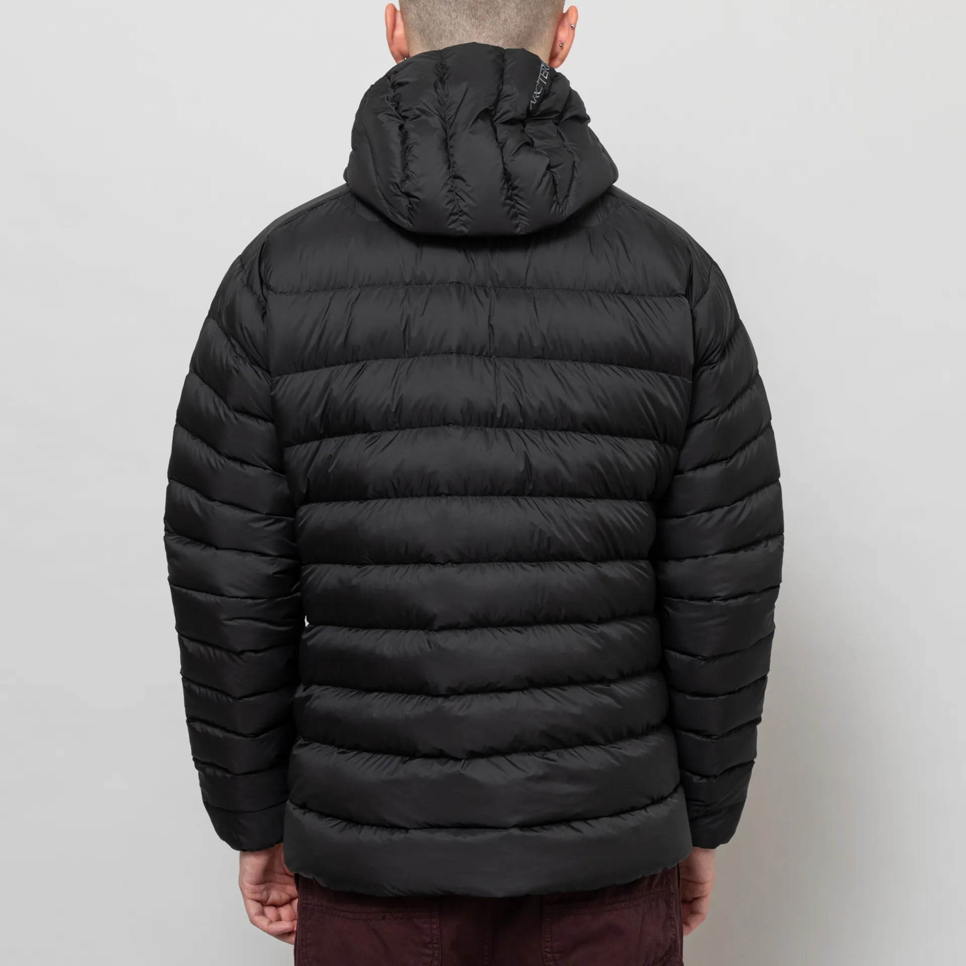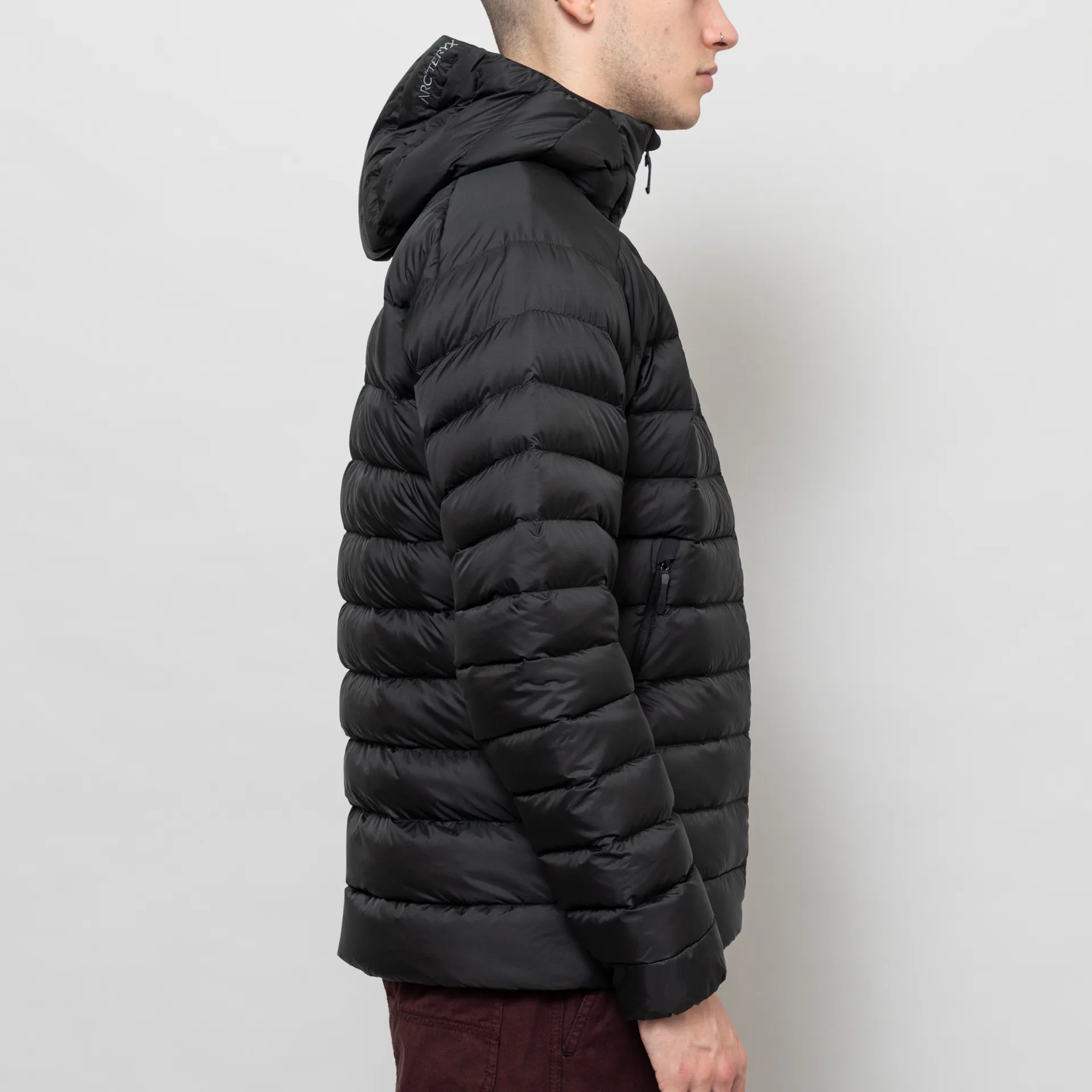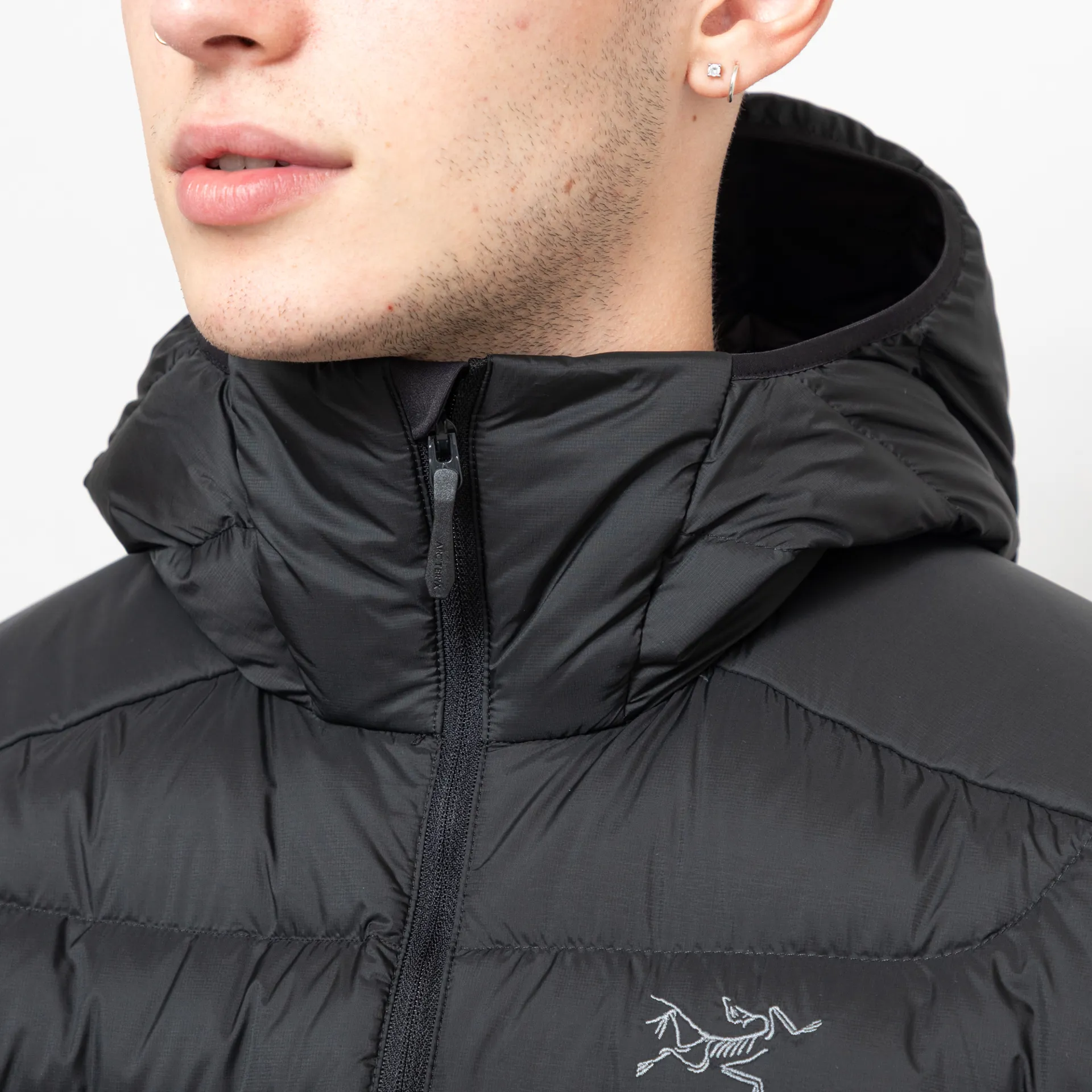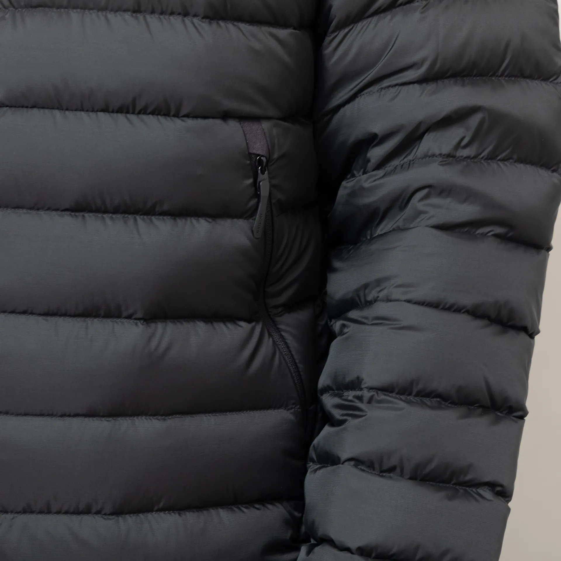 The Cerium Hoody, formerly known as the Cerium LT Hoody, is a lightweight down jacket built for cold, dry conditions. It uses 850 fill-power responsibly sourced goose down for warmth, with synthetic Coreloft insulation in areas that tend to get damp - like the cuffs and underarms. The outer shell is made from recycled 15D Arato nylon and treated with a PFC-free DWR finish to shed light moisture. It’s not waterproof, but it handles wind and dry cold really well.