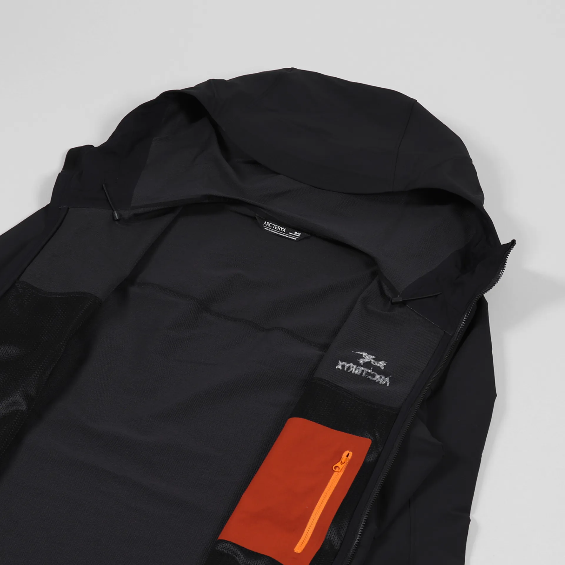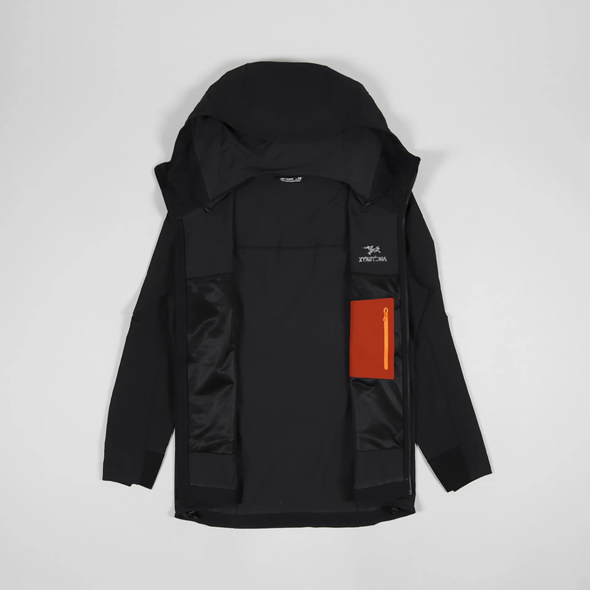 A lightweight technical jacket from Canadian outerwear company Acr'teryx, made from a weather-resistant Wee Burly Double Weave shell of 56% nylon, 34% polyester and 10% elastane with a NU water-repellent treatment.