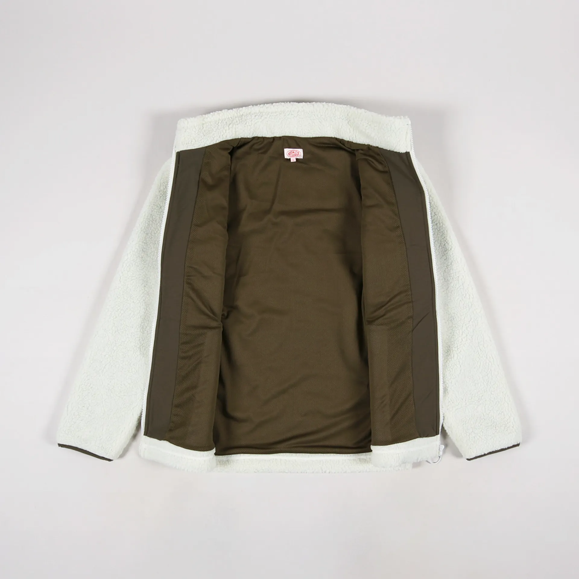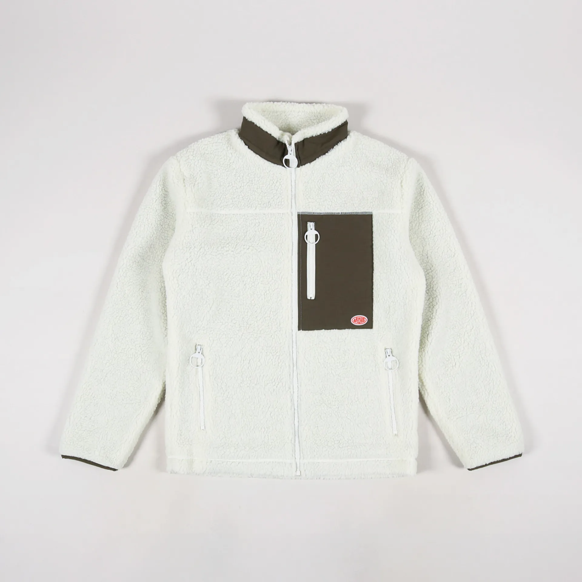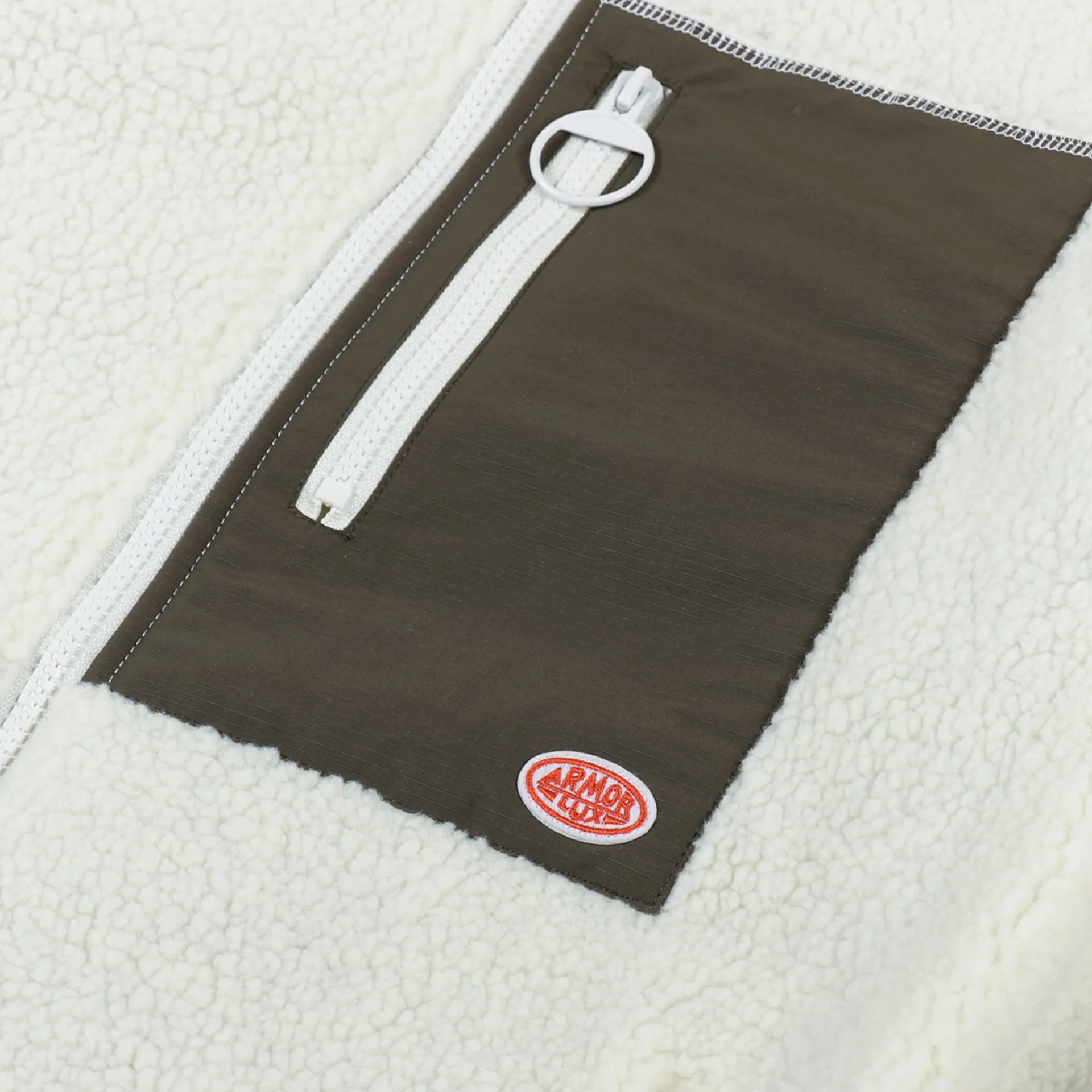 A fleece from France's Armor Lux made from a 100% polyester with a sherpa shell and a comfortable mesh lining. it has a full-zip front, an elasticated hem and cuffs, zippered handwarmer pockets and a ripstop chest pocket.