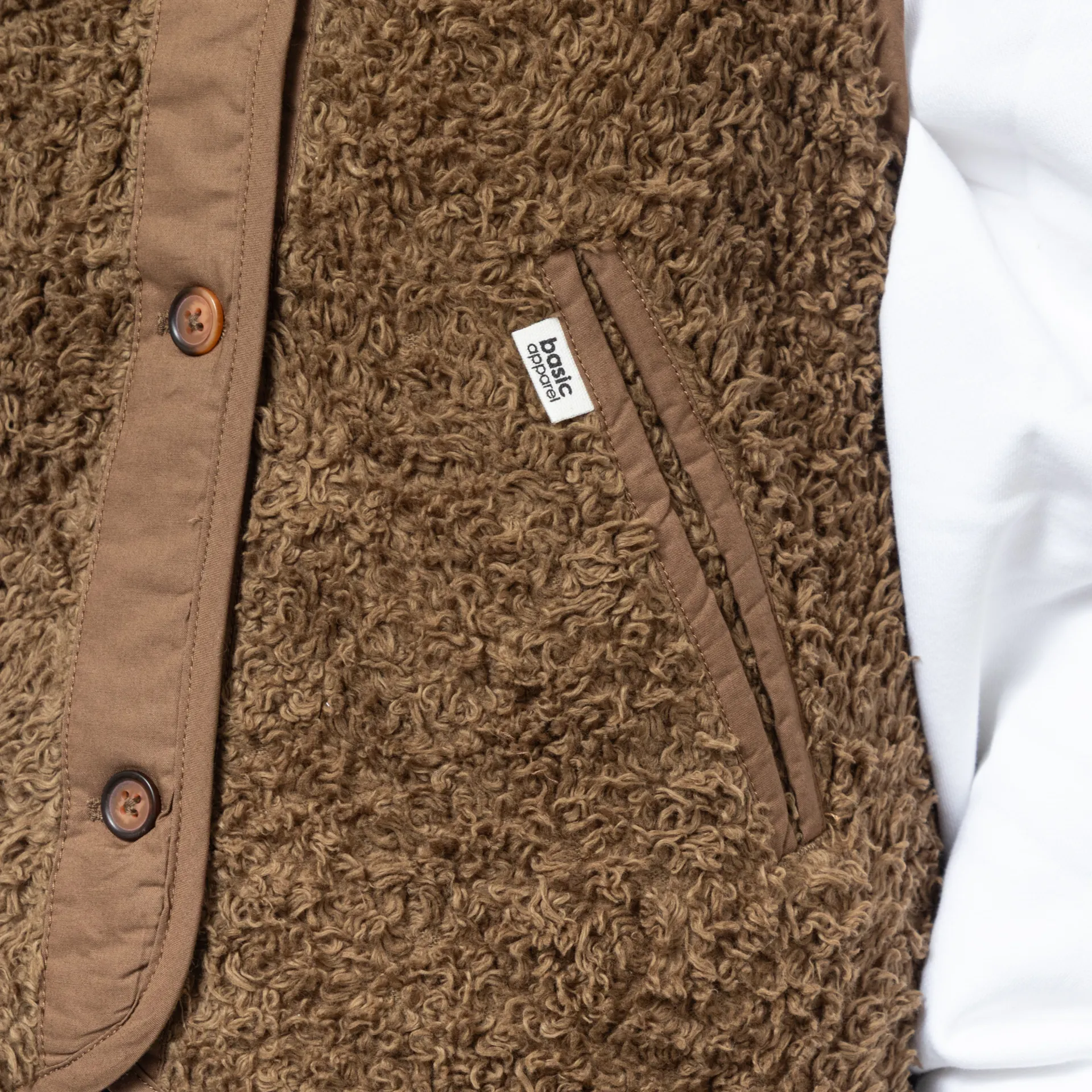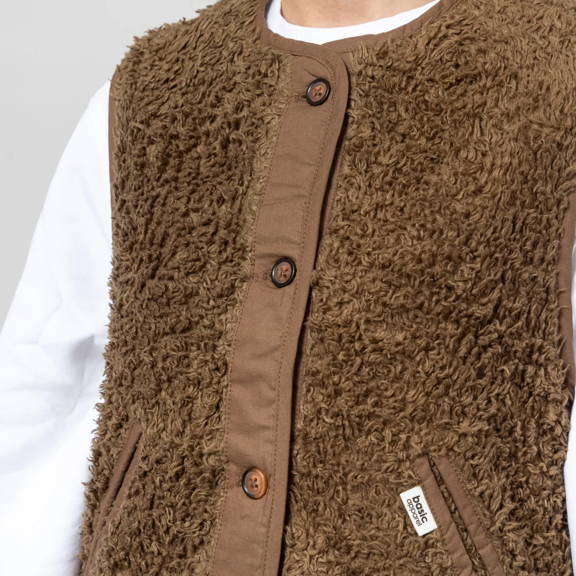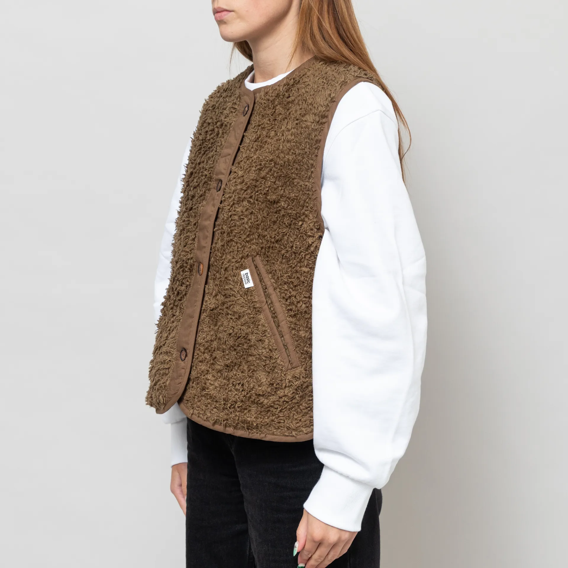 A button-up vest from Basic Apparel, constructed from a cosy cotton fleece blend and cut in a relaxed fit for a casual silhouette. It features tonal binding throughout, with two hand pockets and a Basic Apparel flag label.