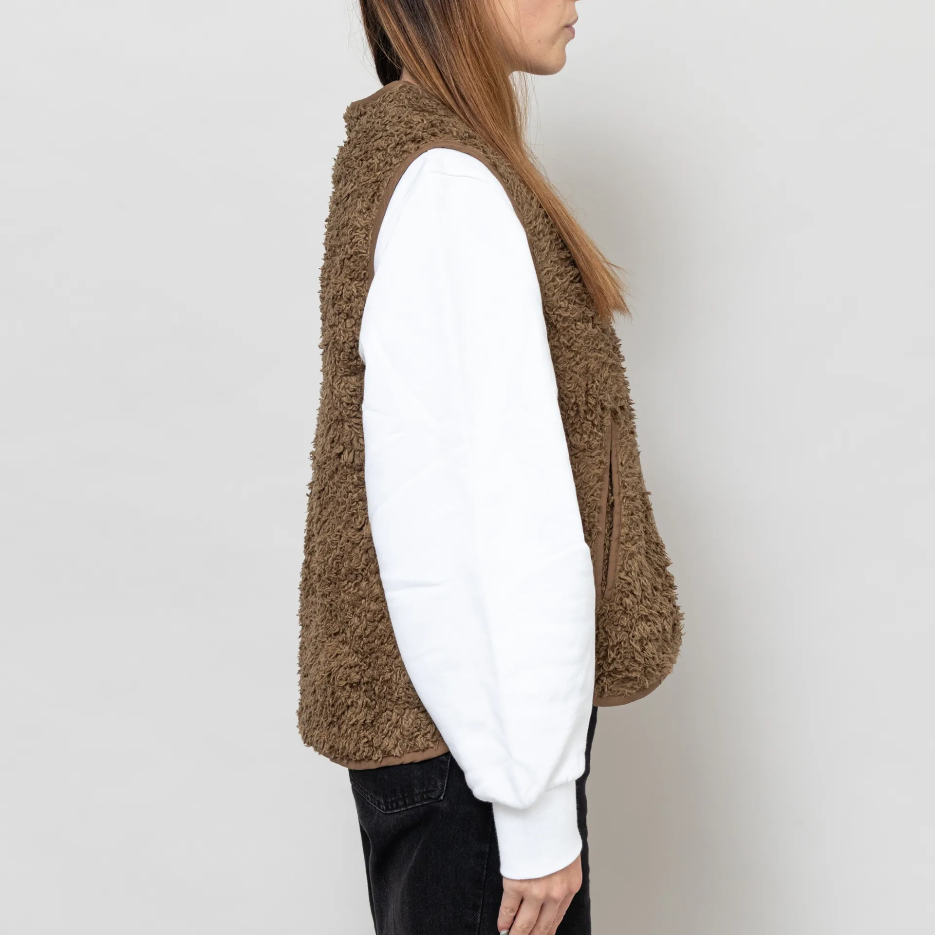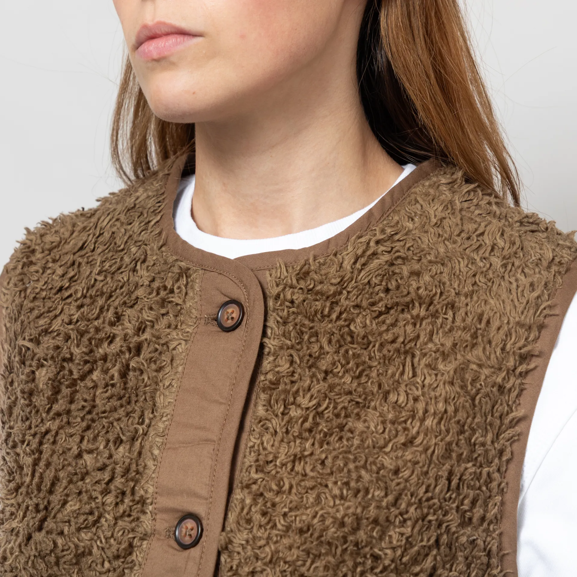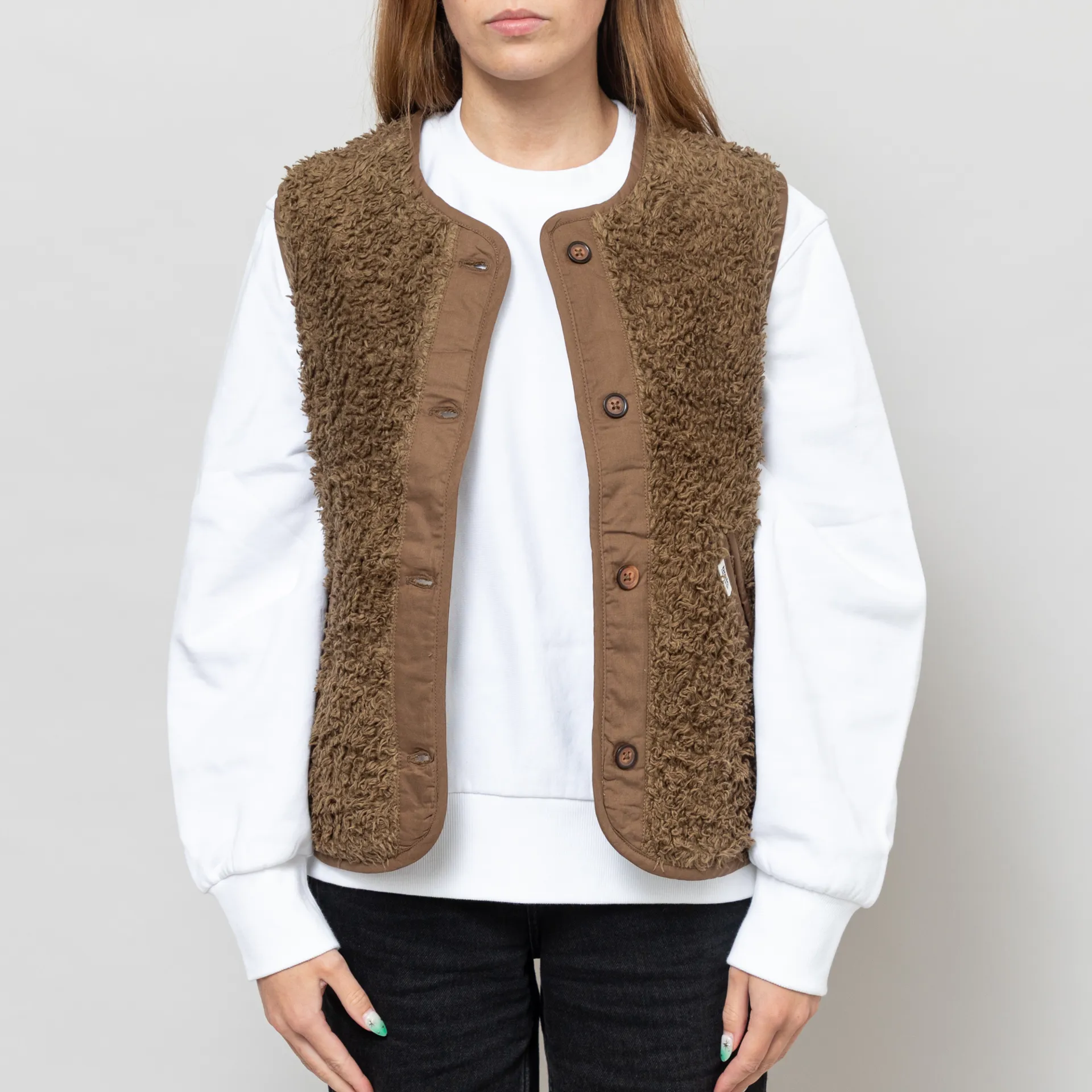 A button-up vest from Basic Apparel, constructed from a cosy cotton fleece blend and cut in a relaxed fit for a casual silhouette. It features tonal binding throughout, with two hand pockets and a Basic Apparel flag label.