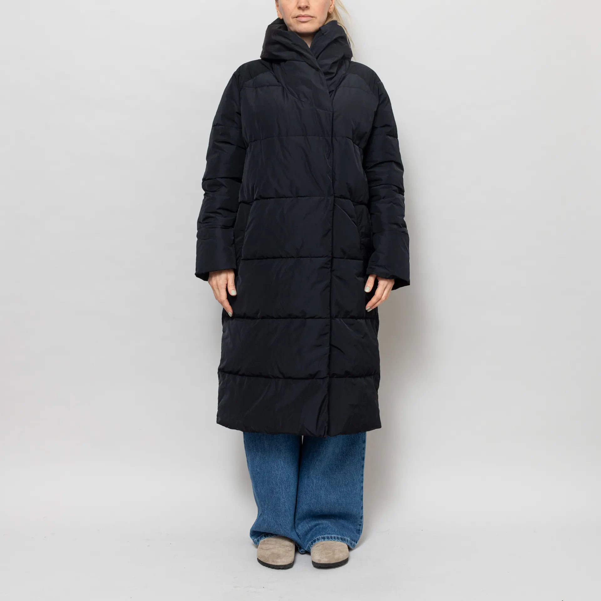 An oversized, super cosy long coat from Basic Apparel, constructed from 100% recycled polyester with a Bionic-Finish Eco coating, resulting in a highly wash-resistant and super-hydrophobic surface. It features a zip-through front, covered by the buttoned placket and leading up to a large shawl collar that folds out into a hood. It has two hand pockets on the outside and a single internal chest pocket.