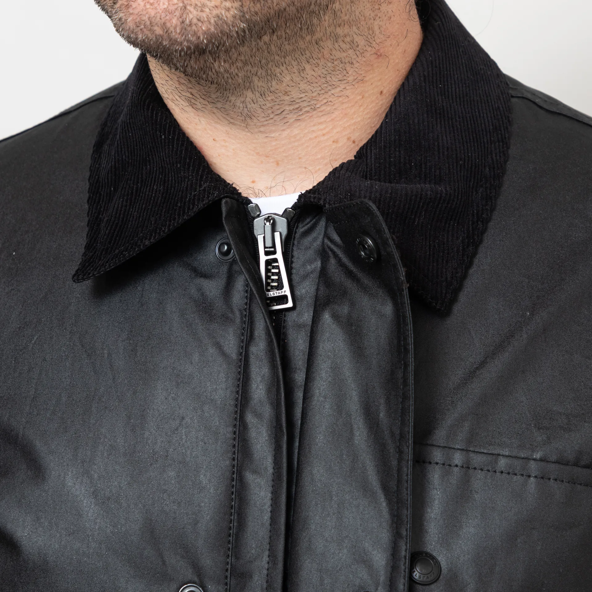 A relaxed fitting, waxed jacket from Belstaff, treated with a water-repellent coating for protection against light showers. It features a full zip-through front, hidden by the snap closure placket and leading up to a snap throat latch for wind protection and a contrasting corduroy collar, for a touch of heritage. The jacket is lined with a soft checkered cotton and boasts functionality with three large pockets across the front and a buttoned pocket to the inside. The design is complete with a woven Belstaff patch to the sleeve.