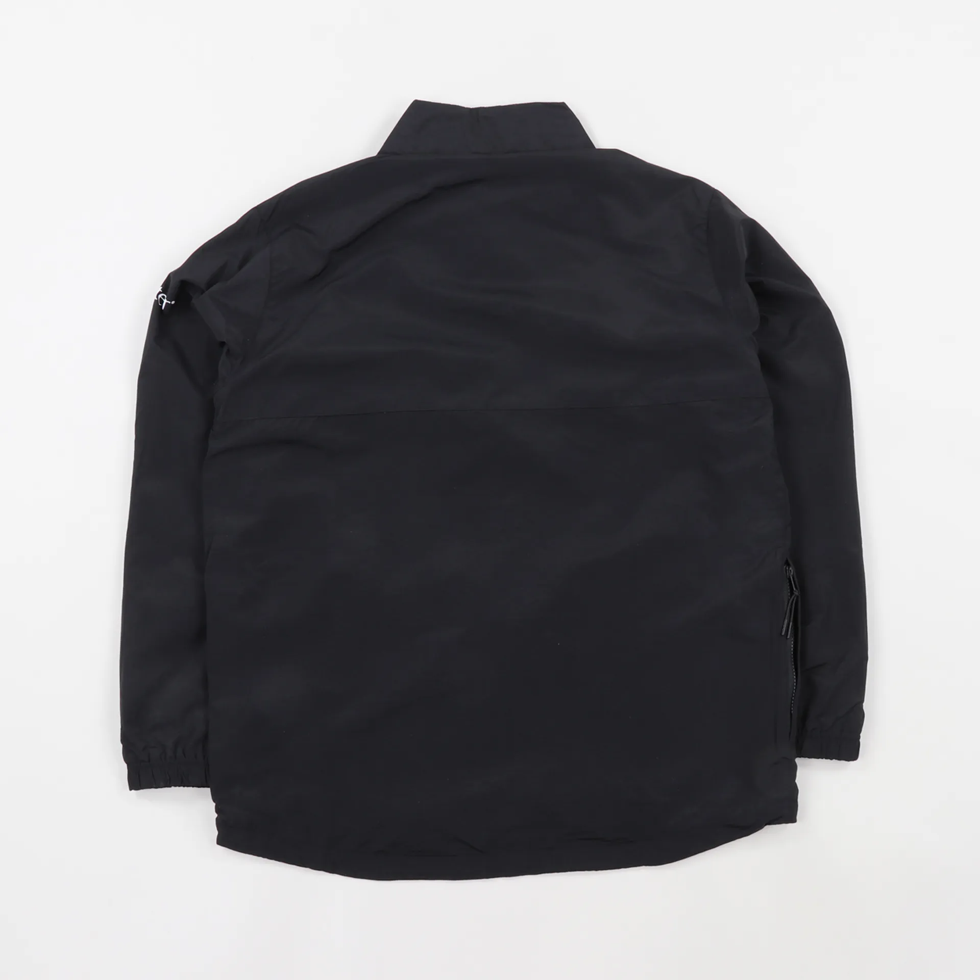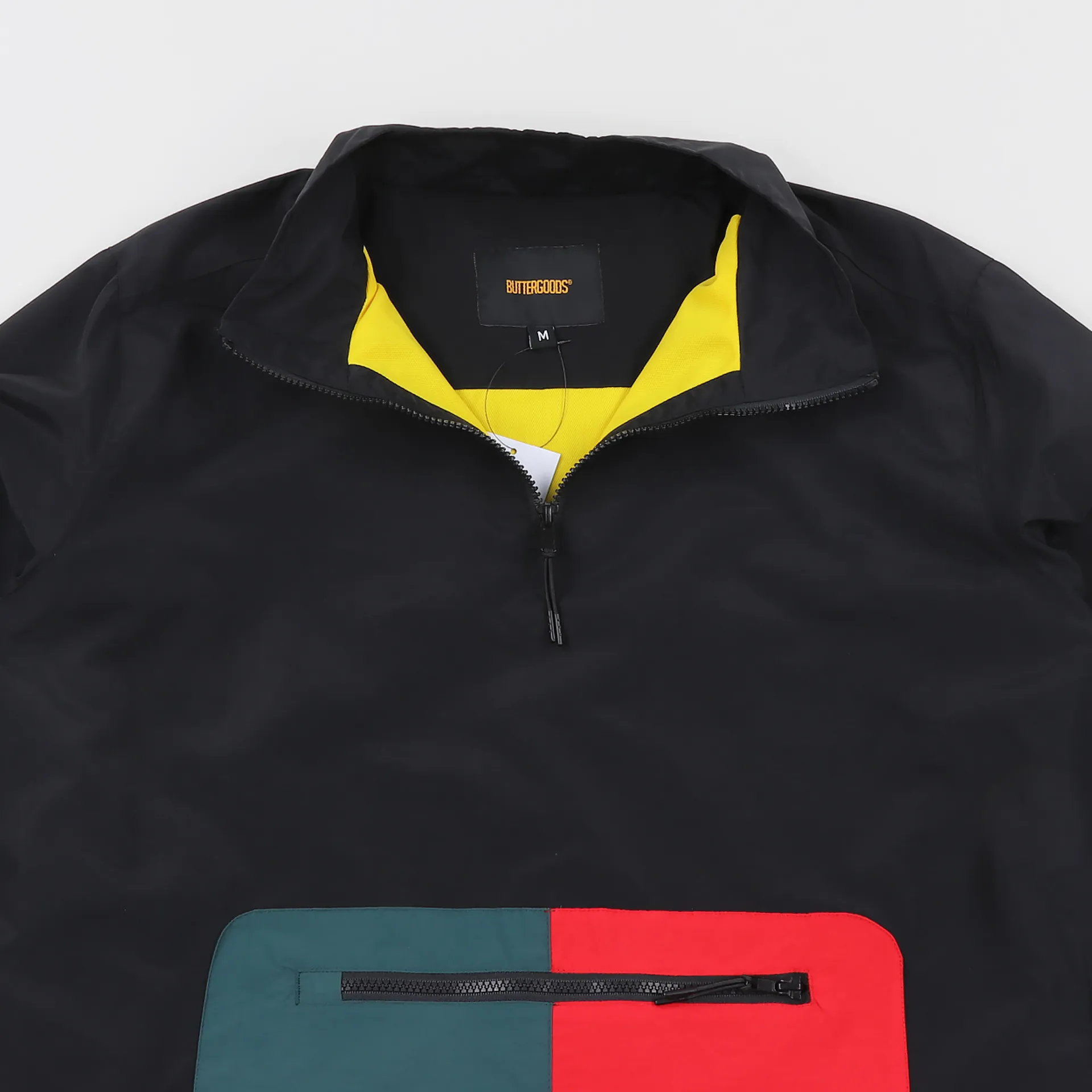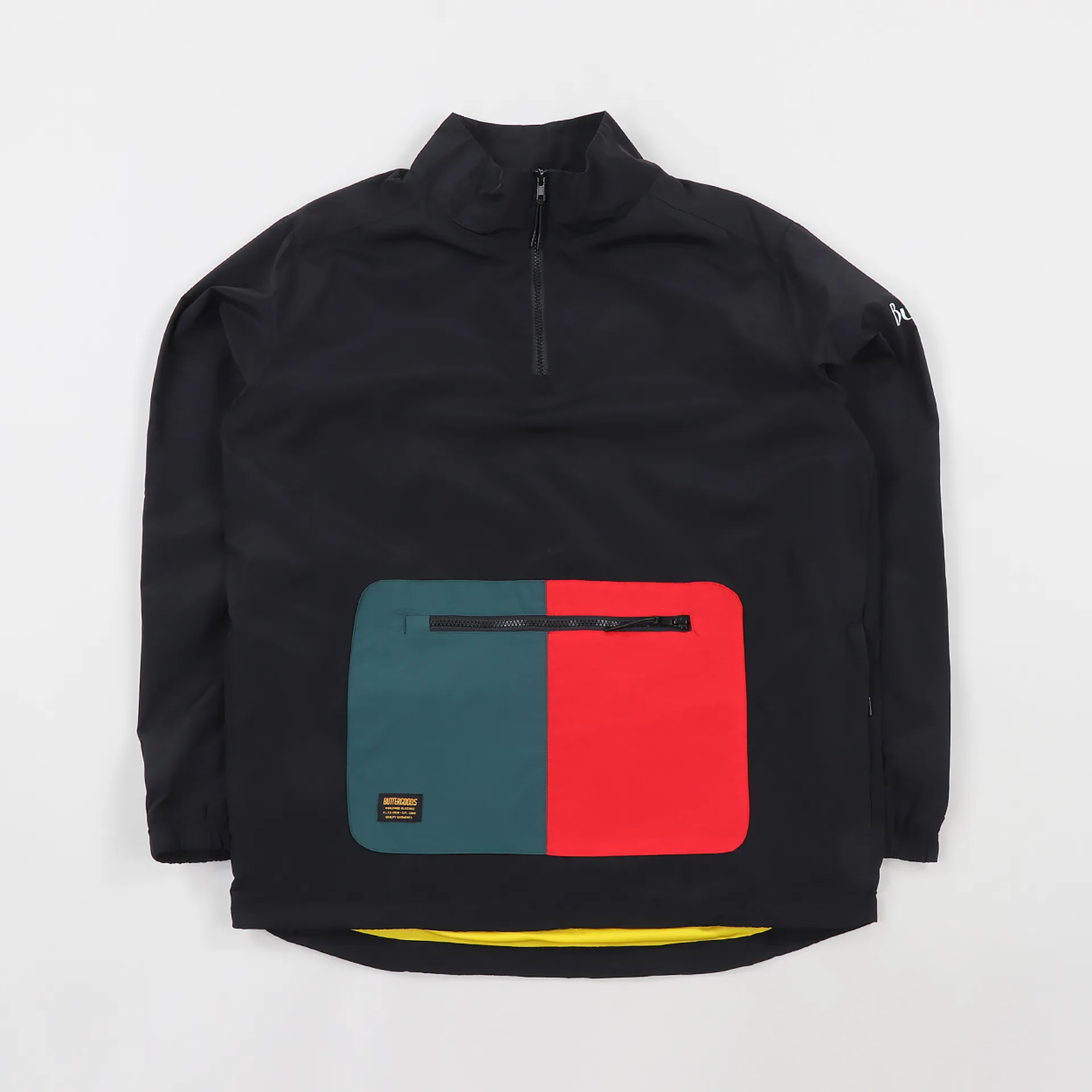 A lightweight jacket from Butter Goods made from 100% nylon with a mesh lining for sportswear protection. Features a 1/4 zip neck, a print to the sleeve and a large zippered pouch.