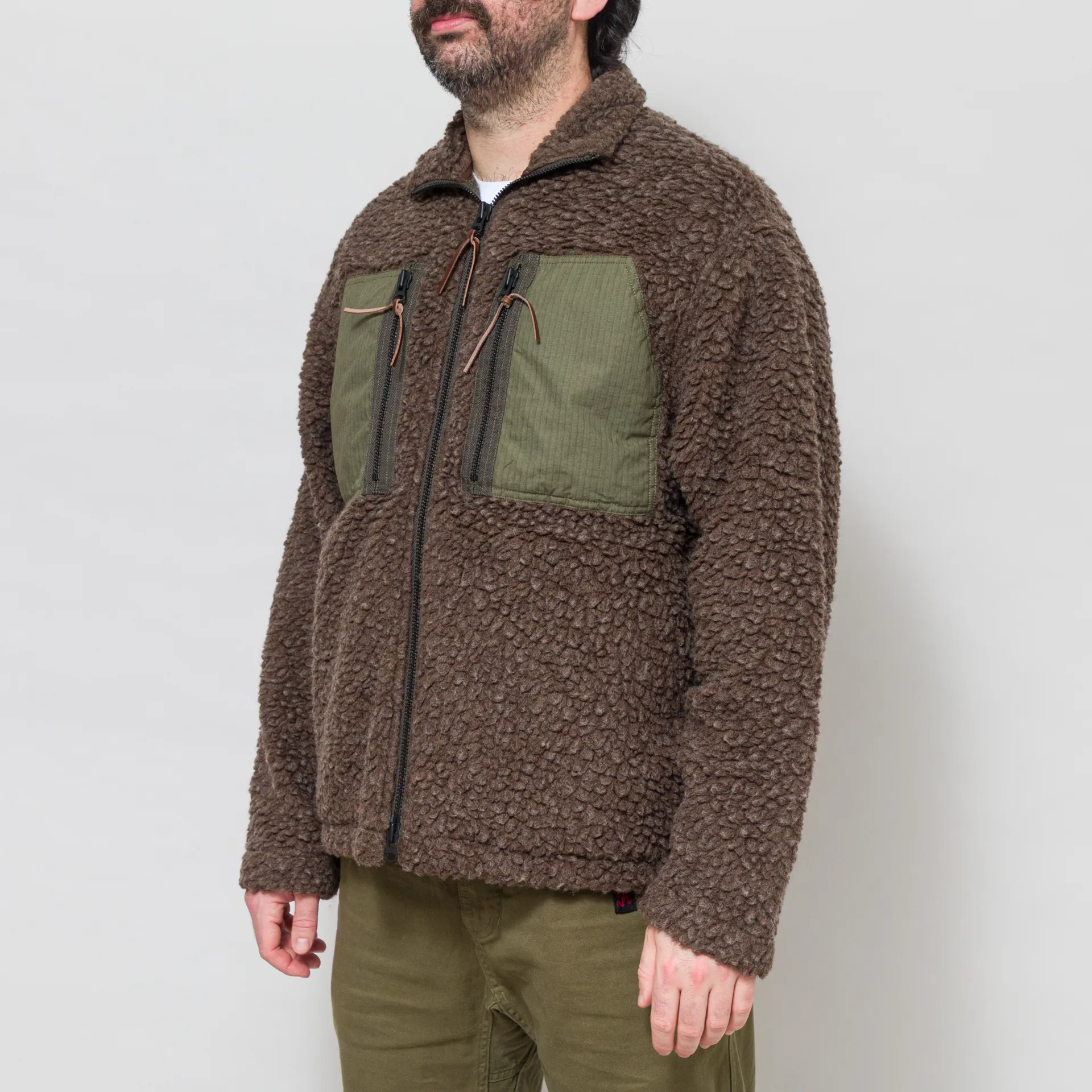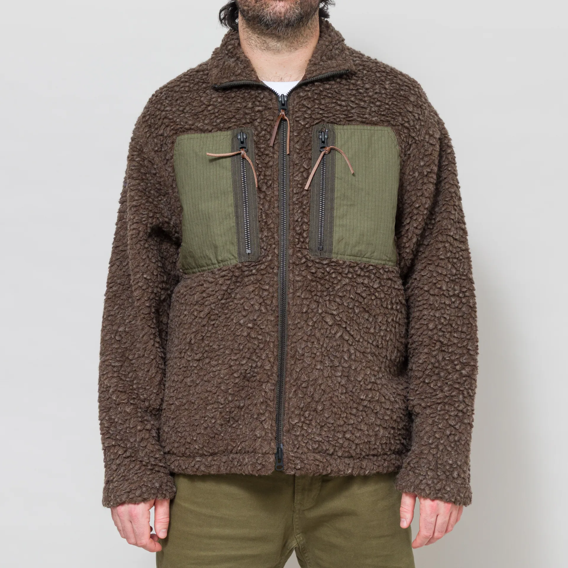 A zip-through fleece from Cafe Mountain, constructed from an Italian virgin wool blend fleece, with natural insulating properties, Japanese cotton ripstop panels and oak bark tanned leather zip pulls. It's cut in a slightly relaxed fit for easy layering and features a full zip-through front, leading to a stand collar that can be folded down into a normal collar. With a classic straight hem, two large chest pockets with contrast panel detailing, two handwarmer pockets, and two internal drop-in pockets for added storage.
