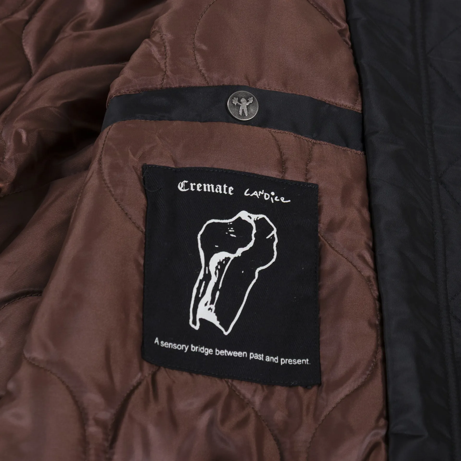 A boxy bomber jacket from the collaboration of CANDICE and Cremate London, constructed with a durable nylon outer and a quilted polyester lining.