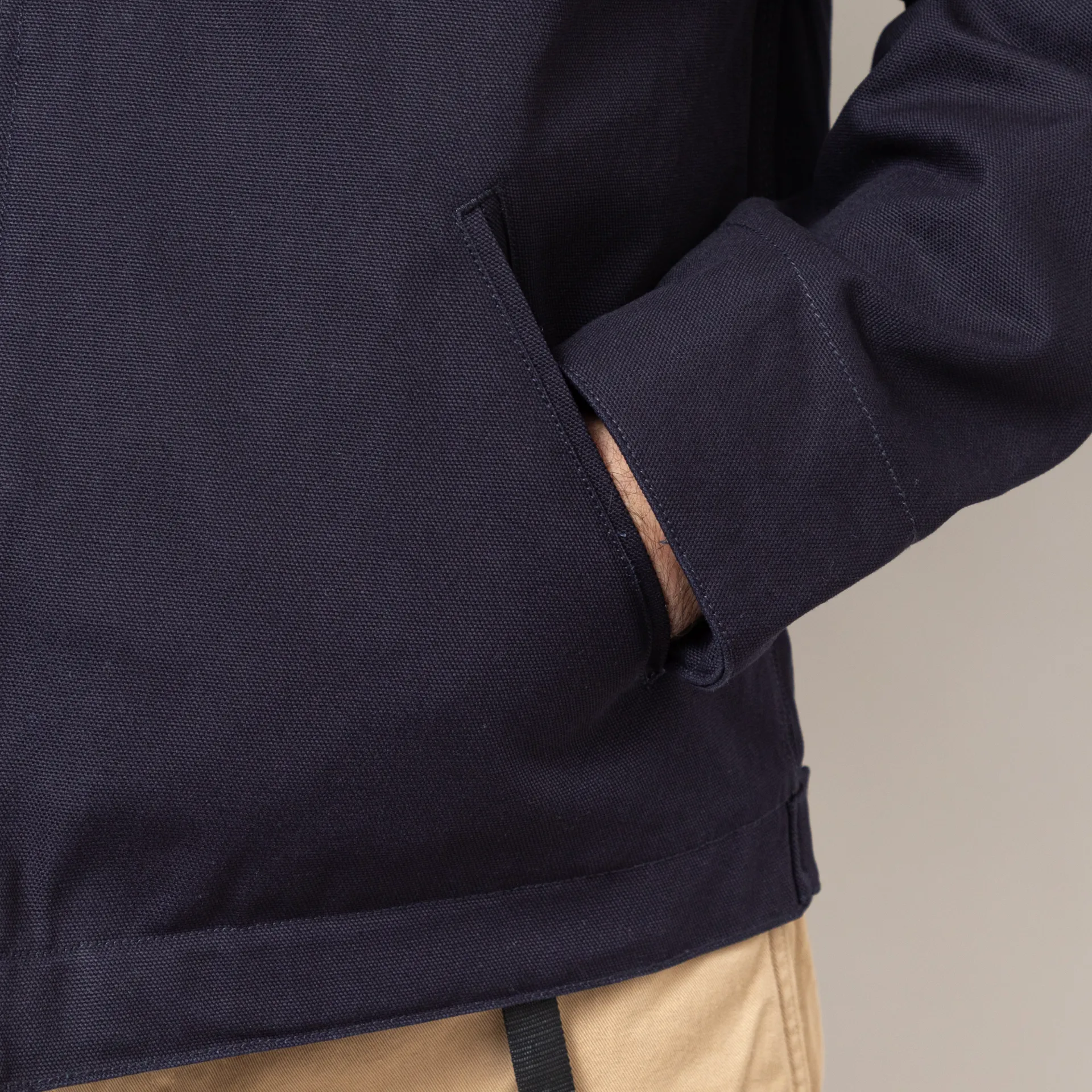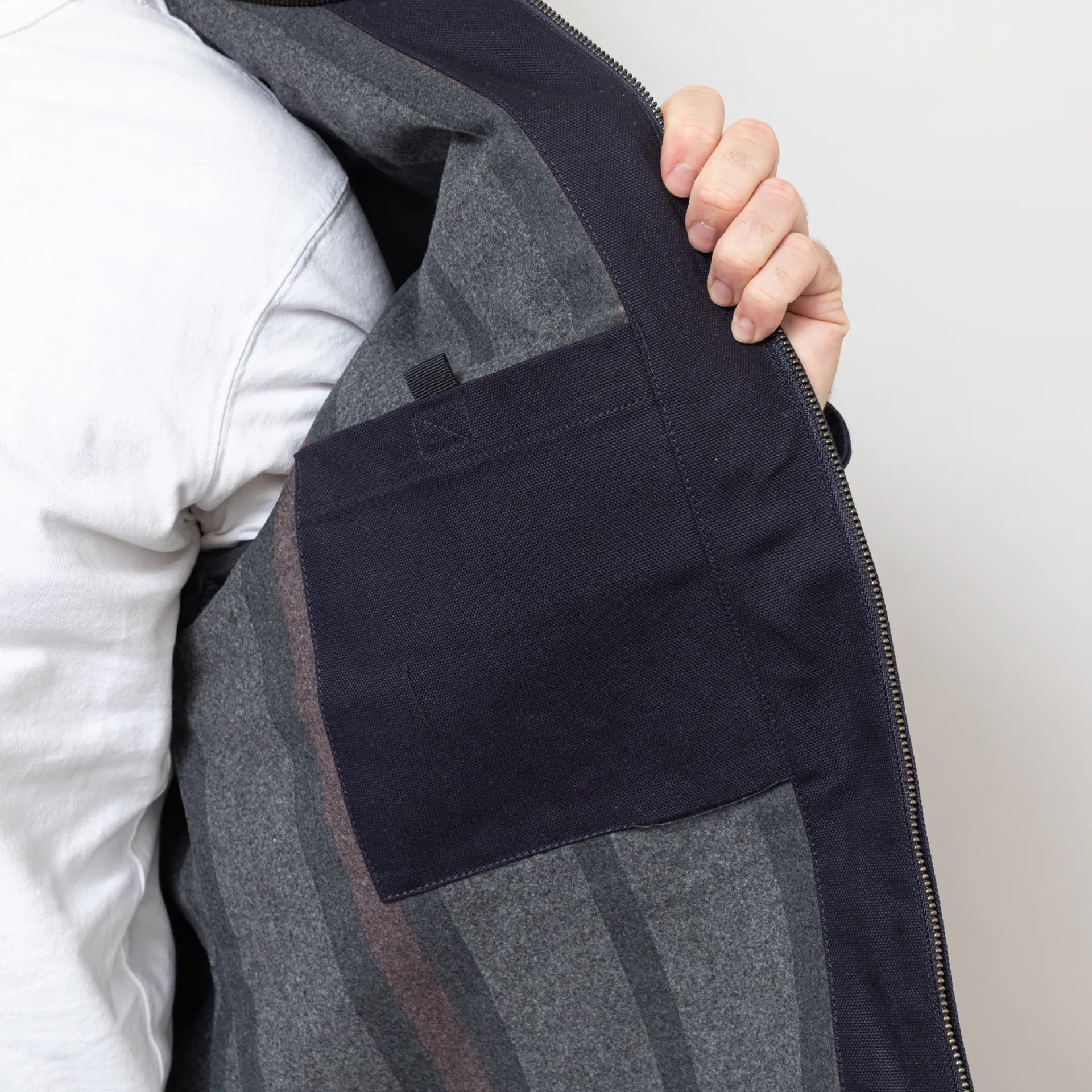 A winter jacket from Carhartt WIP made from a Dearborn cotton canvas shell with a polyester, acrylic and wool-blended blanket lining. It has three external pockets, an internal patch pocket and an adjustable hem and cuffs.
