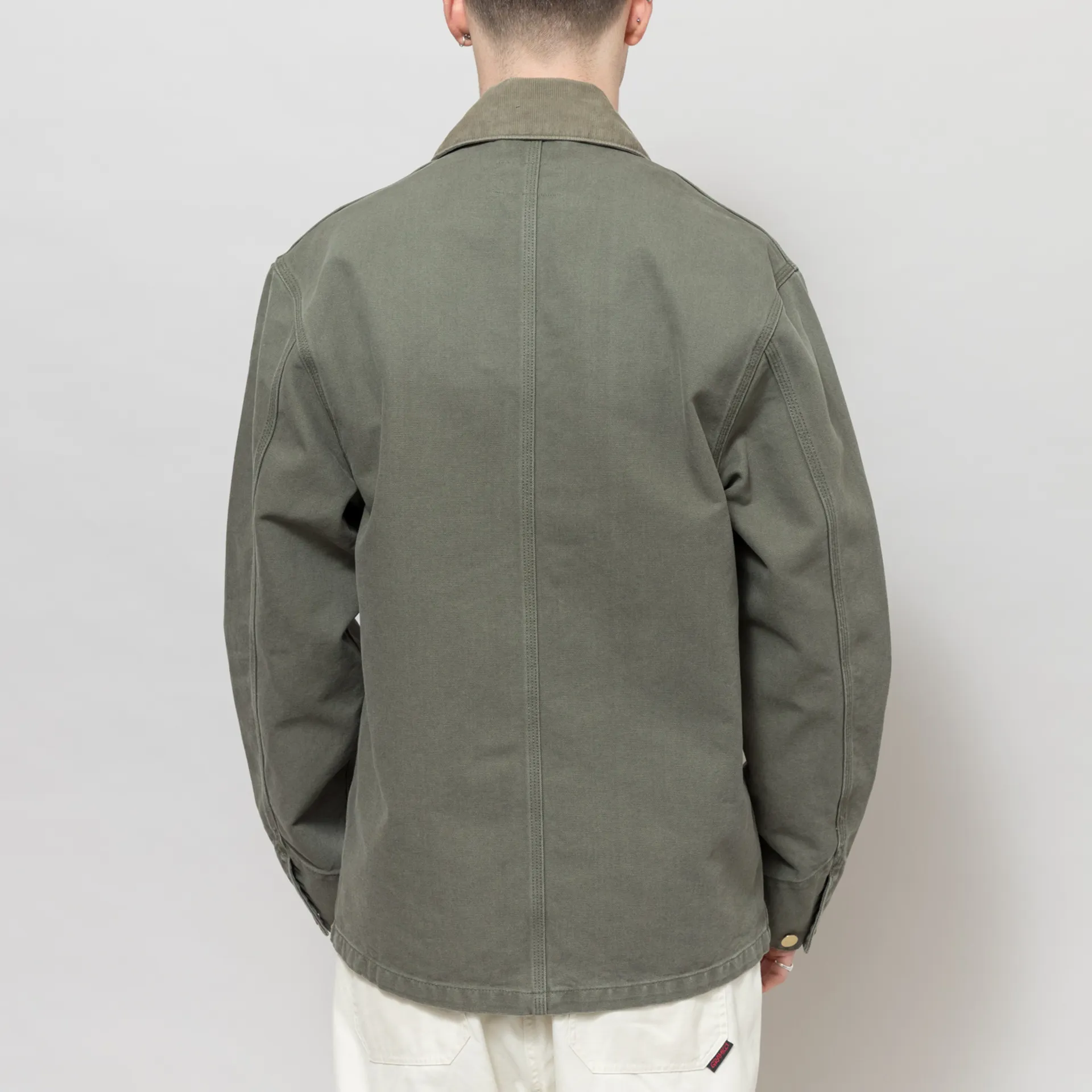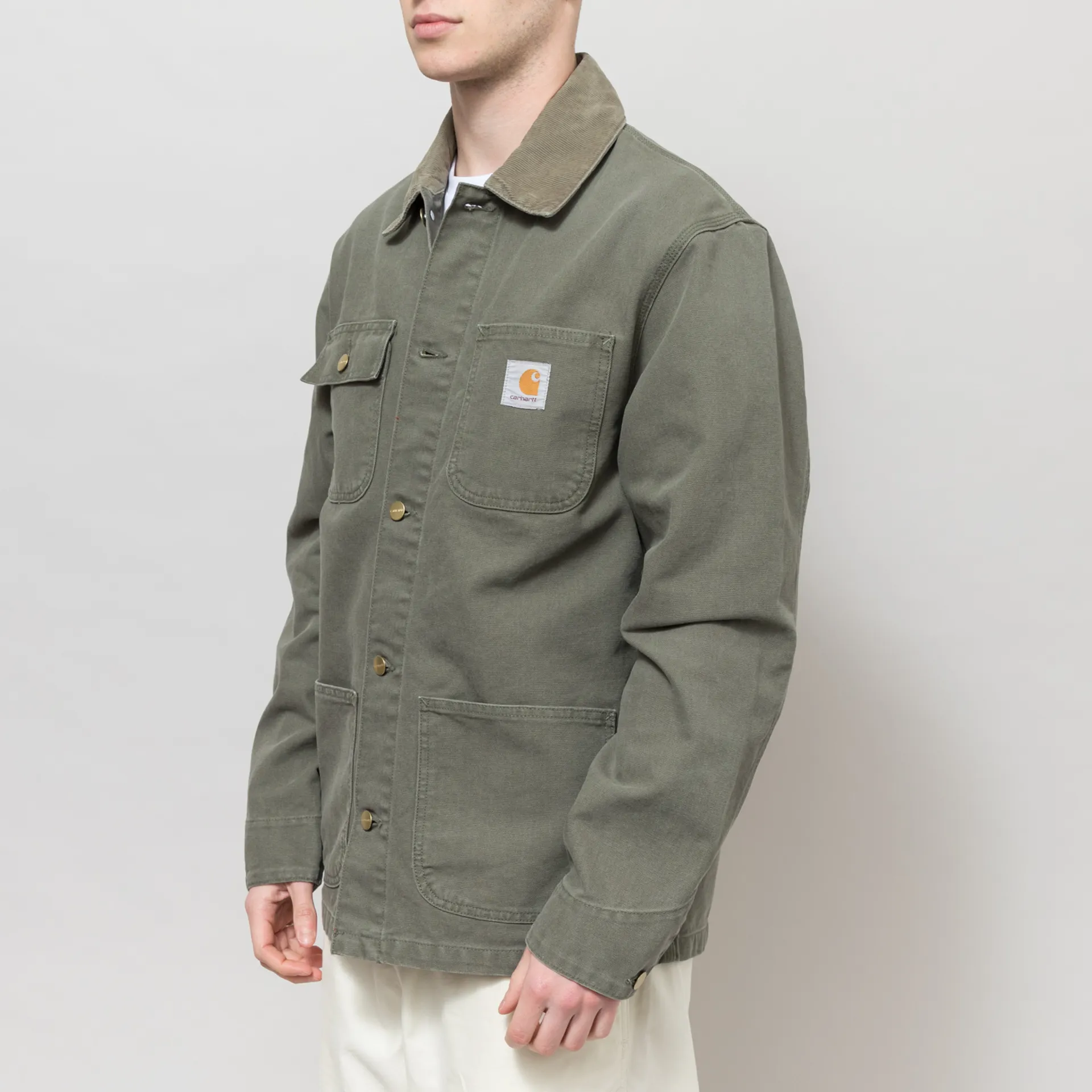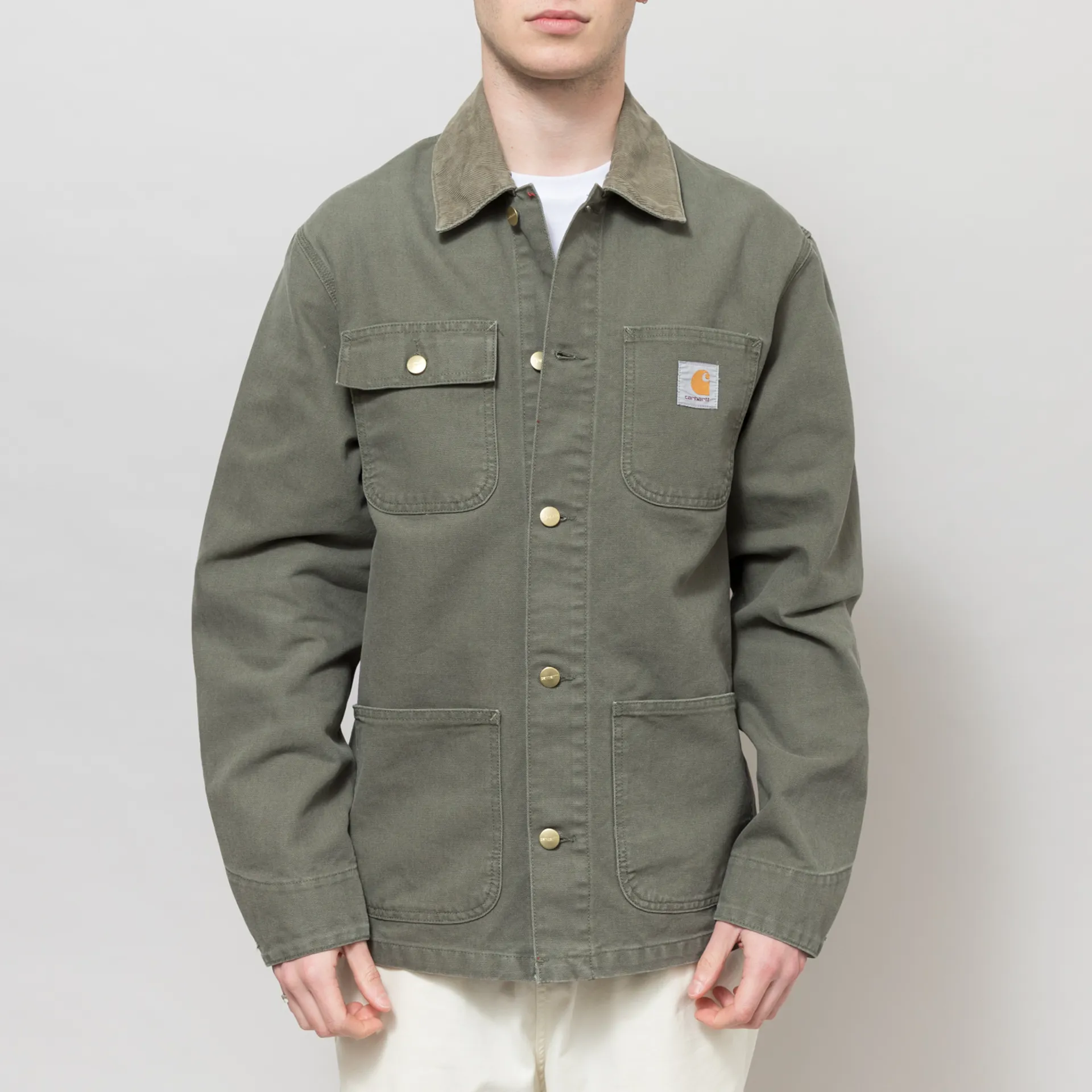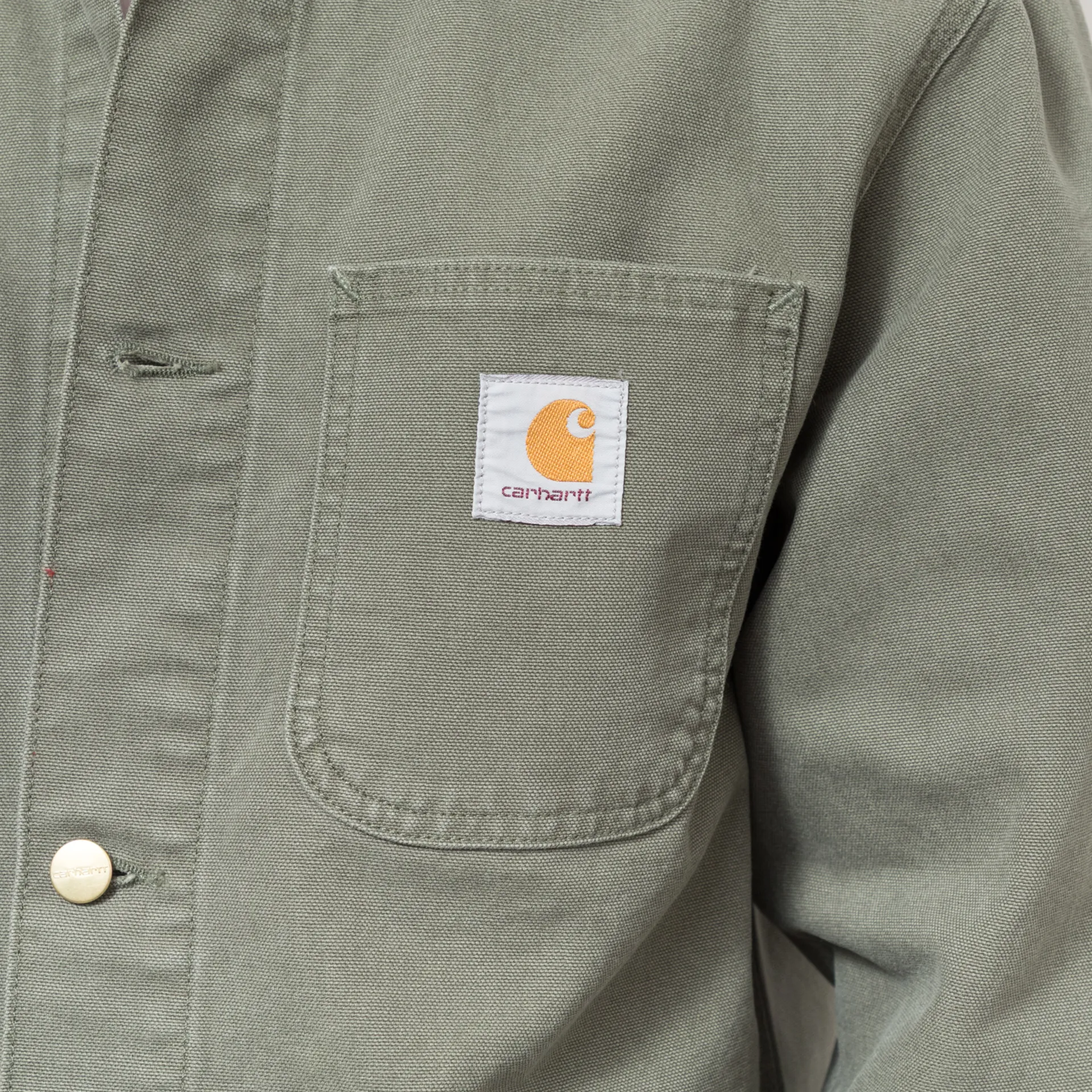 The Michigan Summer Coat from Carhartt WIP is an unlined version of the classic chore coat, made from an outer of 100% cotton 'Dearborn' canvas with a button-up front leading to a corduroy collar, four external patch pockets and one internal, and buttoned cuffs. Branding consists of a woven logo patch to the chest