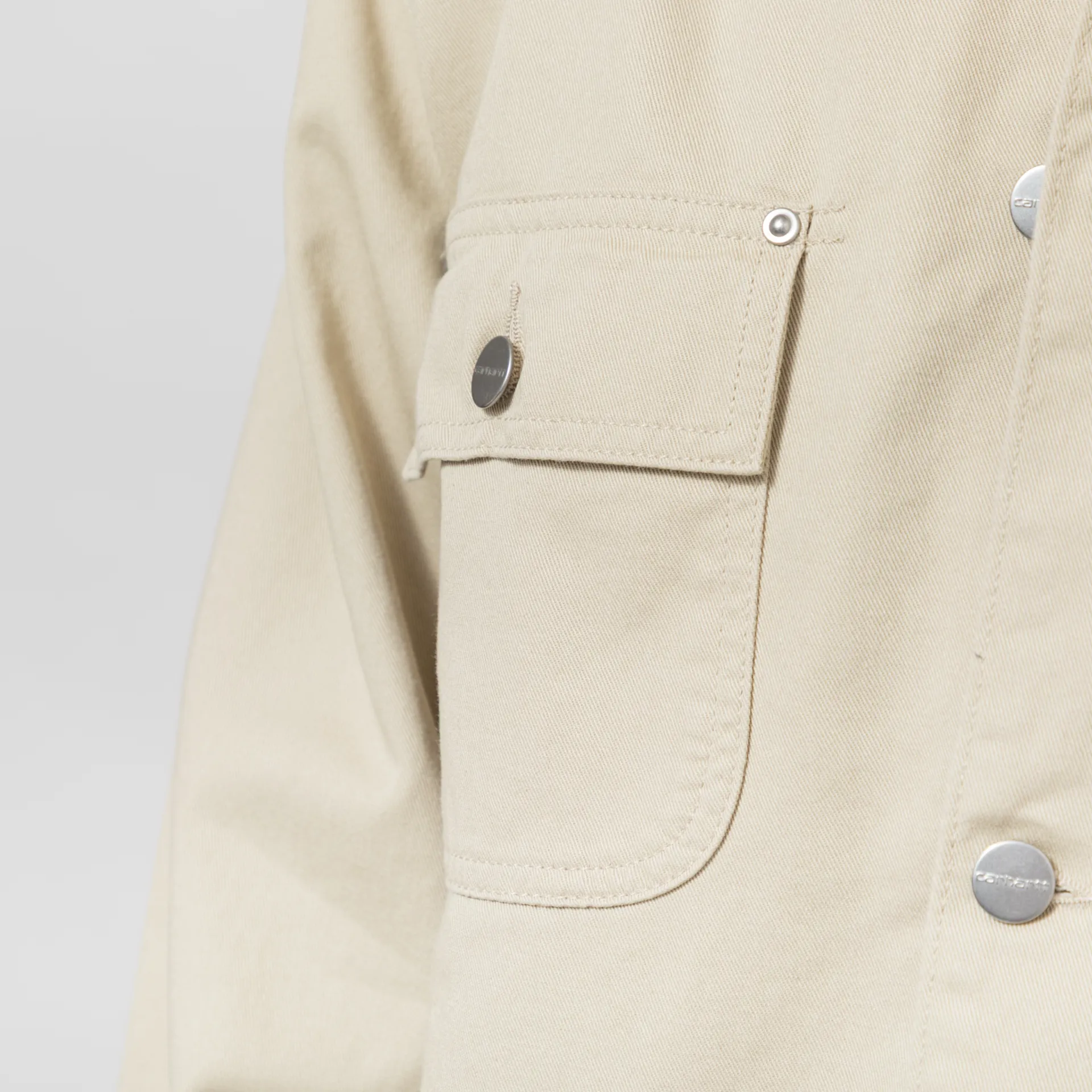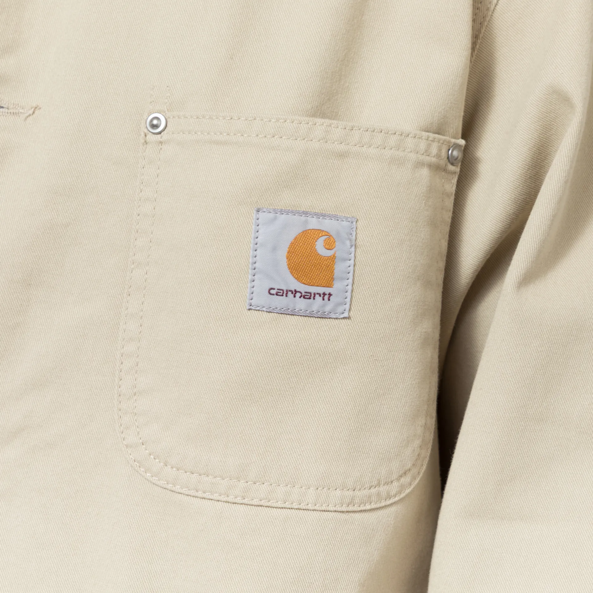 A summer version of the OG Chore Coat from Carhartt WIP, cut in the Original Loose Fit, a little looser and a little boxier. Constructed from heavyweight cotton Dearborn Canvas with a poplin lining in the body and nylon in the sleeves. The jacket has a button-up front leading to a contrasting collar, buttoned cuffs, four patch pockets, and an internal pocket. Branding is simple and traditional for Carhartt, with a woven logo patch to the chest.